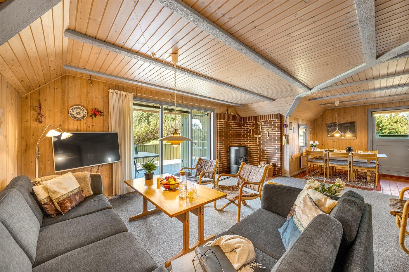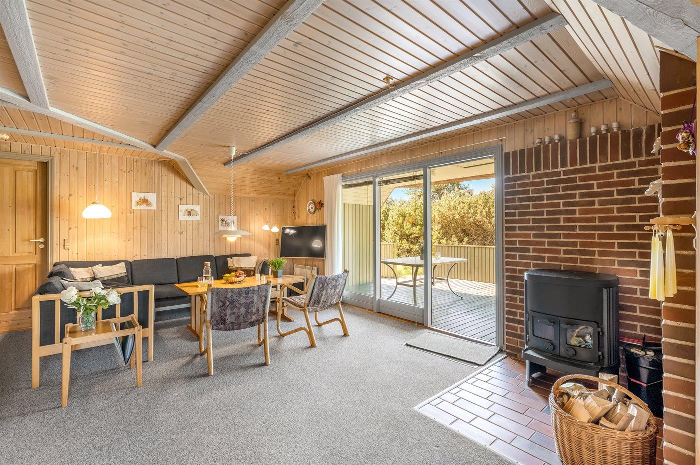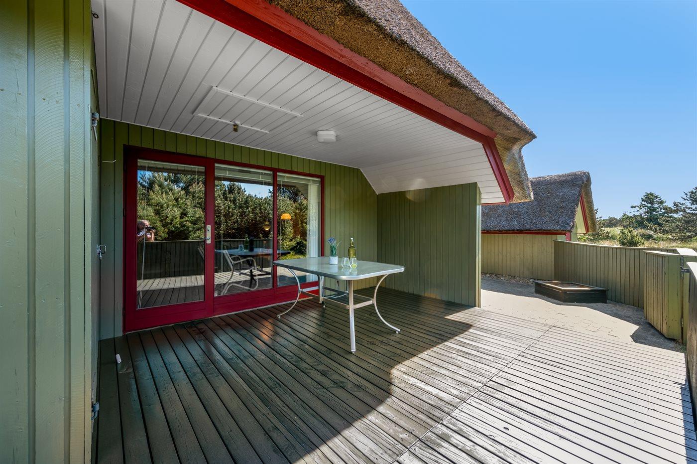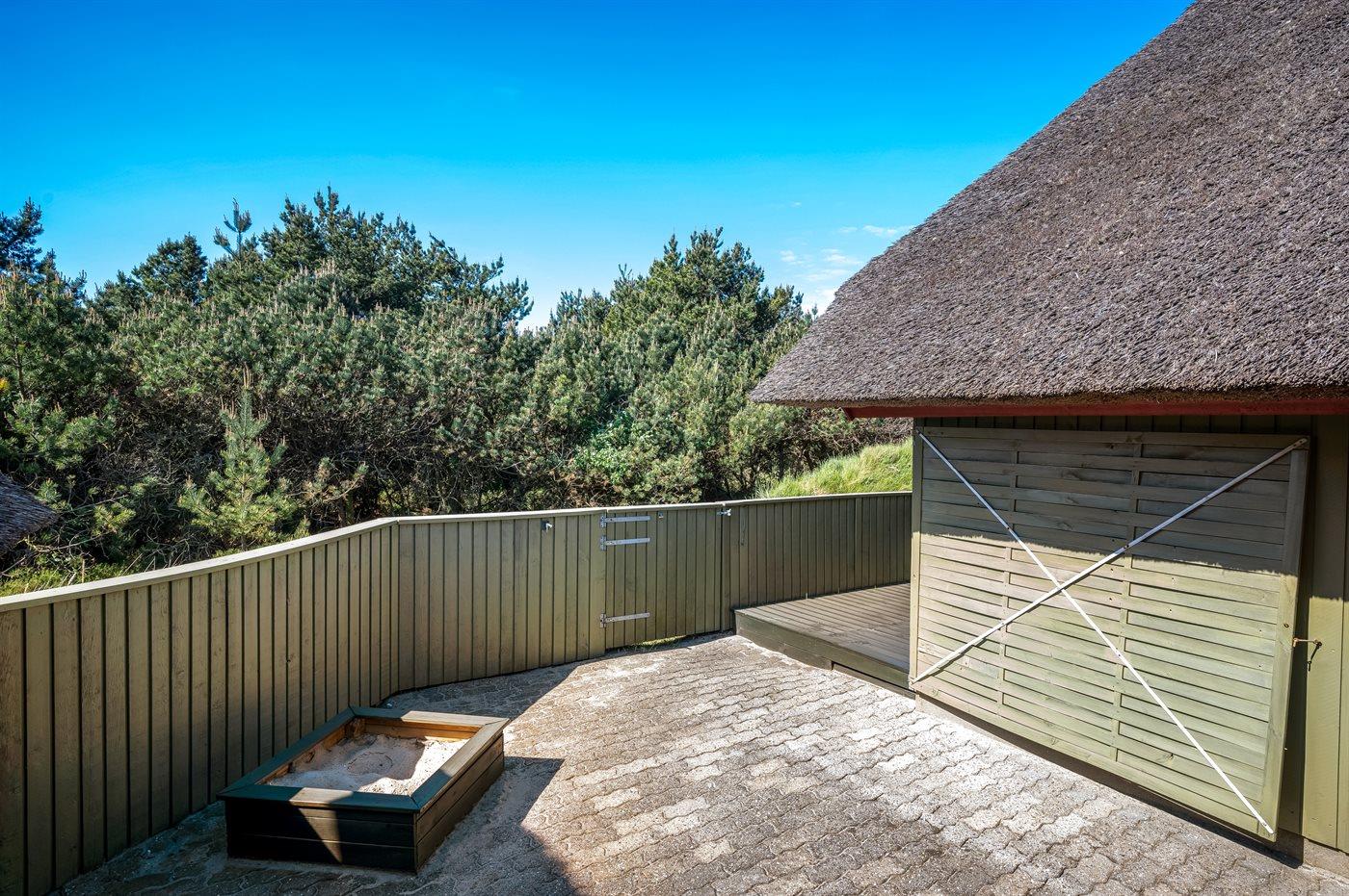 Rummeligt sommerhus i Blåvand med overdækket terrasse, sauna og naturgrund tæt på havet.