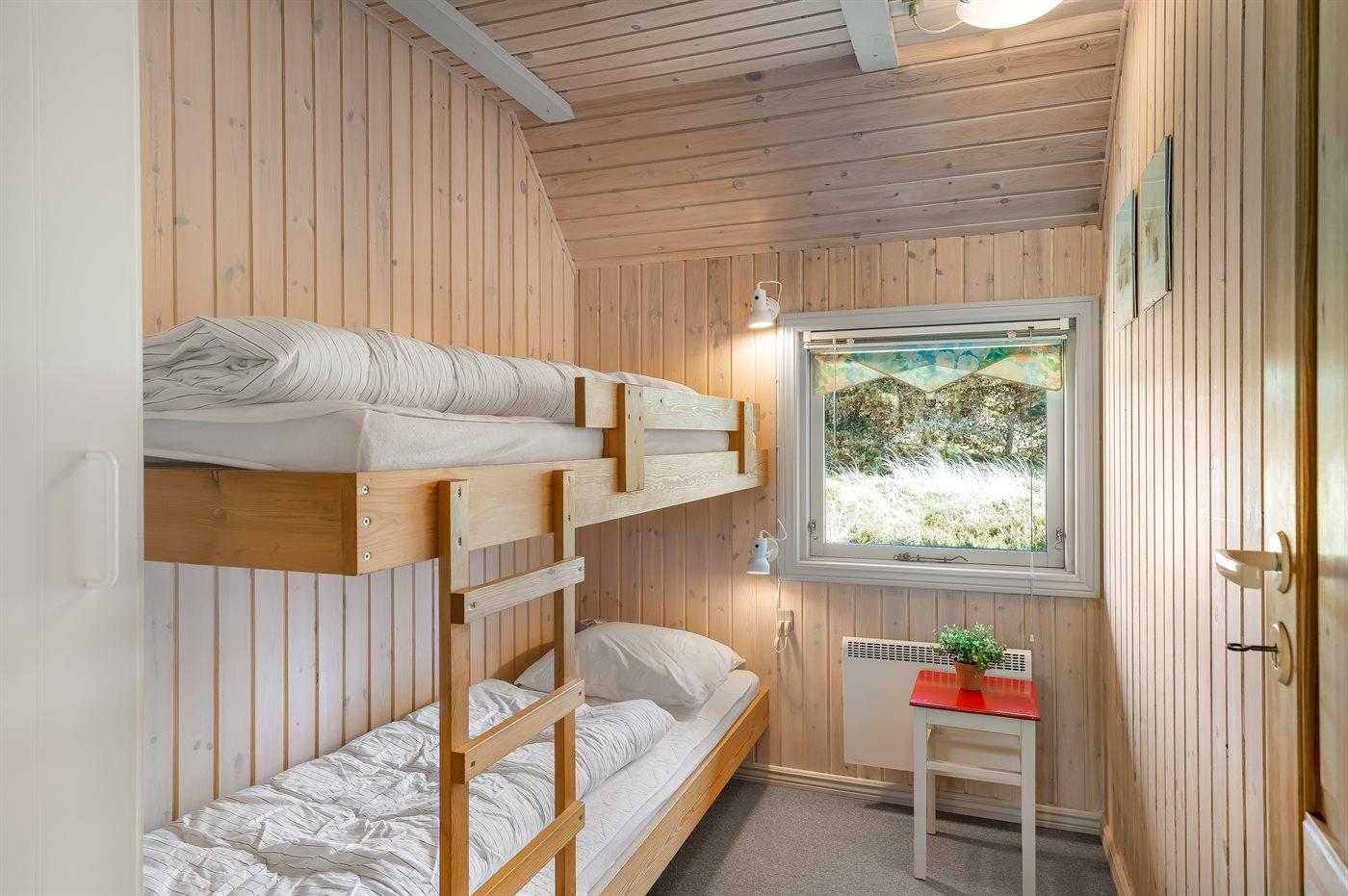 Der er i alt 3 soveværelser. Sovepladserne fordeler sig på: 2 sovepladser i dobbeltseng. 2 sovepladser i enkeltsenge. 2 sovepladser i køjeseng.
