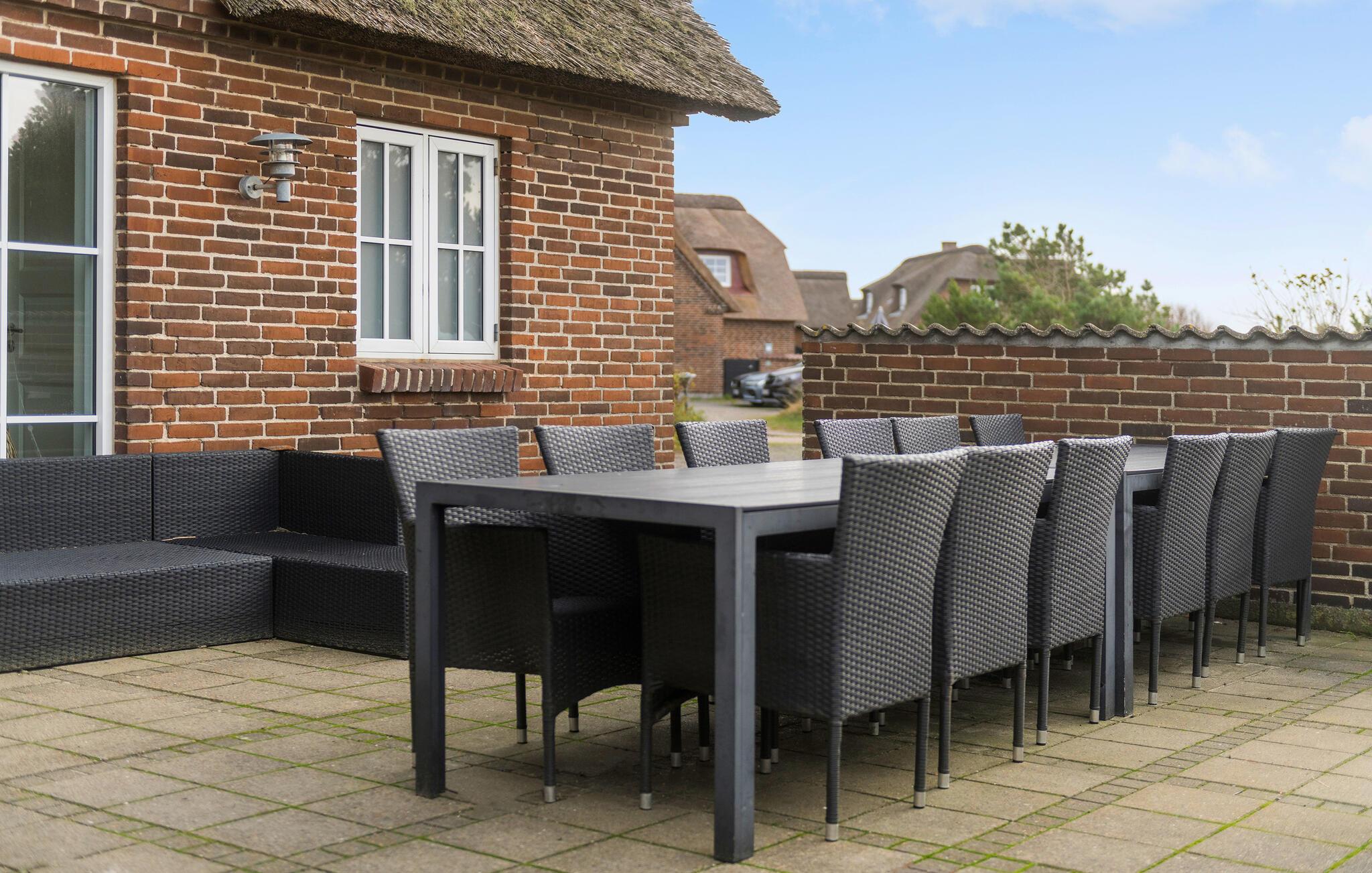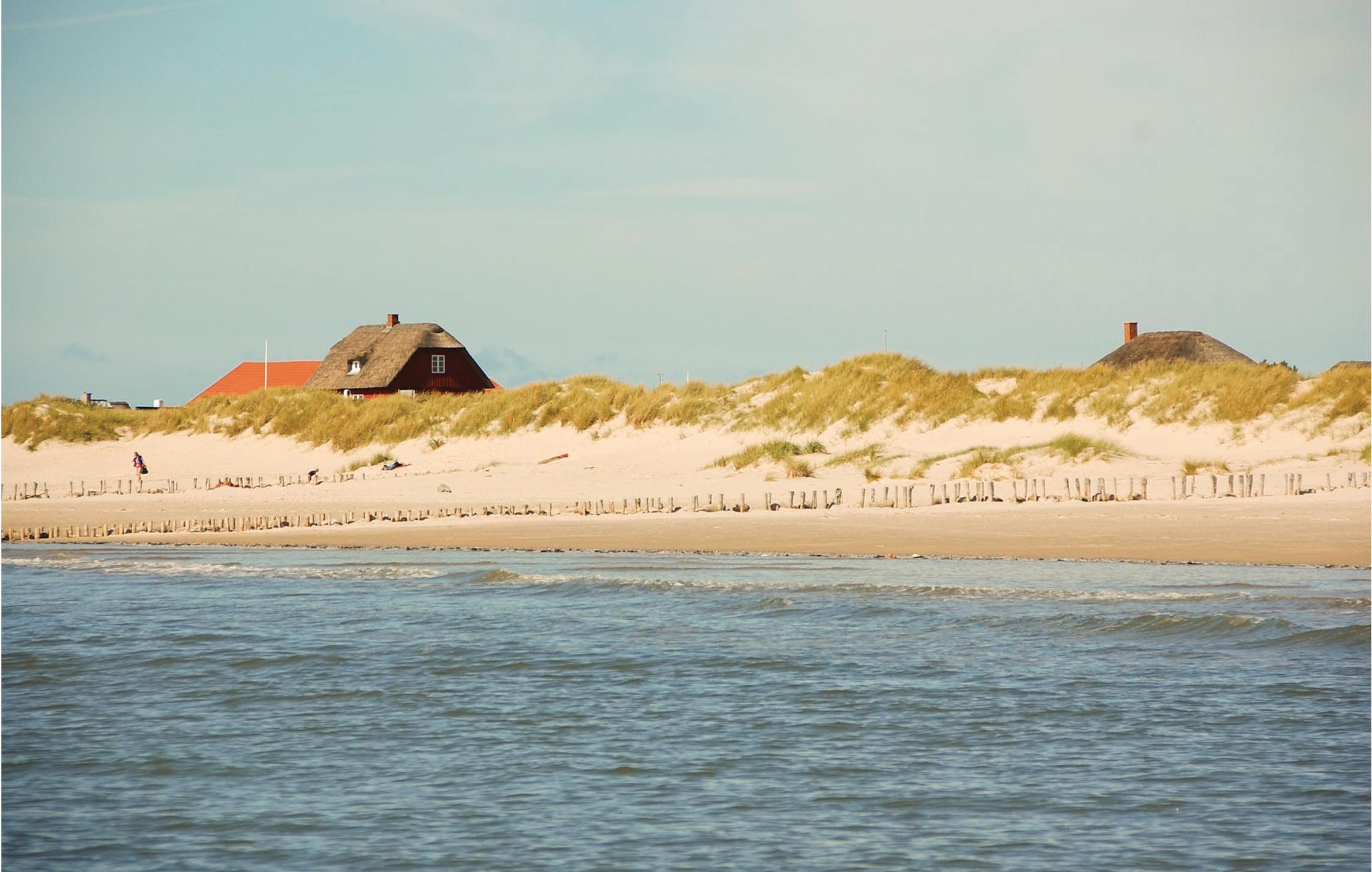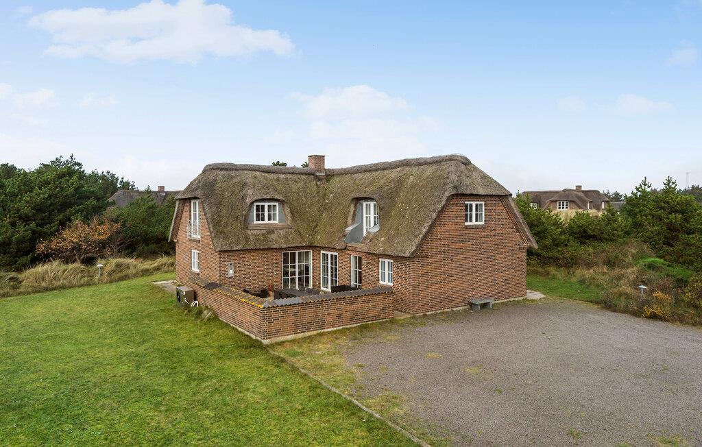 Nogle få hundrede meter fra en af ??Danmarks smukkeste sandstrande ligger dette moderniserede stråtagshus med en forrygende beliggenhed i Blåvand. Her får I en bolig med en stilfuld atmosfære, komfortable indretningsløsninger og et fuldt udstyret køkken, hvilket giver alle de bedste betingelser for at slappe af og holde fri. Der er to separate stuer med fladskærms-tv, så der behøver ikke være kamp om fjernbetjeningen, for både børn og voksne kan sætte favoritprogrammet på samtidig. Den rummelige spisestue har udsigt til poolen og giver jer et godt sted at sidde med kaffen, mens børnene hygger sig i vandet. I kan også sætte jer til rette på øverste etage, hvor der er en fantastisk udsigt over klitterne og ned til fyret.