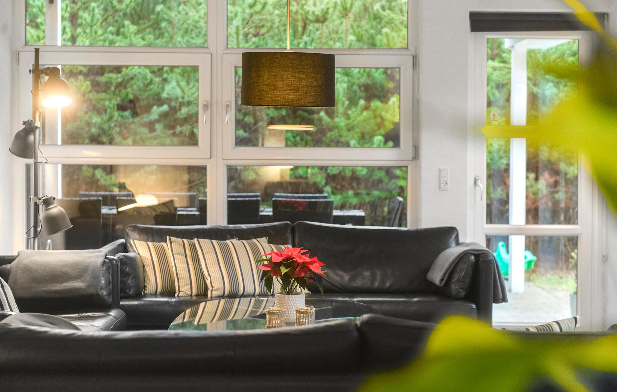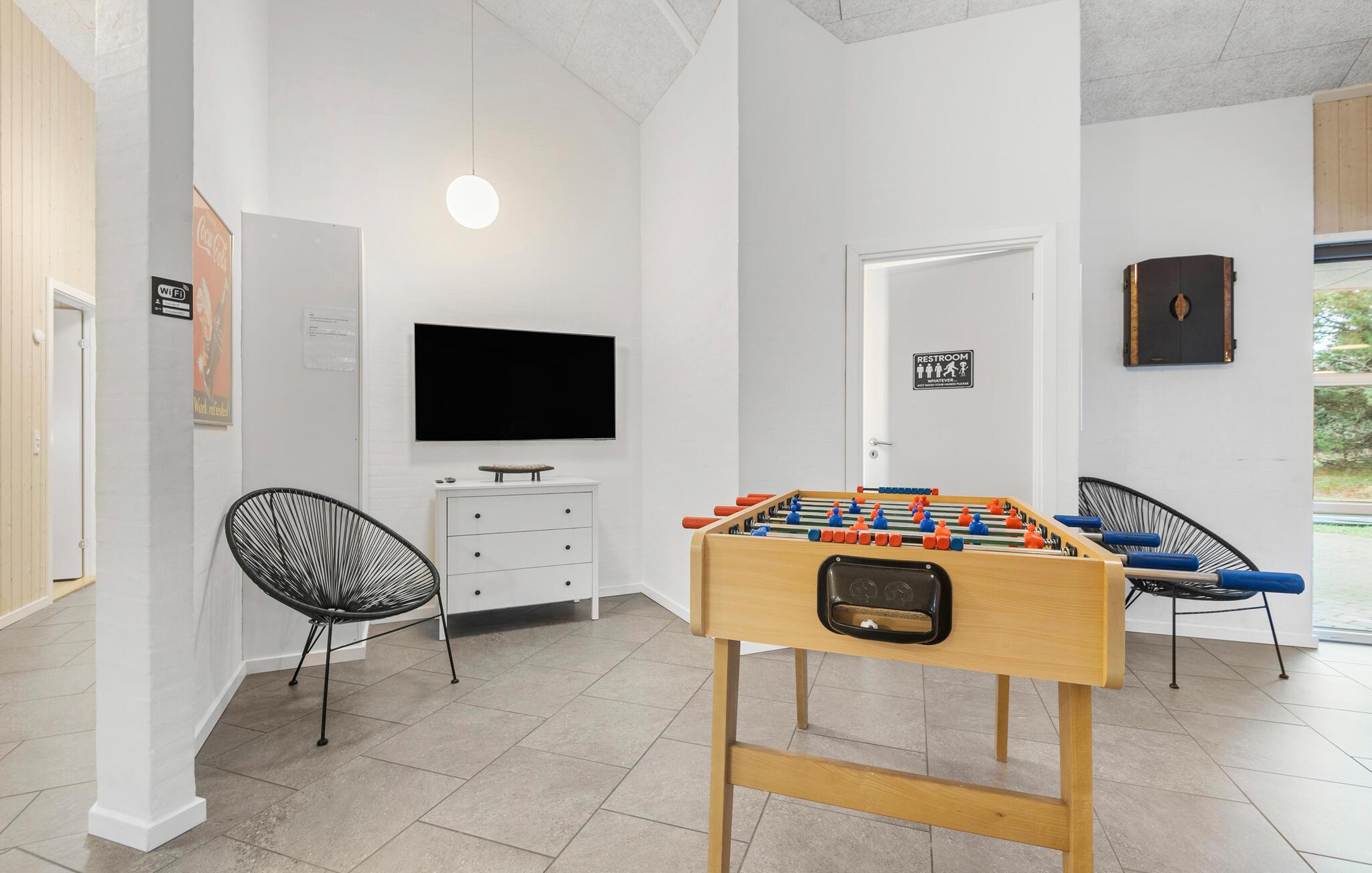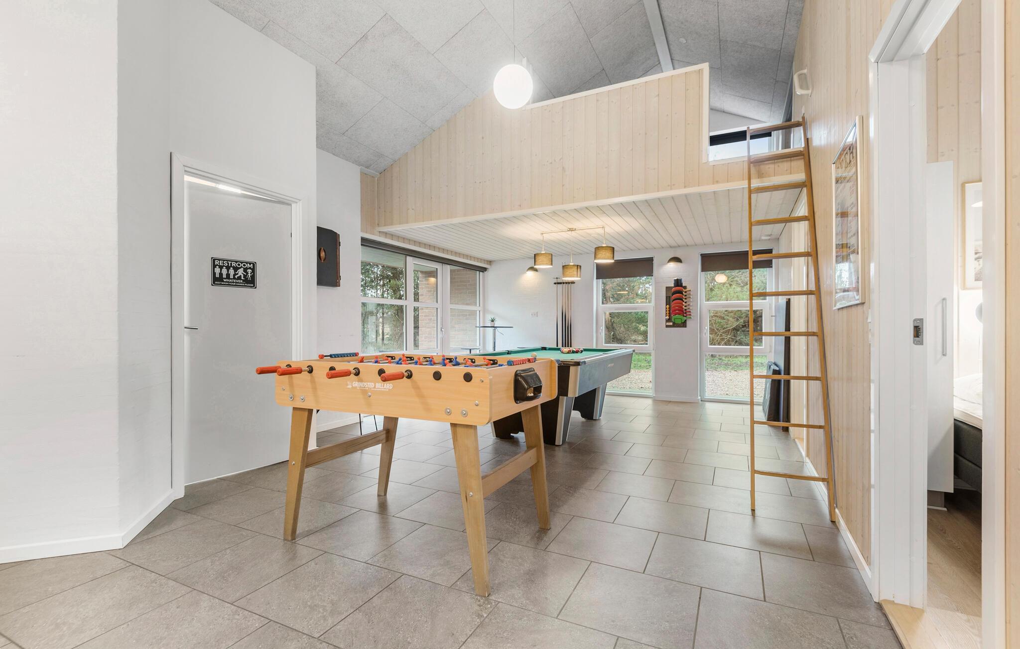 Flot feriehus i Blåvand med pool, spabad og aktivitetsrum på stor, lukket grund.