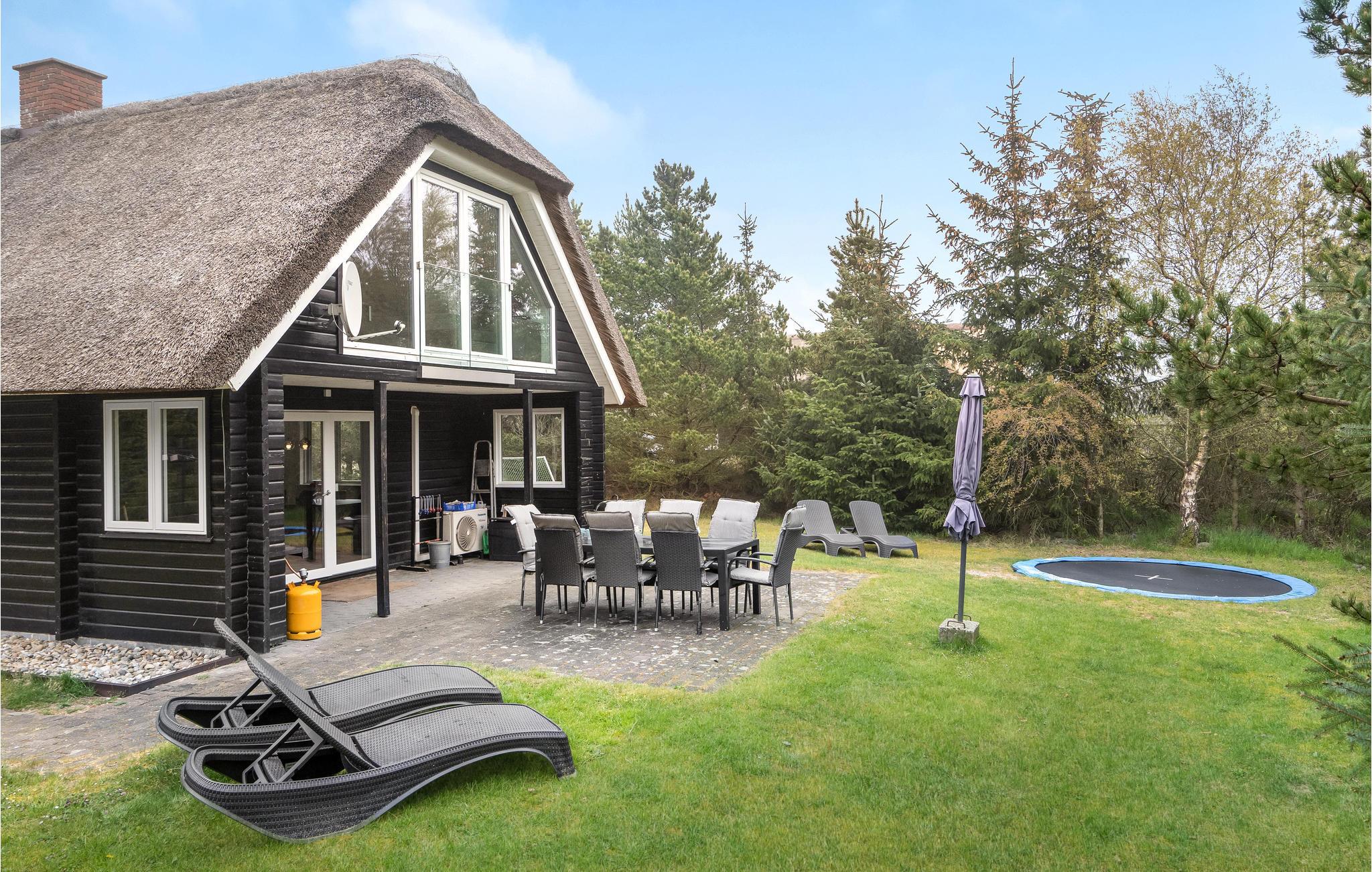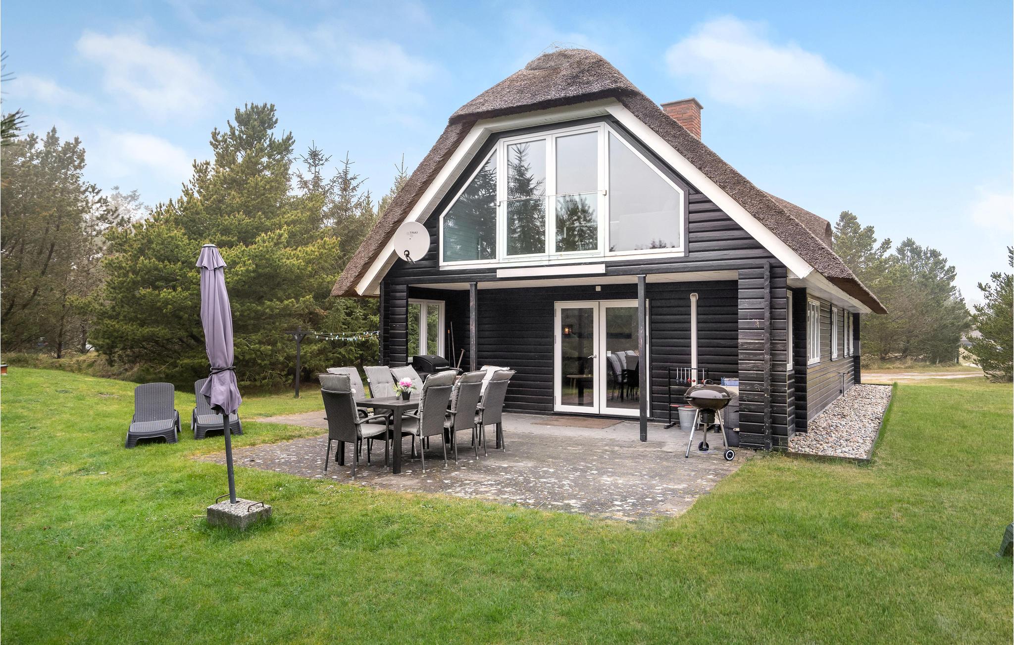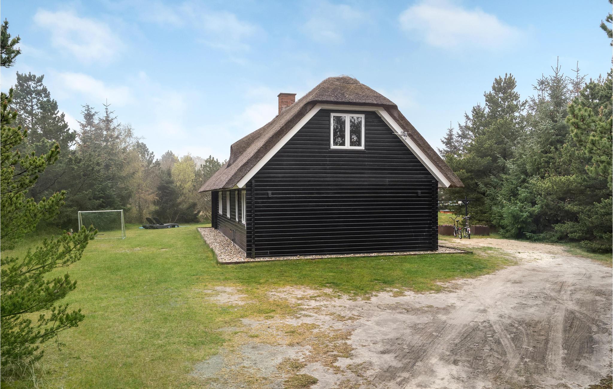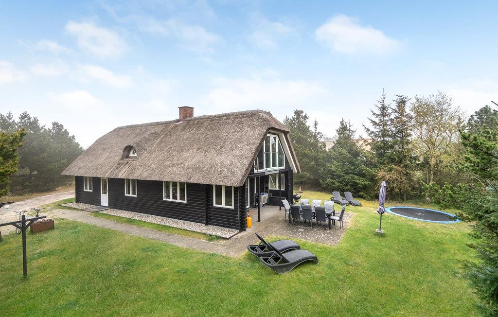 Hyggeligt stråtækt feriehus i Blåvand med spabad, sauna og aktivitetsrum på stor naturgrund.