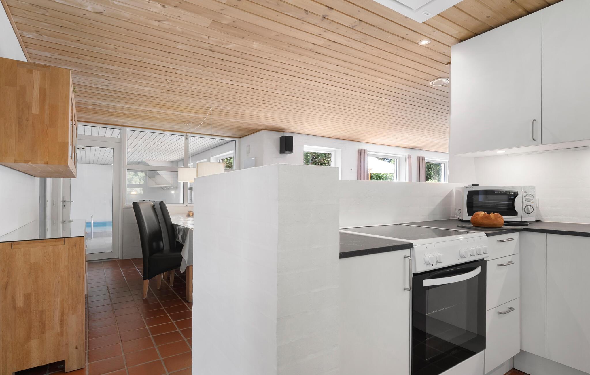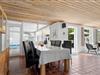 Et velholdt og hyggeligt feriehus beliggende på en kuperet naturgrund. Husets stue ligger centralt placeret, og herfra er der adgang til husets øvrige rum.
