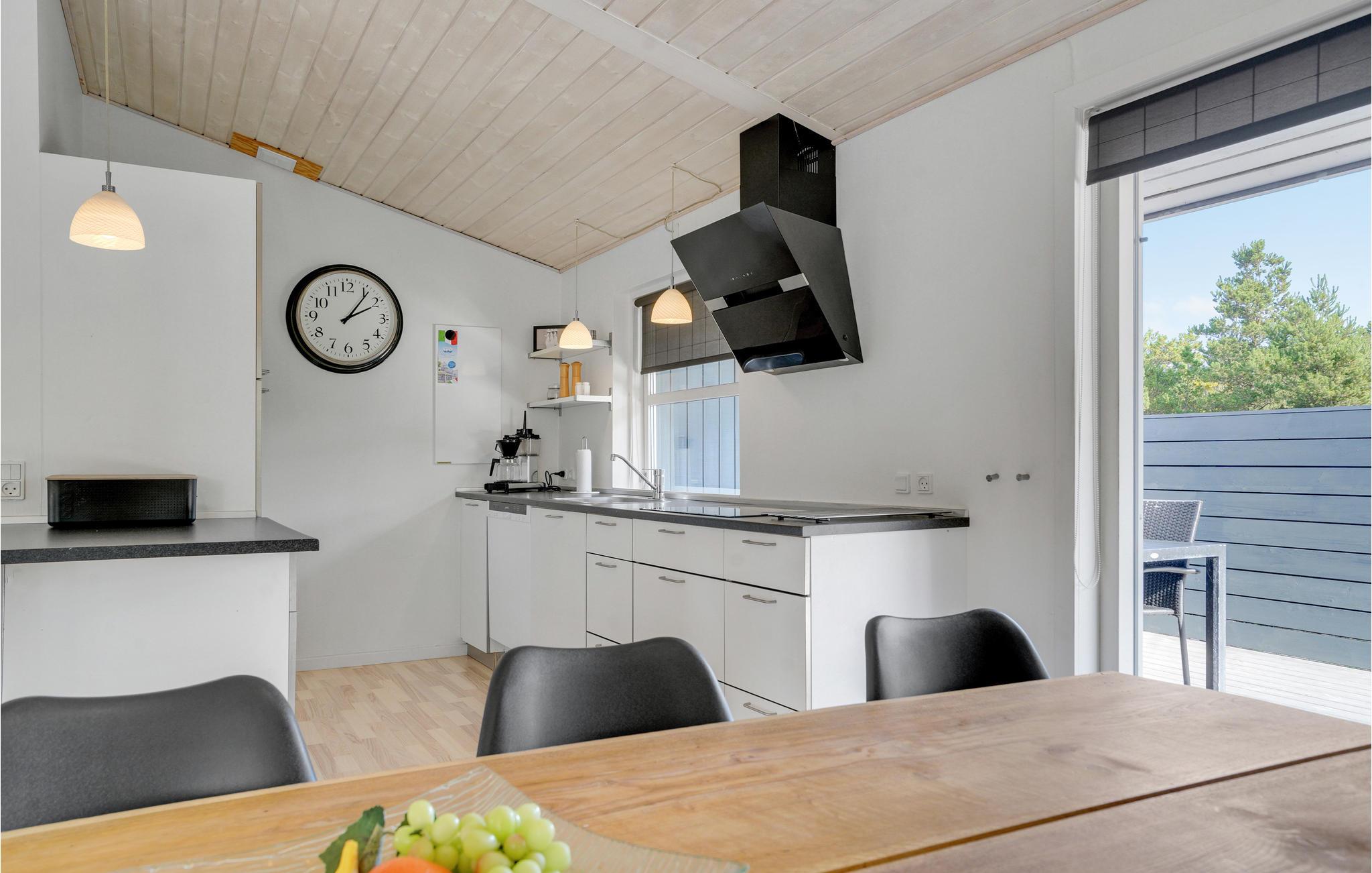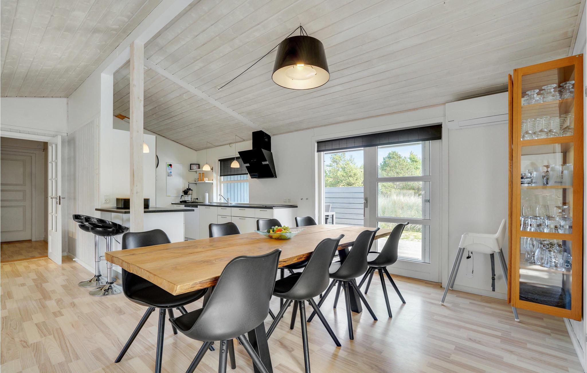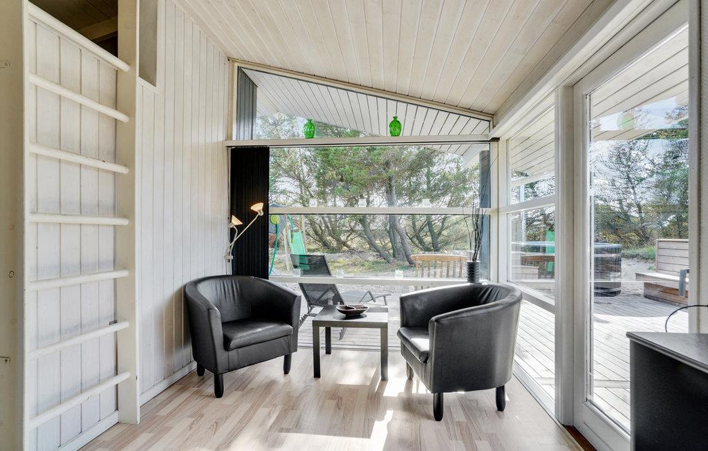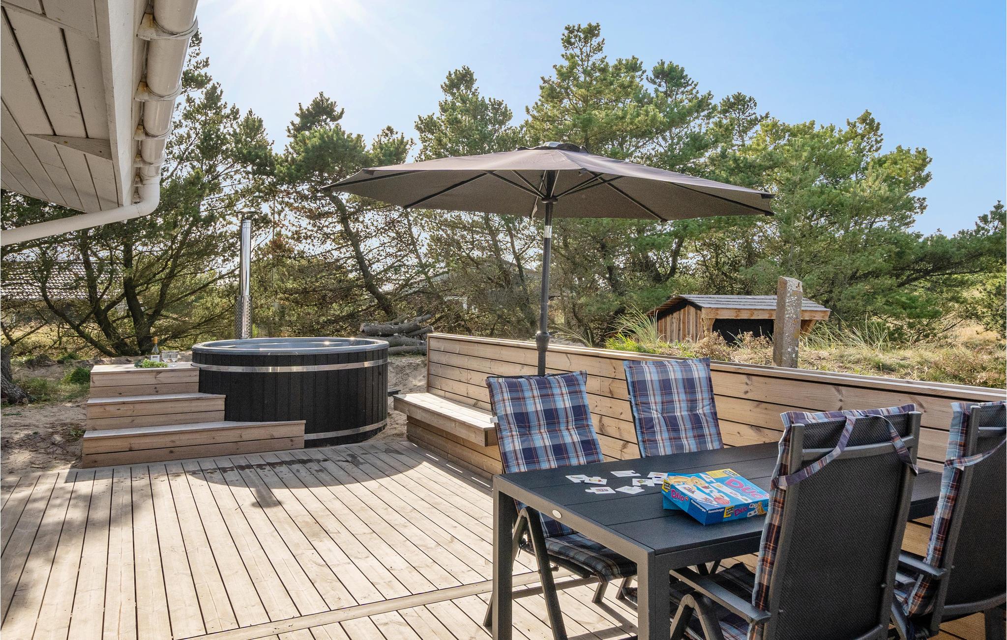 Dette pæne feriehus, som ligger på en naturgrund, er løbende blevet renoveret. Fra det dejlige lyse køkken kan I se direkte ind i stuen, som naturligvis har en hyggelig brændeovn. I stuen er der flere store glaspartier, hvor solen giver nogle spændende lysindfald. Fra stuen kan I træde ud på en af terrasserne. Efter en travetur i de tilstødende klitter kan I benytte spabadet eller saunaen. Til de yngre medlemmer er der en lille hems. Der er tilknyttet et stort anneks hvor I finder S4 og S5 og annekset har eget badeværelse.