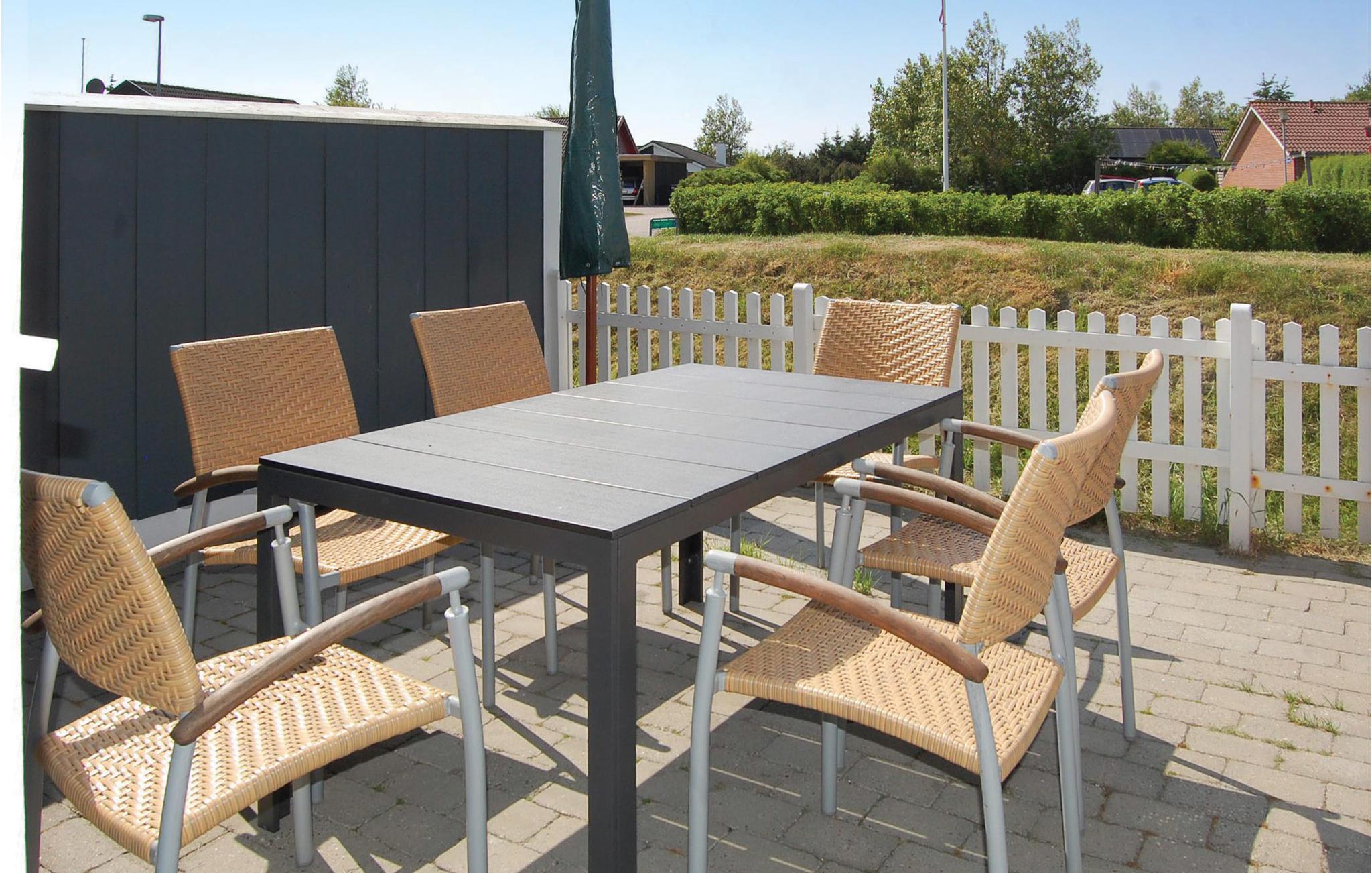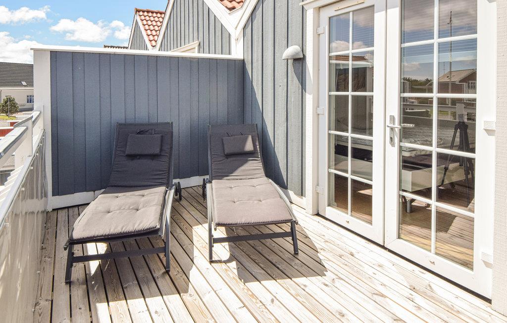 Dette stilfulde rækkehus ligger i udkanten af ??Blåvands charmerende centrum og er en del af et velholdt boligkompleks. Huset er noget særligt med sin lyse og indbydende atmosfære, ideel til en afslappende ferie ved Vesterhavet. Den rummelige opholdsstue er smagfuldt indrettet og byder på komfortable møbler og kunstneriske malerier, der skaber en hyggelig atmosfære. Det moderne køkken er funktionelt udstyret og indbyder til at tilberede lækre retter sammen. Nyd udsigten over det omkringliggende område fra altanen ovenpå.