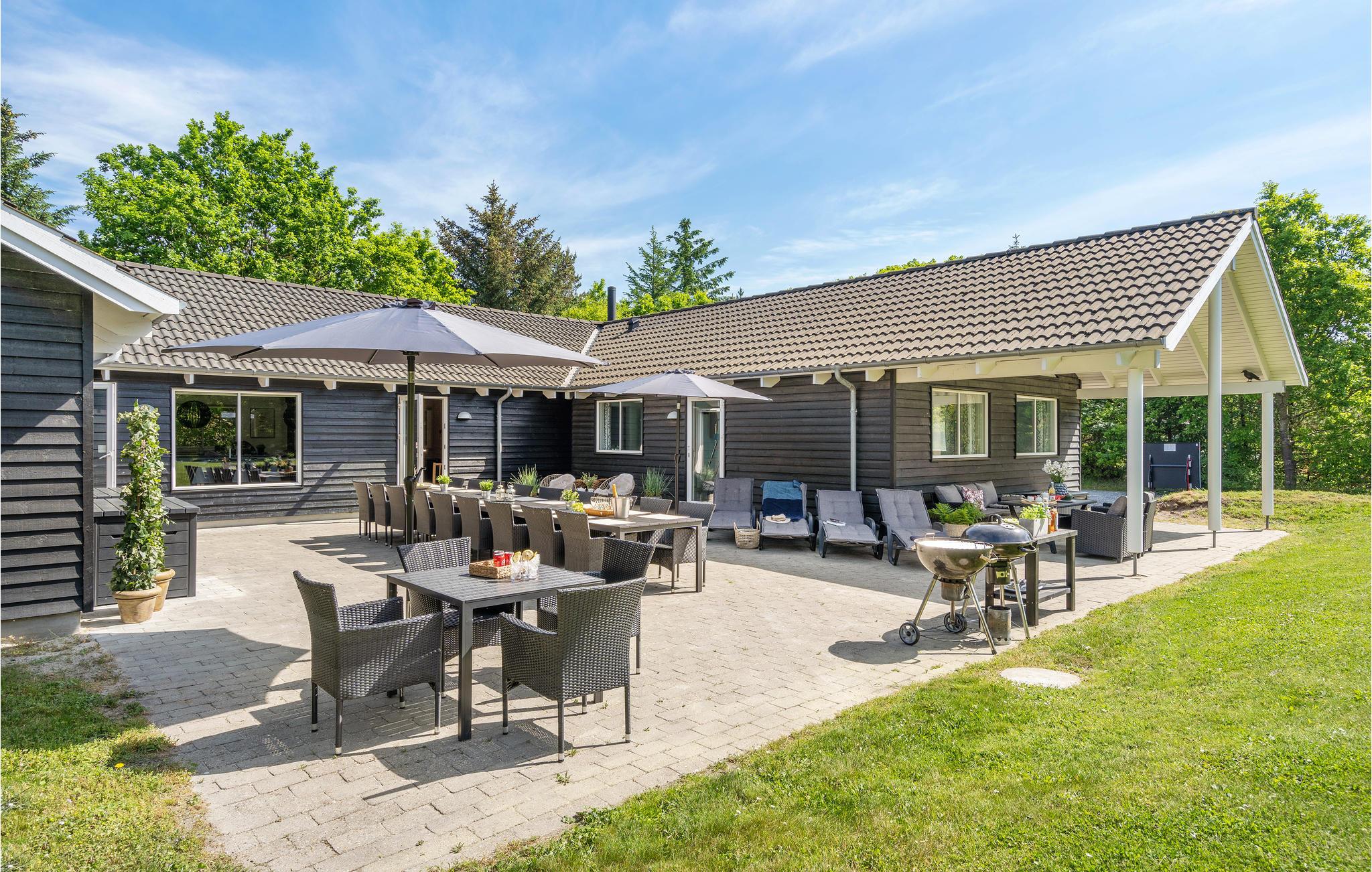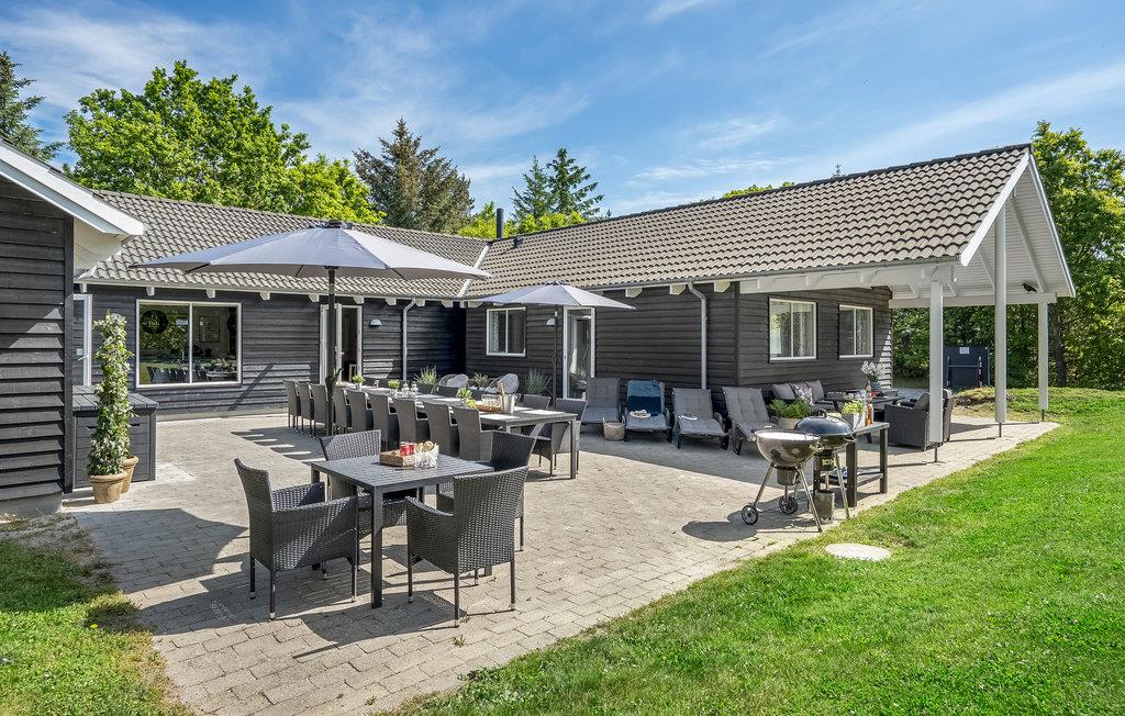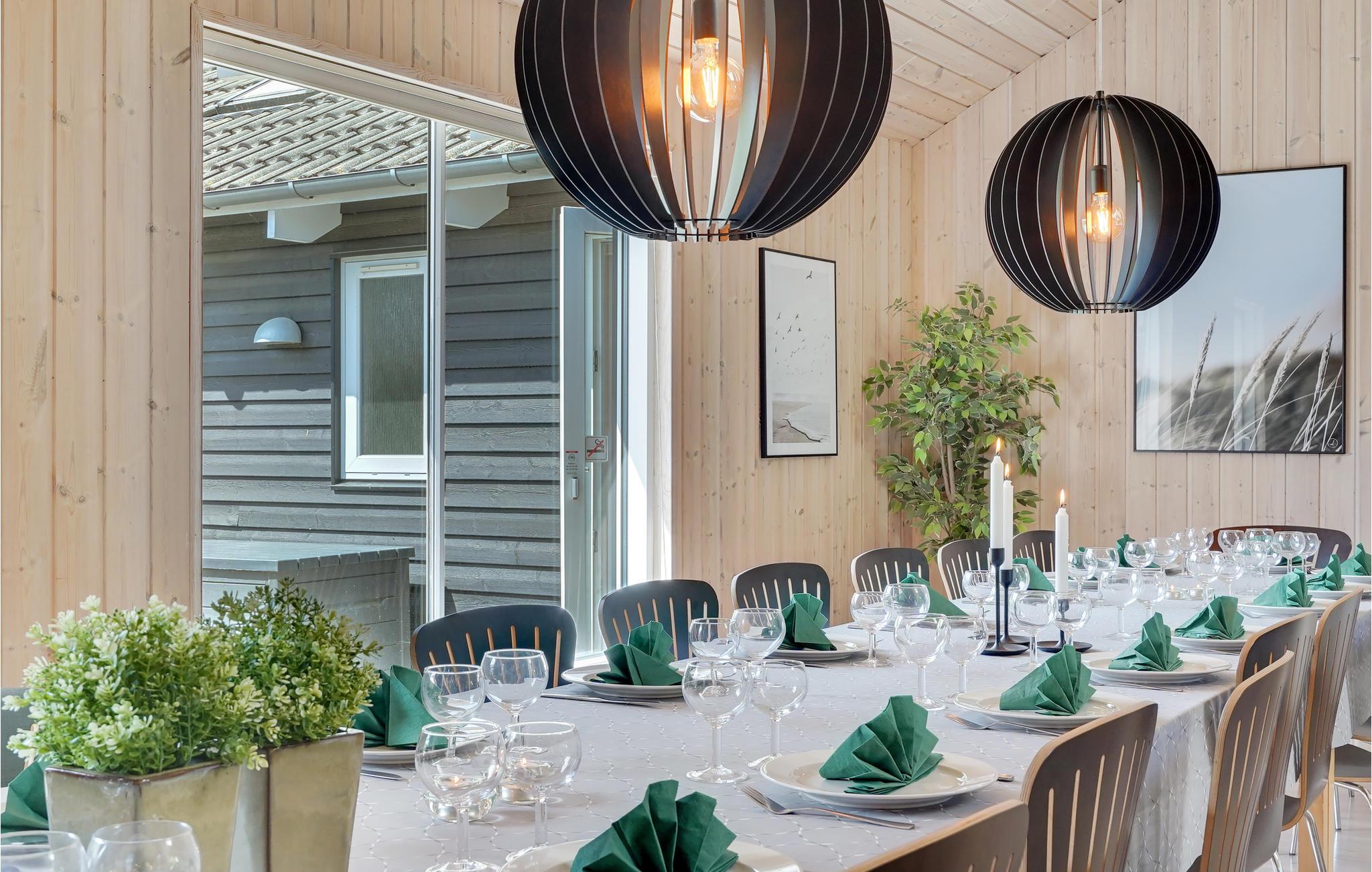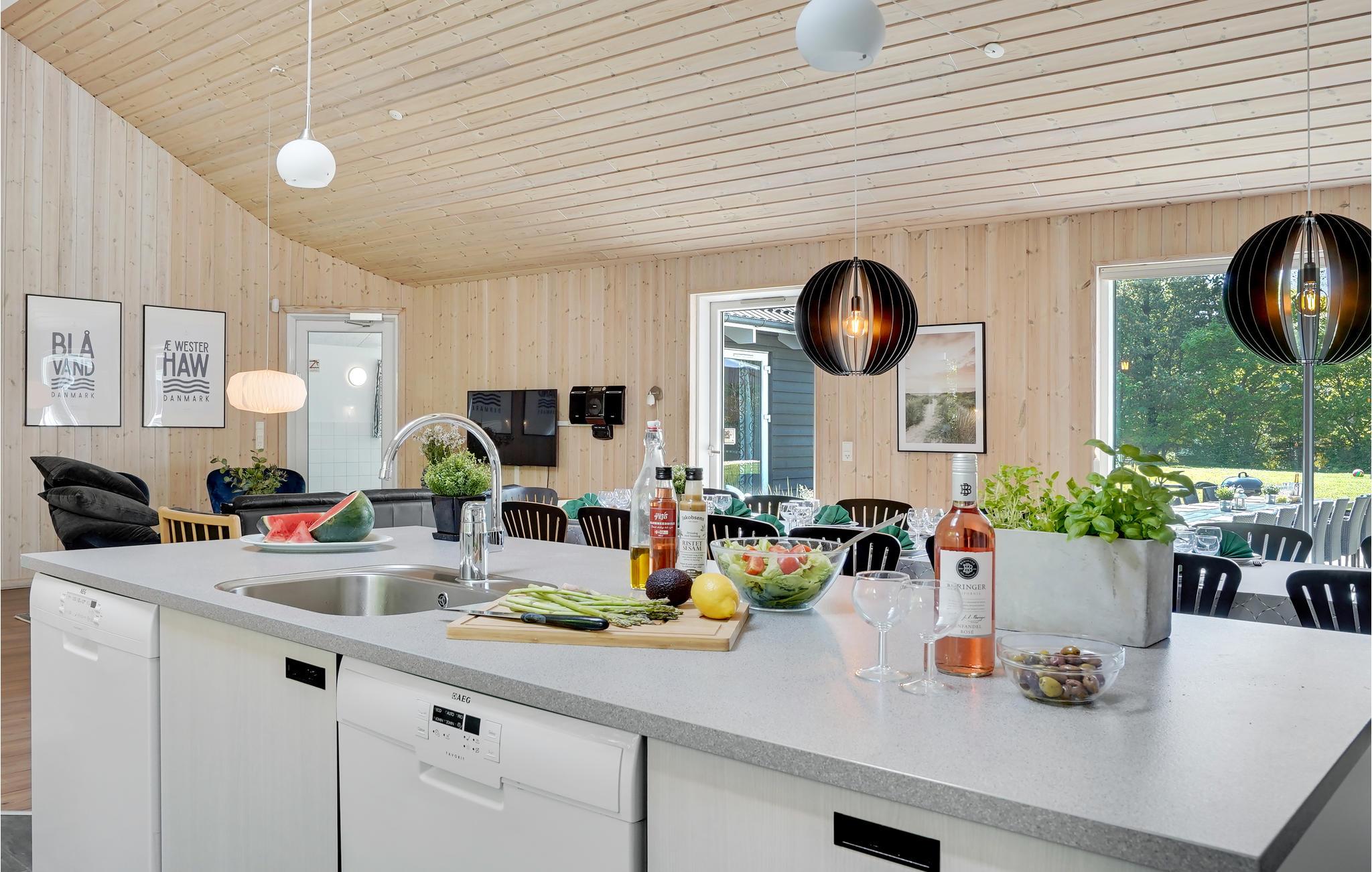 Det lækre sommerhus har otte soveværelser, fire badeværelser, et køkken, en smuk opholdsstue og en åben hems. Nyd de afslappende aftener i sofaen med knitrende ild i pejsen og en god bog - det er nu, I skal sætte hverdagen på pause. Det flotte køkken-alrum er et hyggeligt sted til at give sig god tid til maden og lave lækre feriemåltider sammen.
