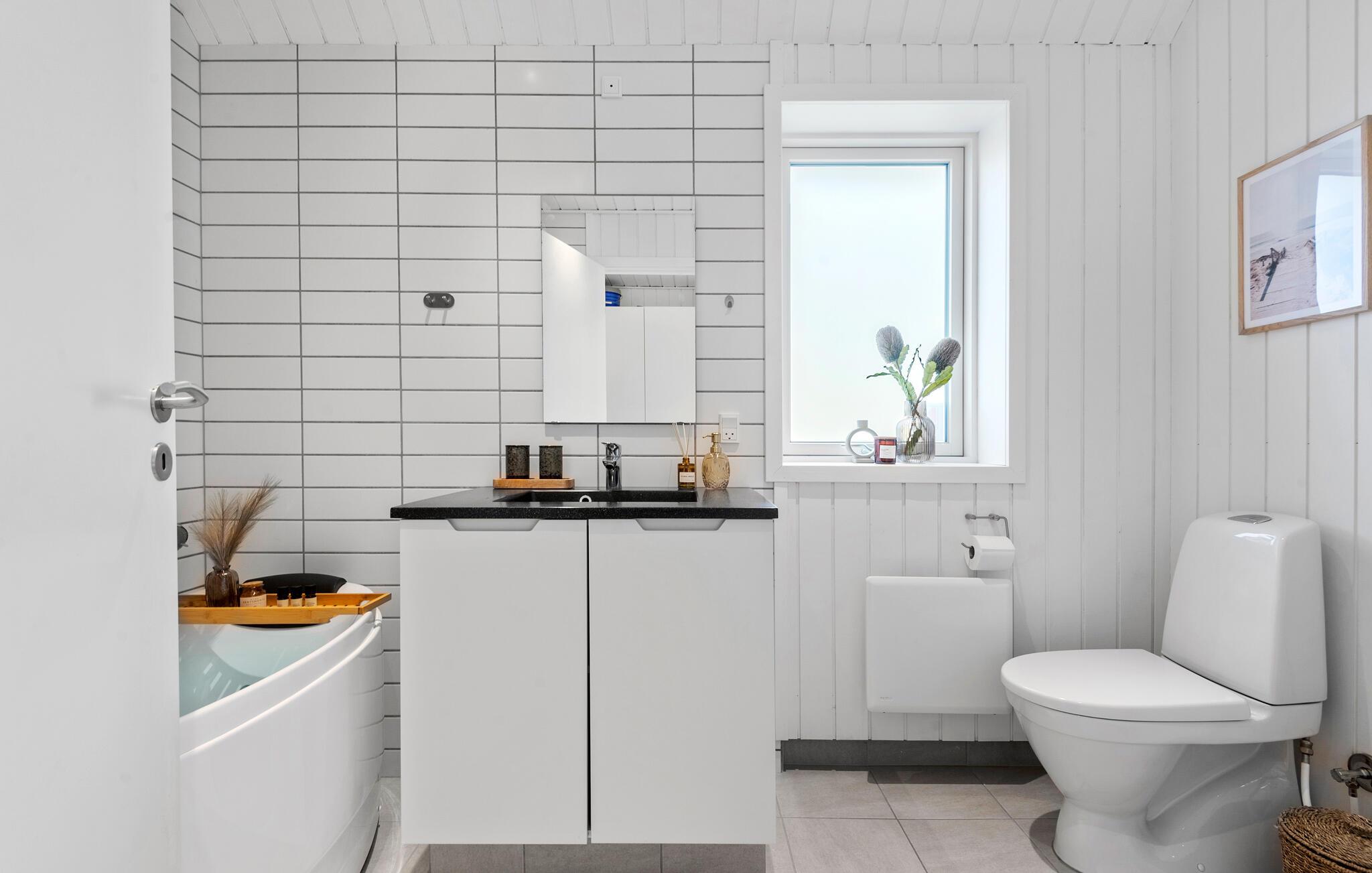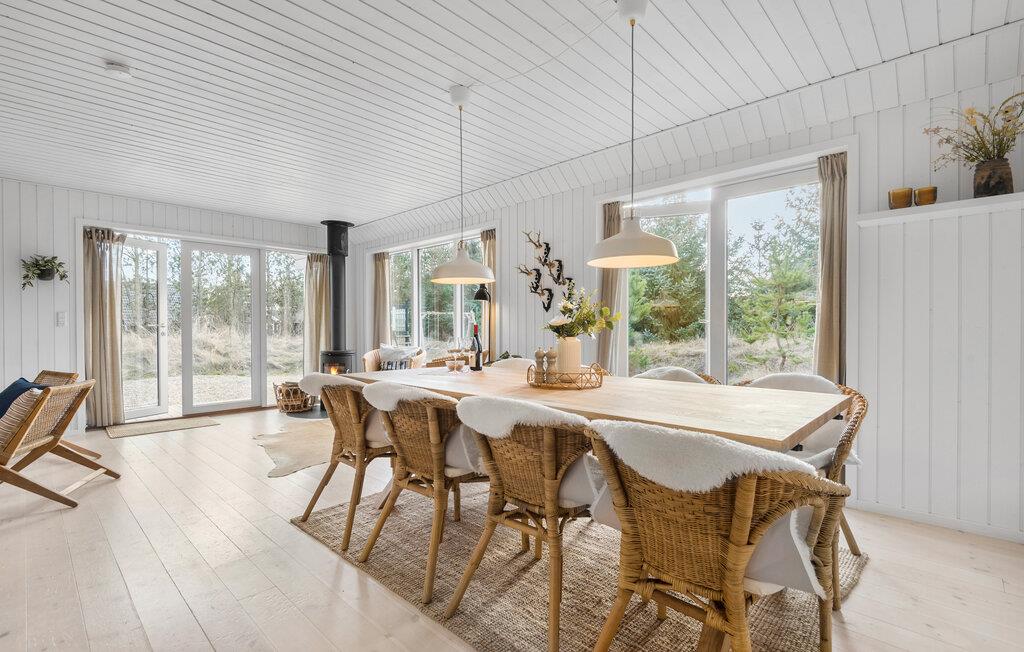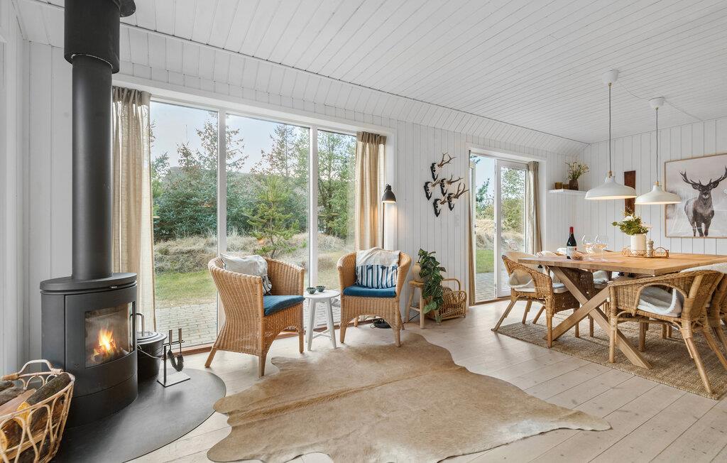 Husets stue og køkken i ét vender mod syd, og har en dør ud til den både åbne og overdækkede terrasse, så der er nem adgang til ophold i den friske luft. Huset er indrettet til mange gæster, med to komplette badeværelser. Lige indenfor entrédøren ligger et dejligt lille bryggers. Hverken børn eller legeglade voksne kommer til at kede sig, her er nemlig et lille aktivitetsrum, hvor I finder både bordfodbold, et lille poolbord og en del andre spil, hvis vejret sætter begrænsning på udendørs ophold.