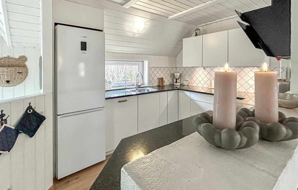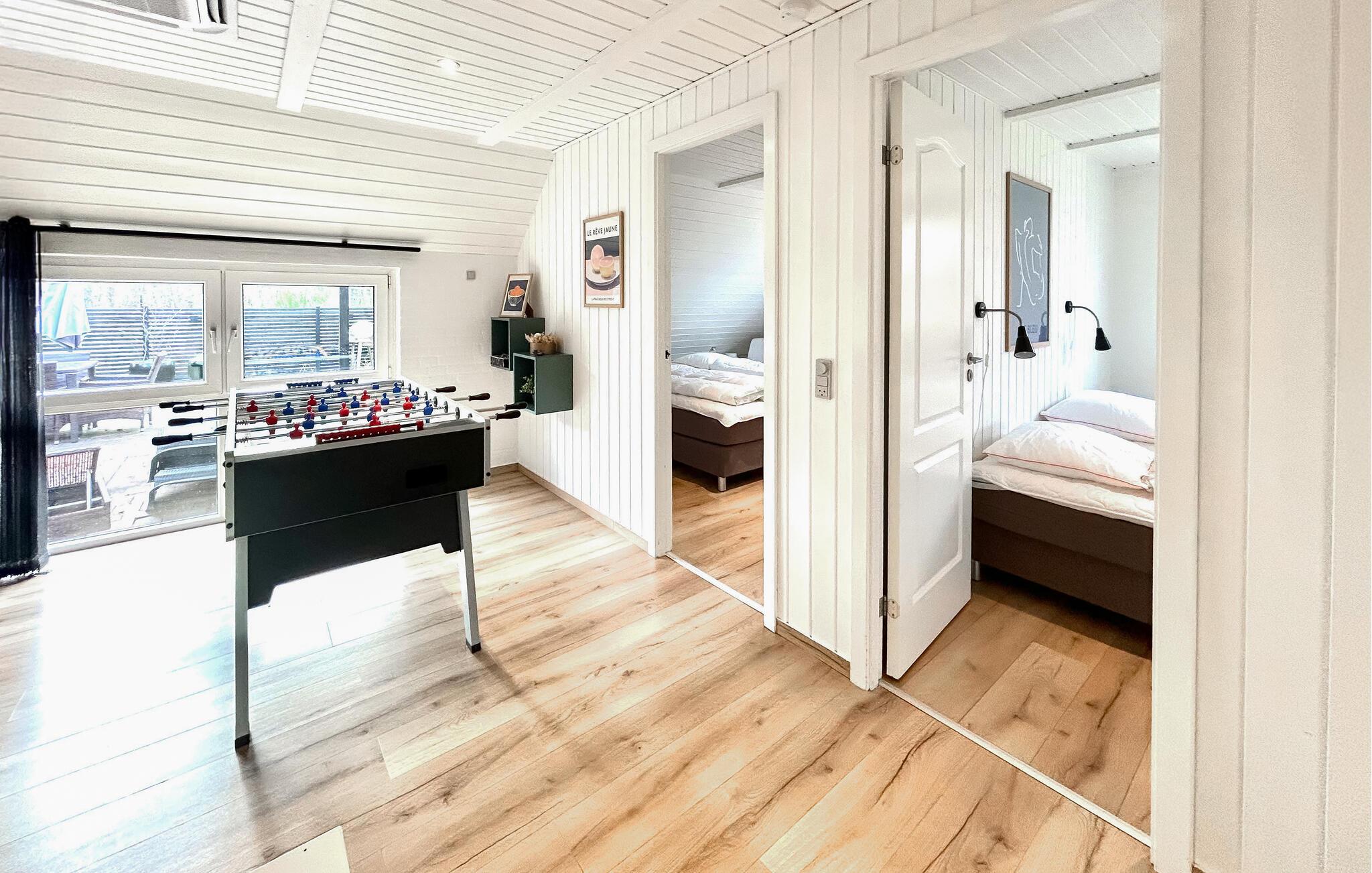 Dette lyse og stilfulde feriehus tilbyder attraktive ekstrafaciliteter til hele familien. I det moderne køkken kan I trylle lækre retter frem med friske råvarer fra gårdbutikken, hygge jer med børnene ved bordtennisbordet, poolbordet eller fodboldbordet, og samles til en hyggelig filmaften i den rummelige sofa.
