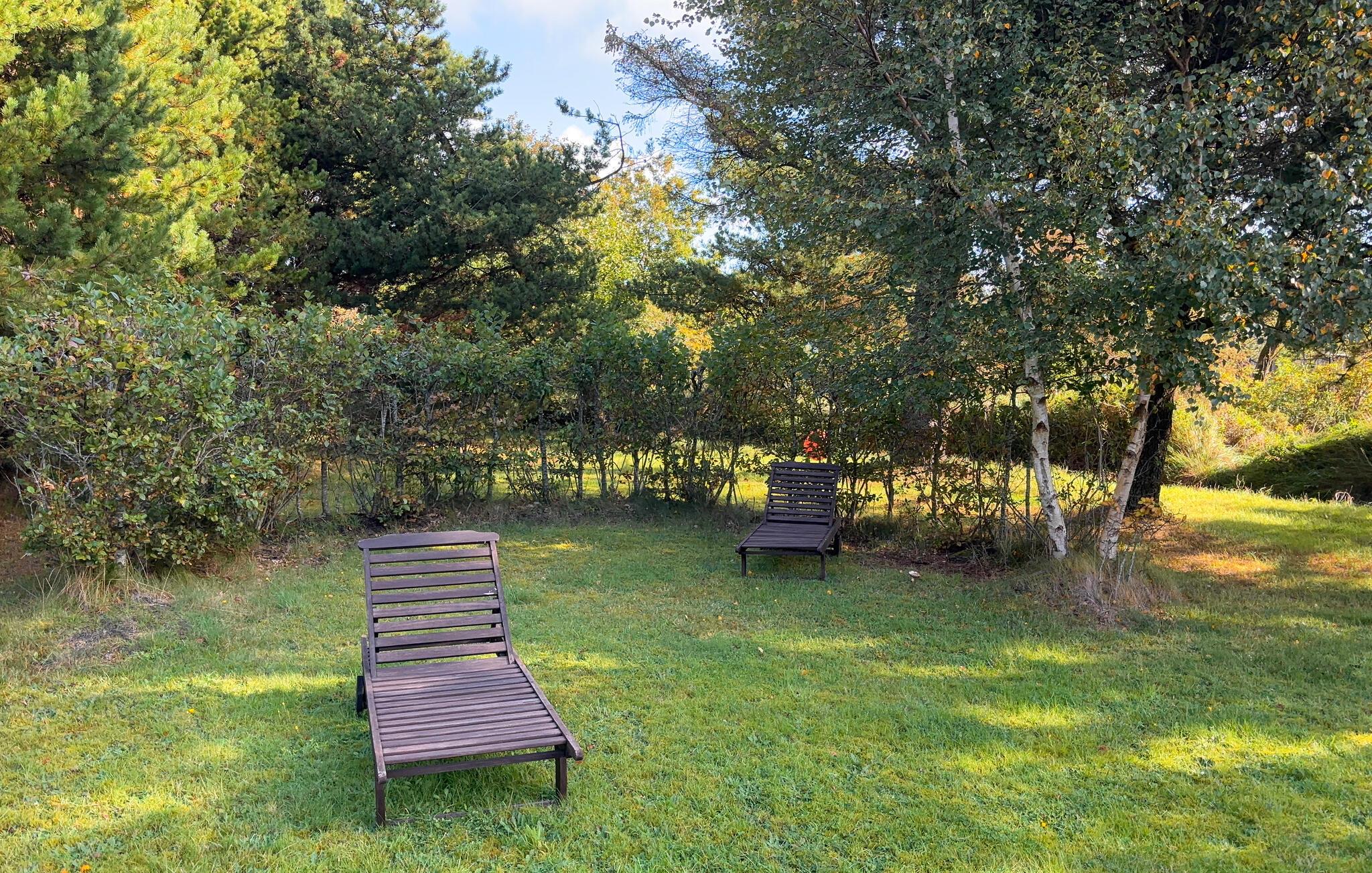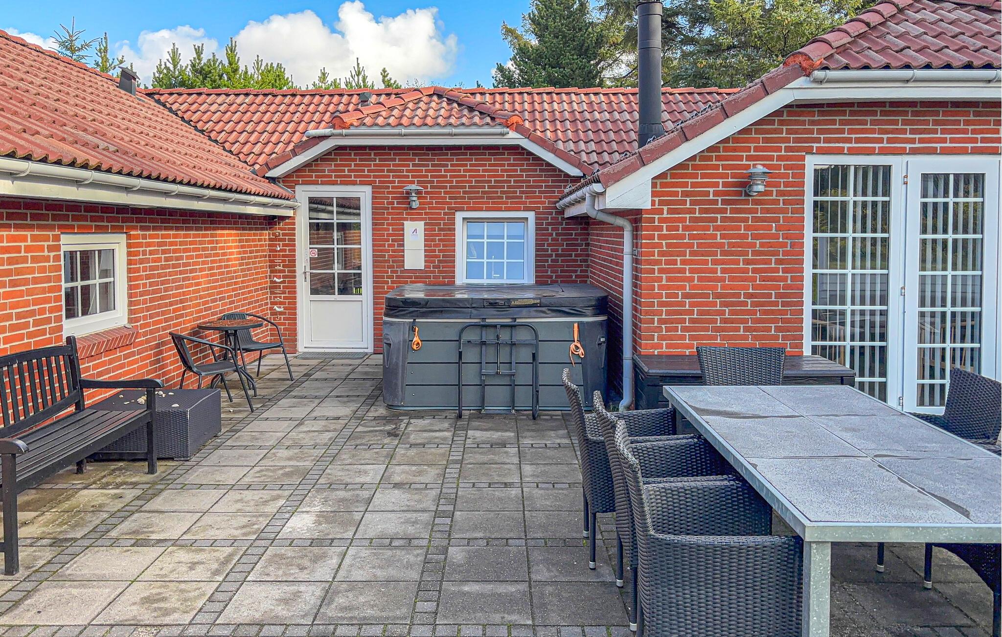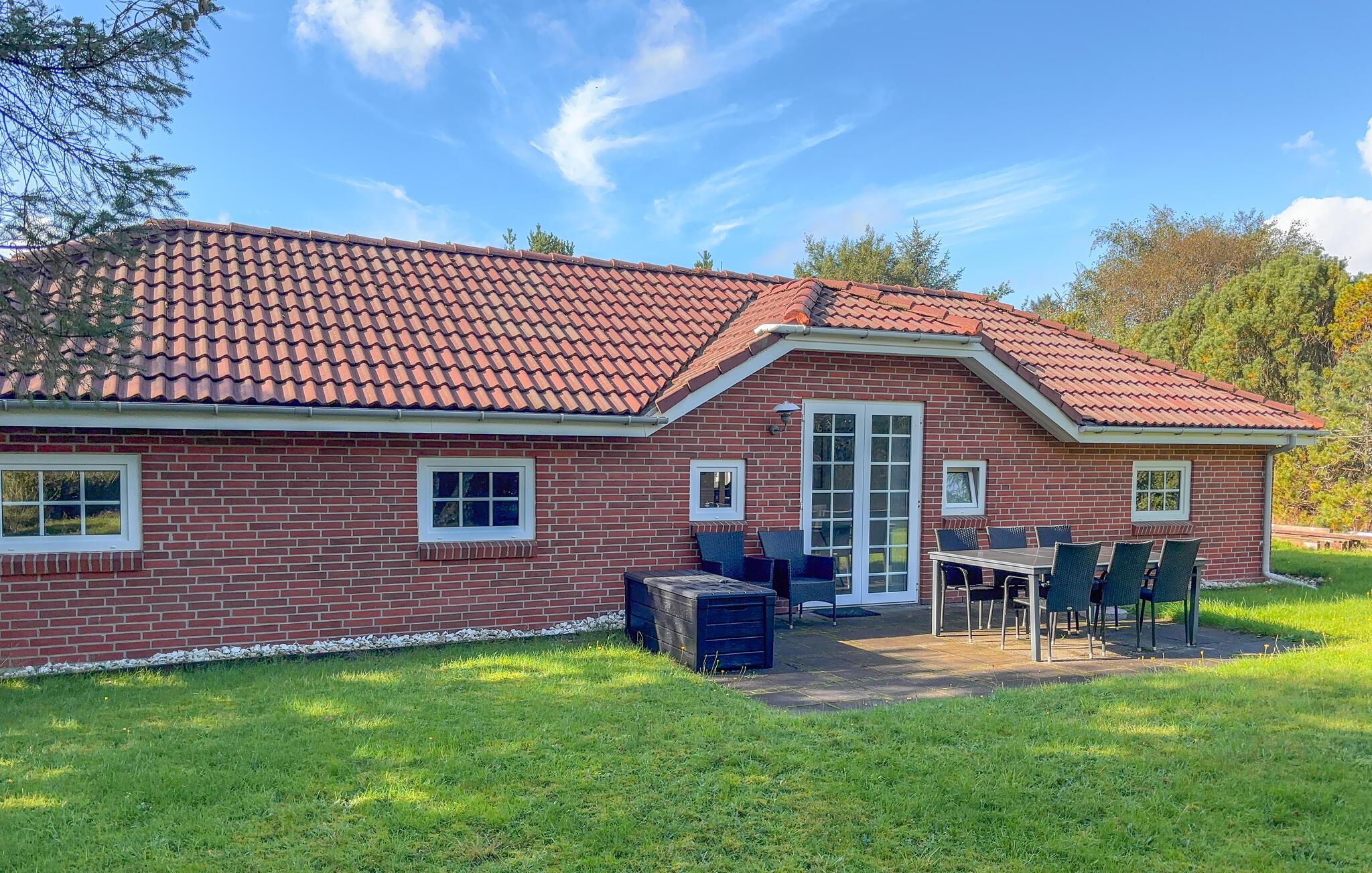 Hyggeligt feriehus i Blåvand med spabad, brændeovn og grønne omgivelser for afslapning og samvær.