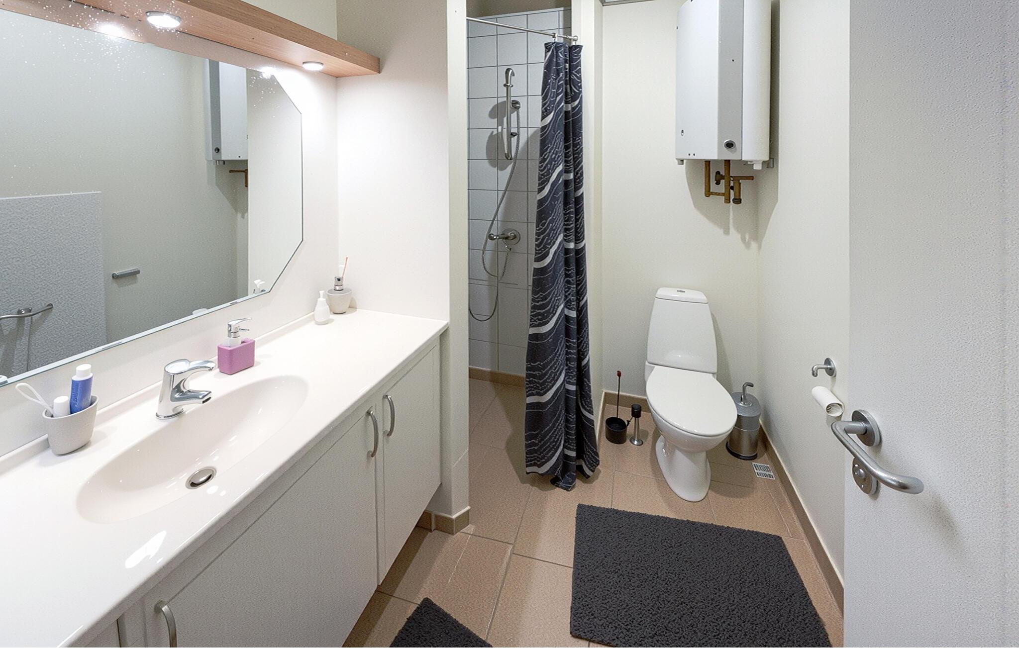 Badeværelse (nr. 1) - WC. Varmt og koldt vand. Bruser