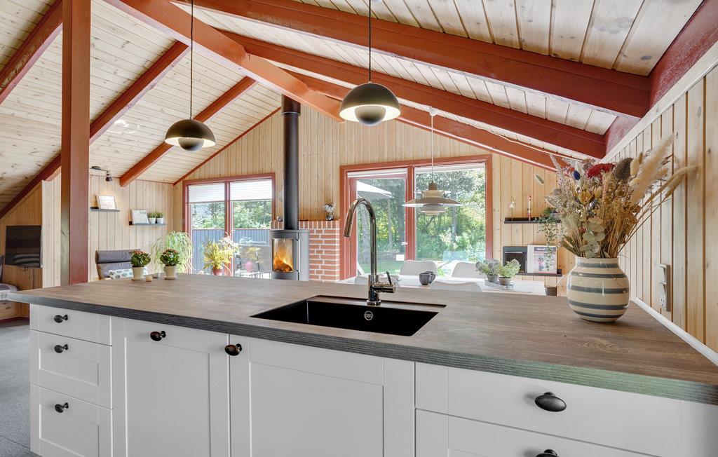Dette hyggelige feriehus, der blev renoveret i 2021, ligger midt i Blåvand. De 3 soveværelser, 2 med dobbeltsenge og et med en enkeltseng, kan rumme op til 5 personer, og I kan desuden medbringe jeres kæledyr på ferien her. Her finder I alle de moderne bekvemmeligheder, der er nødvendige for en vellykket ferie og I kan oven i købet let klare vasketøjet løbende med den kombinerede vaskemaskine og tørretumbler. På køligere aftener kan I hygge jer ved brændeovnen og nyde den dejlige atmosfære.