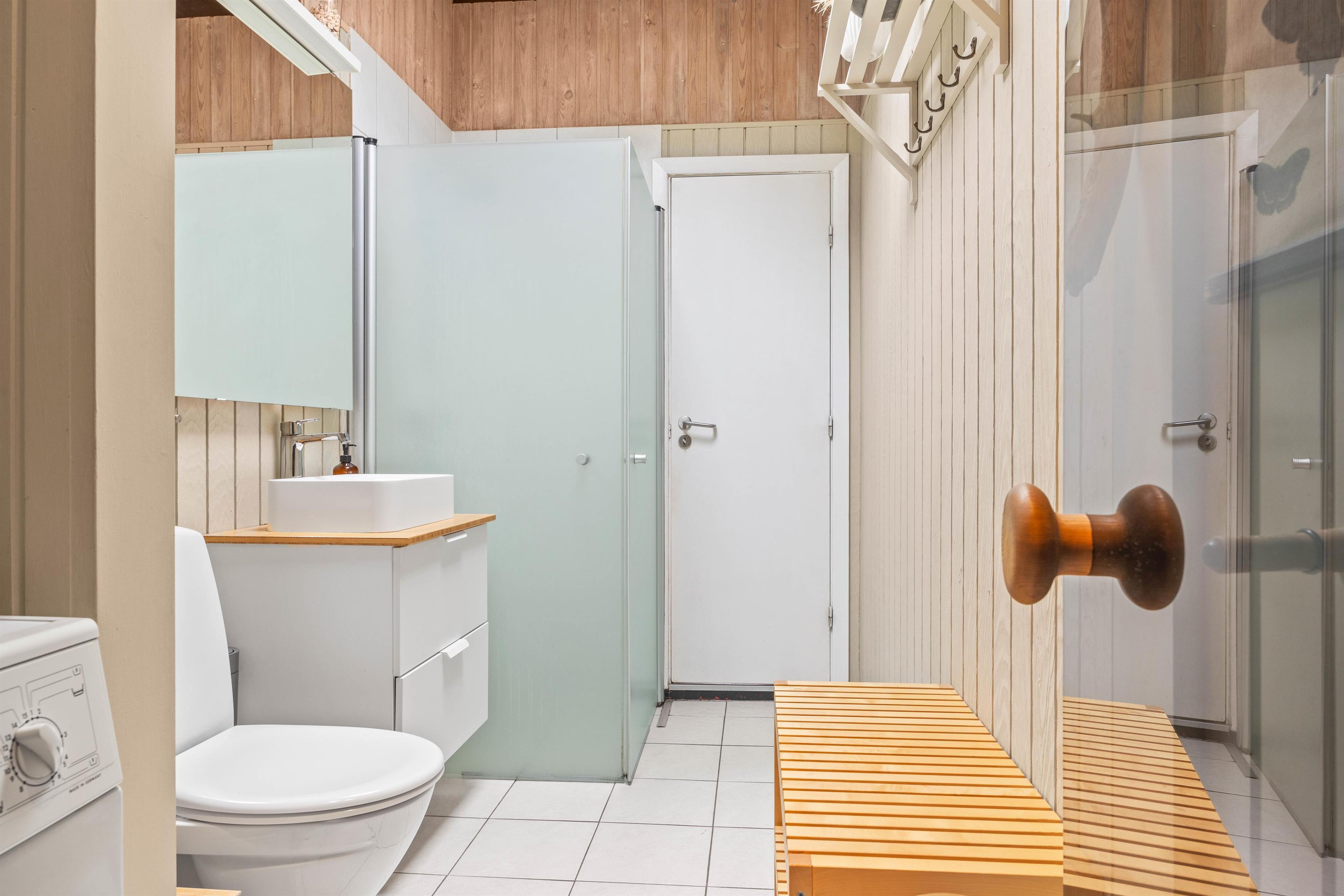 På sommerhusets badeværelse er der gulvvarme, og her er der desuden mulighed for at vaske lidt tøj eller håndklæder i sommerhusets vaskemaskine. Fra badeværelset er der indgang til saunaen, der indbyder til afslapning og velvære efter en oplevelsesrig feriedag.