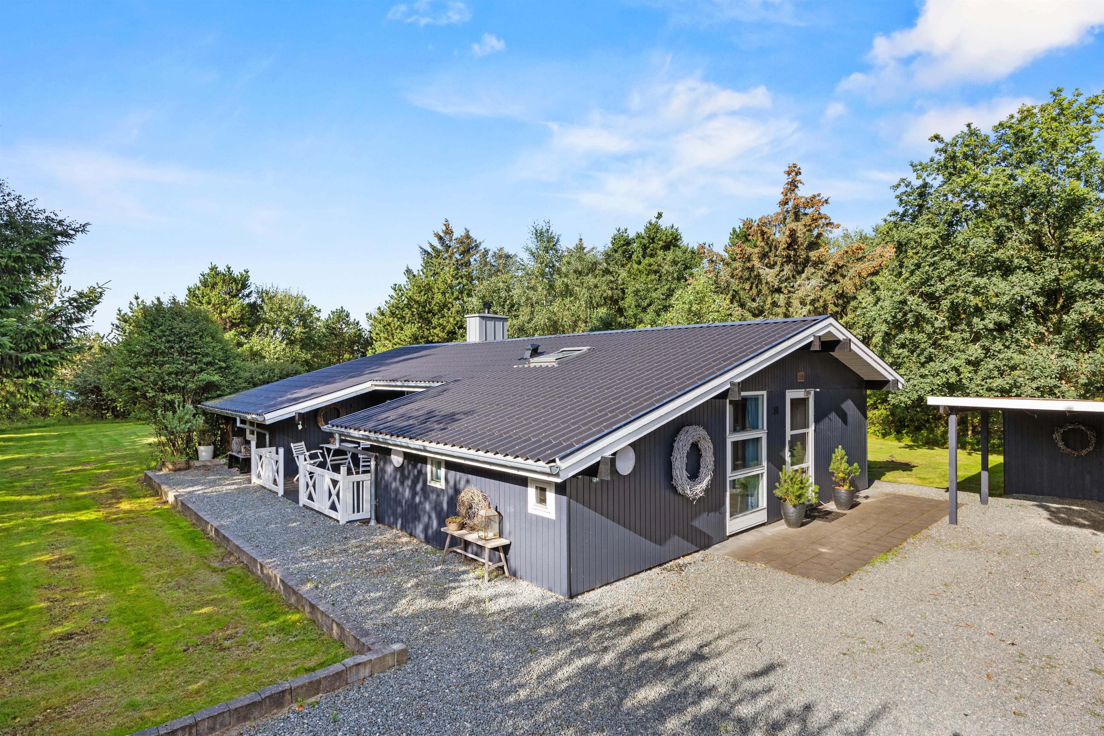 Sommerhuset ligger på en skøn naturgrund omgivet af buske og træer. Rundt omkring på grunden finder I flere hyggelige kroge, hvor I kan nyde feriedagen. I kan både finde pladser i sommersolen eller i skyggen.
