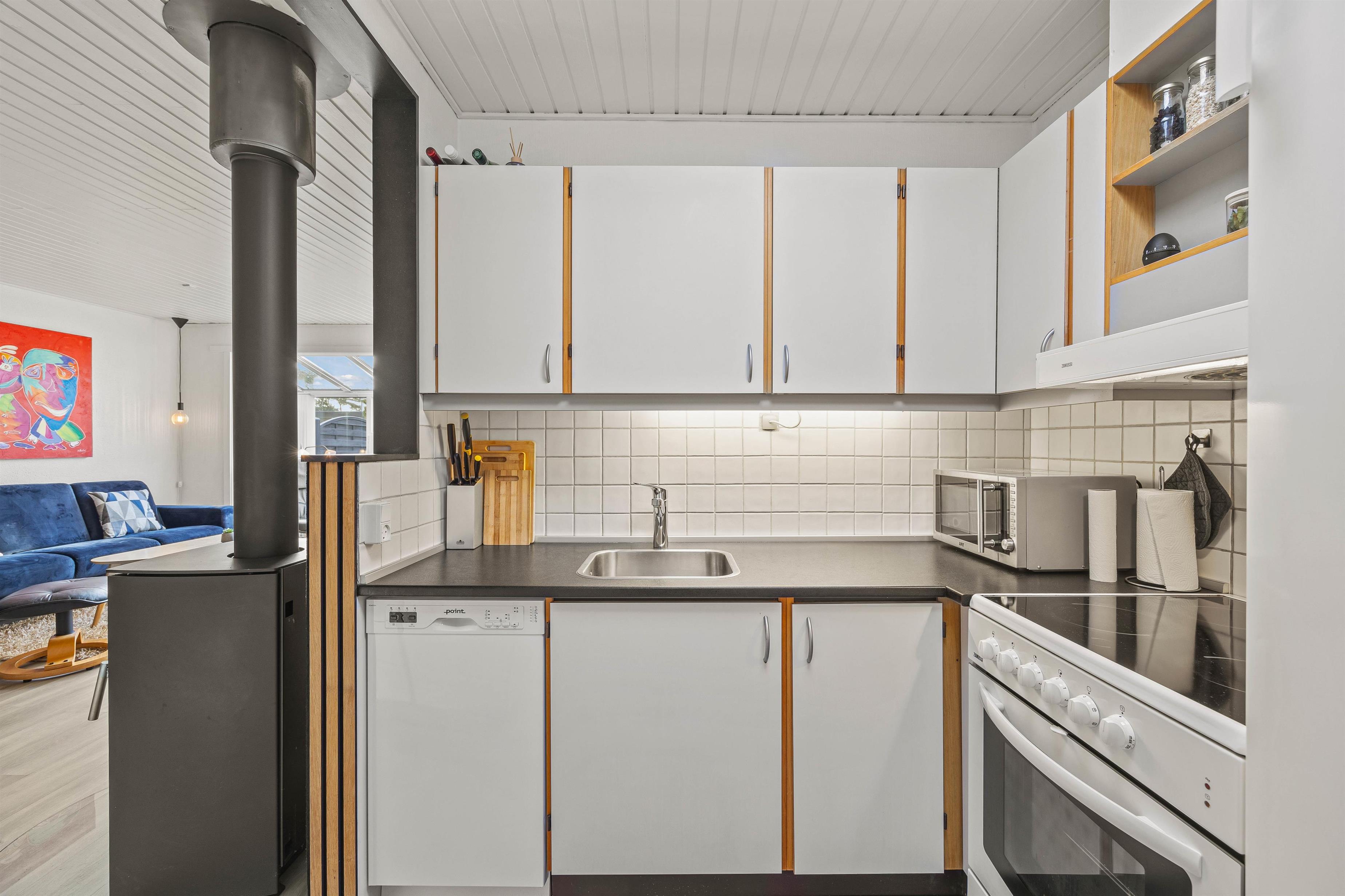 Sommerhusets hjerte er alrummet, og der er ingen tvivl om, at I vil tilbringe mange hyggelige feriestunder sammen her. I kan blandt andet samles foran tv’et til en god film eller sætte jer omkring spisebordet til et sjovt spil. I kan også gå sammen om madlavningen i køkkenet, hvor opvaskemaskinen klarer den efterfølgende opvask.