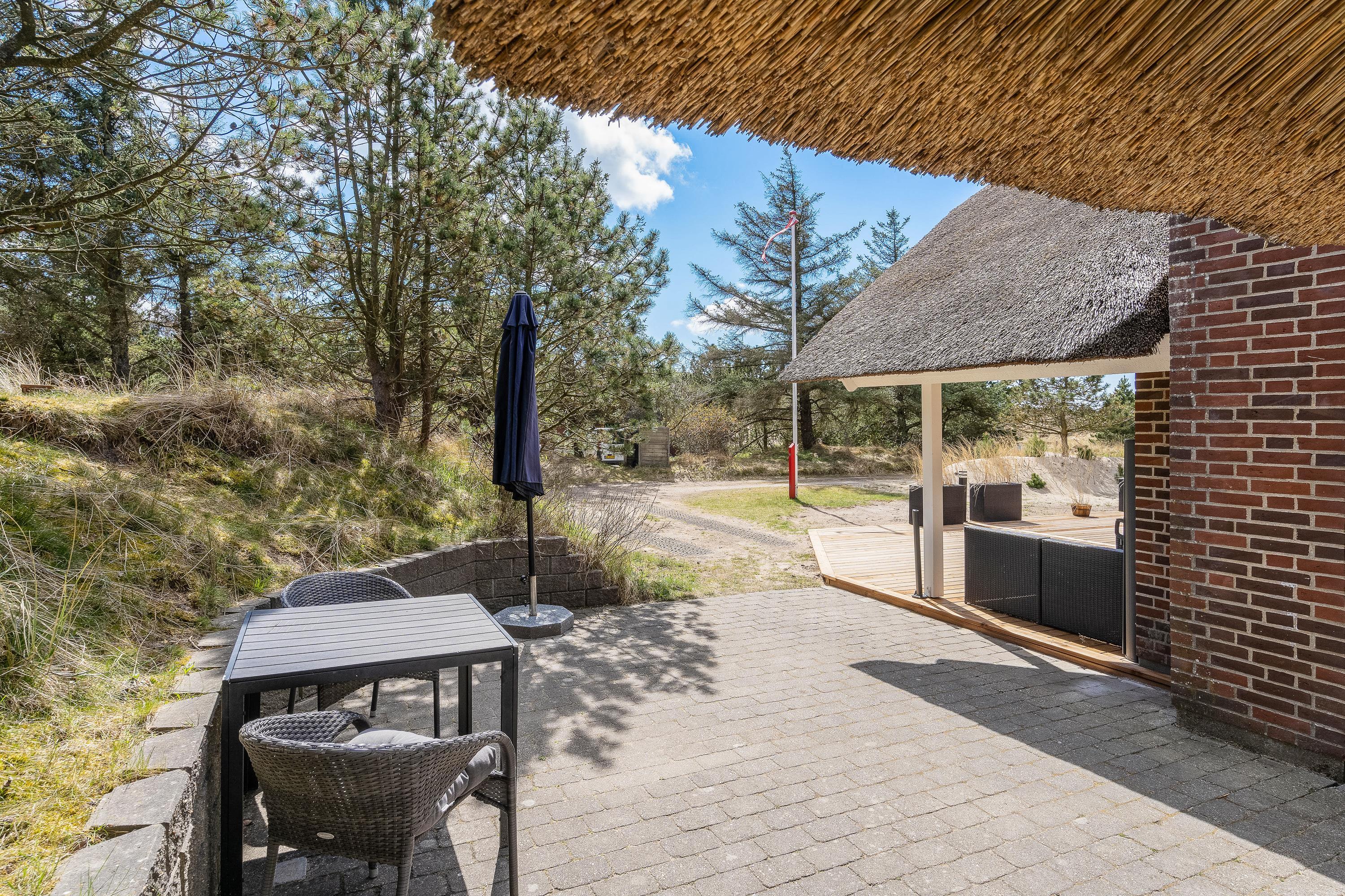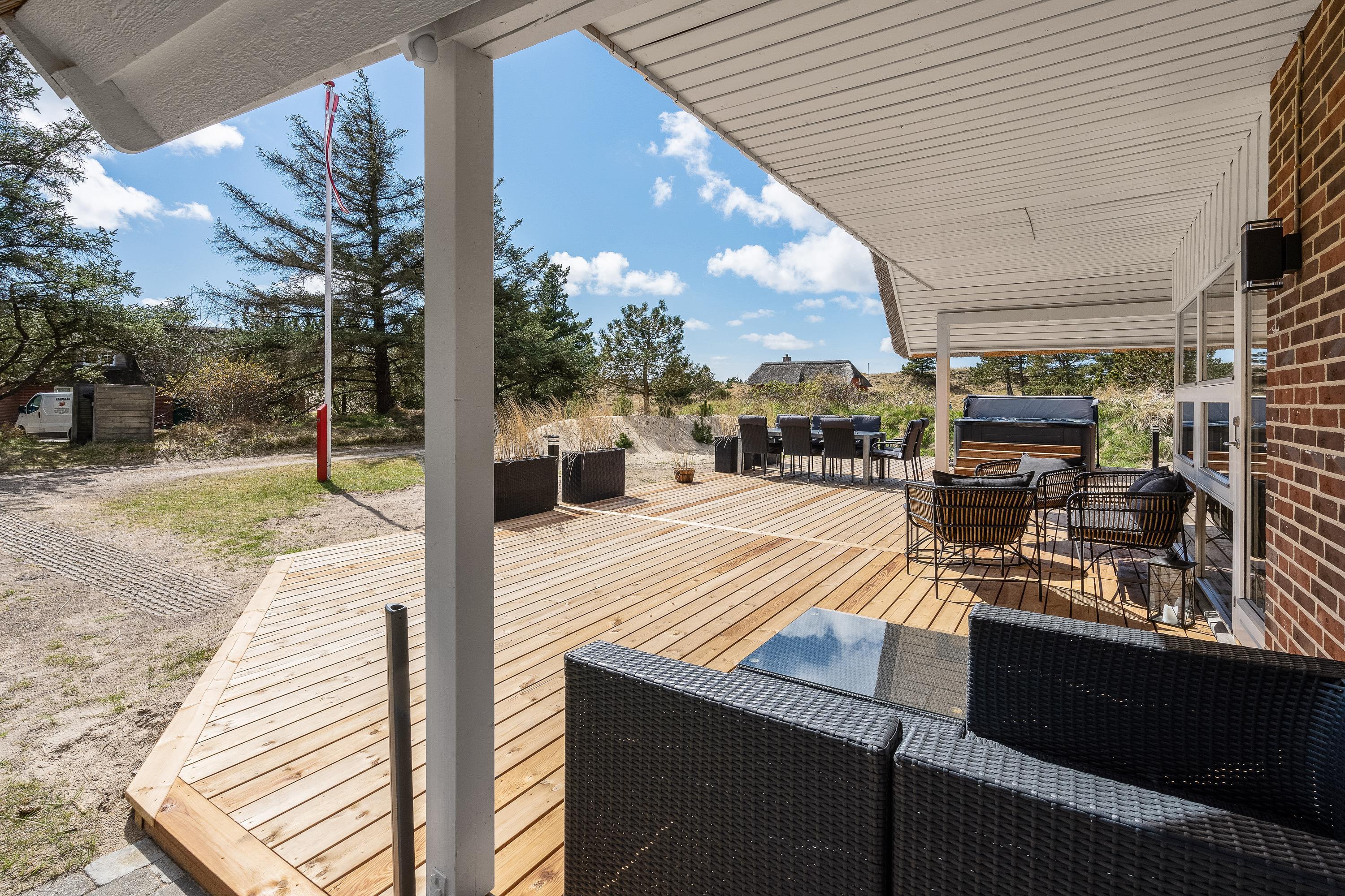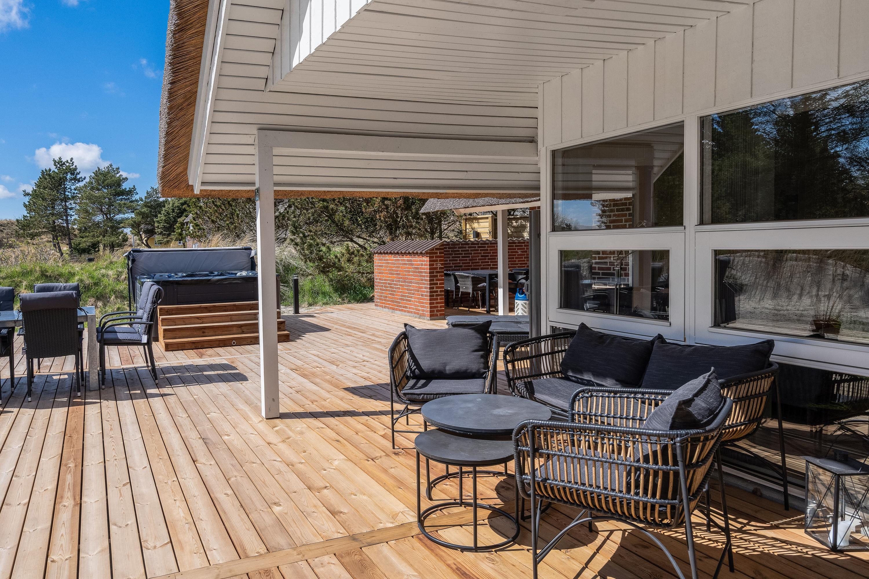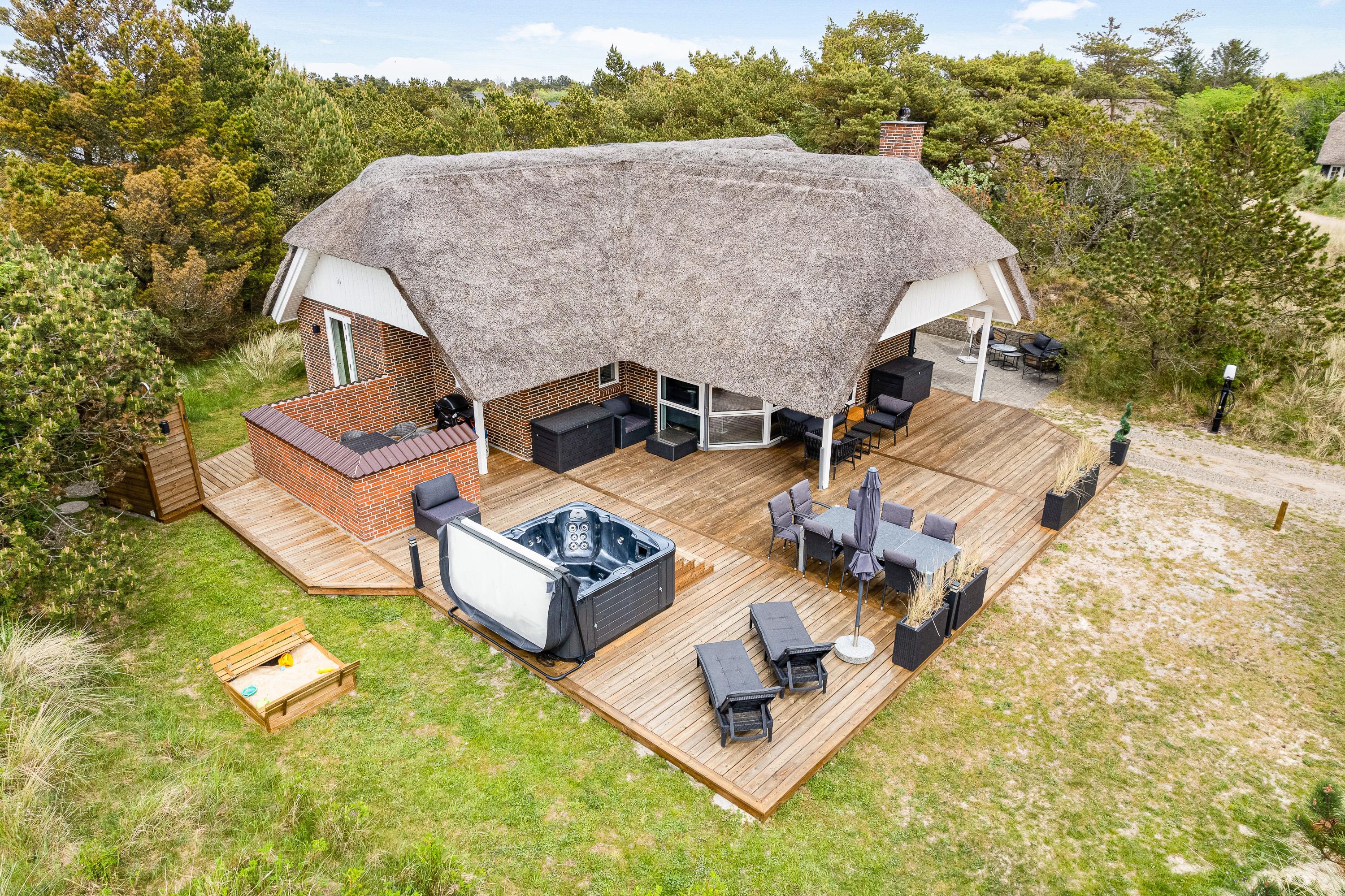 Sommerhuset ligger på en godt 1.500 kvadratmeter stor naturgrund, der er omgivet af høje træer og buskads, så I på ugeneret vis kan nyde den friske luft på terrassen. Den store træterrasse er både delvist afskærmet og overdækket, og det er også her, I finder endnu et af feriens højdepunkter – det lækre udendørs spabad med plads til 5 personer.
