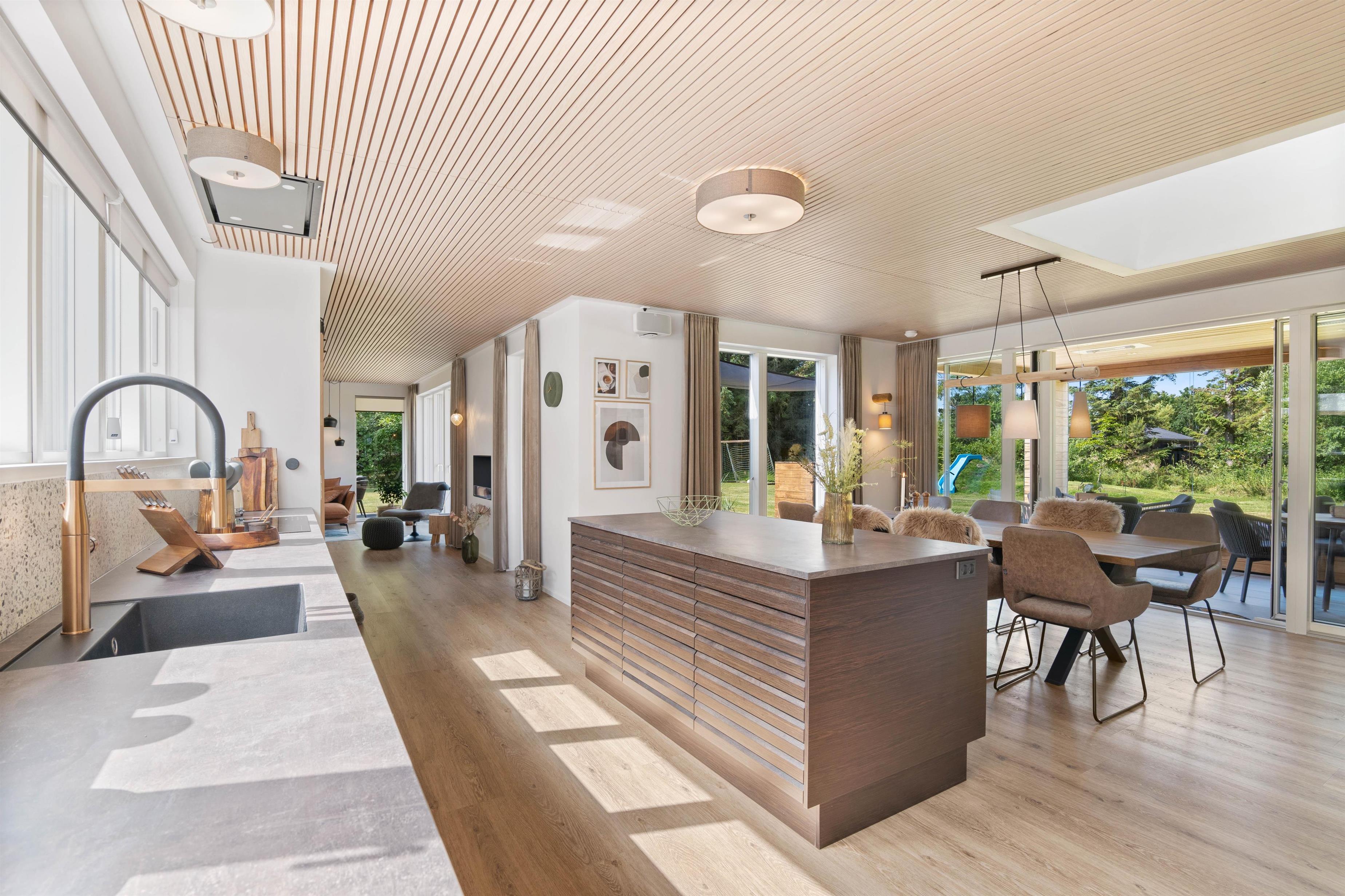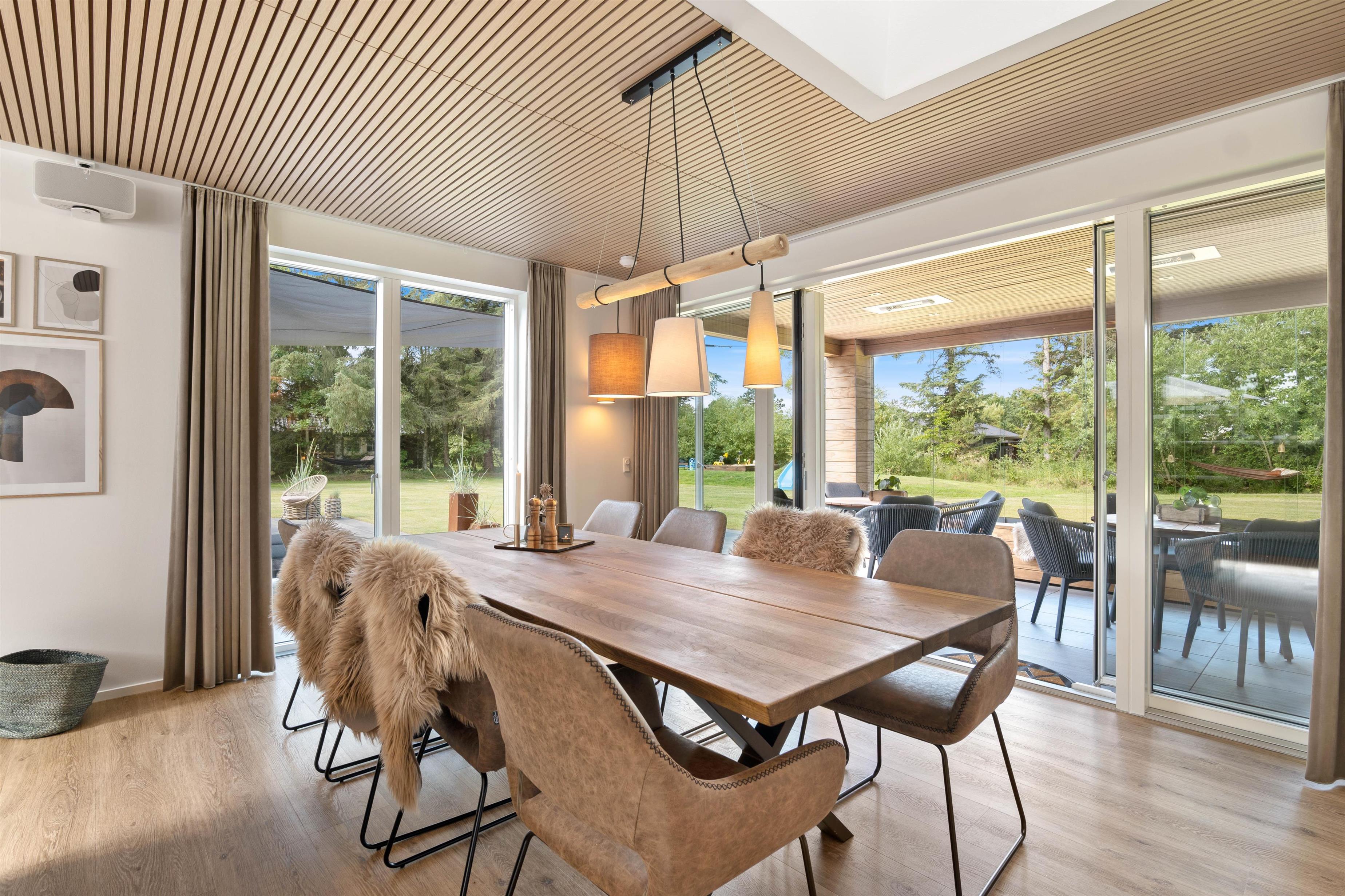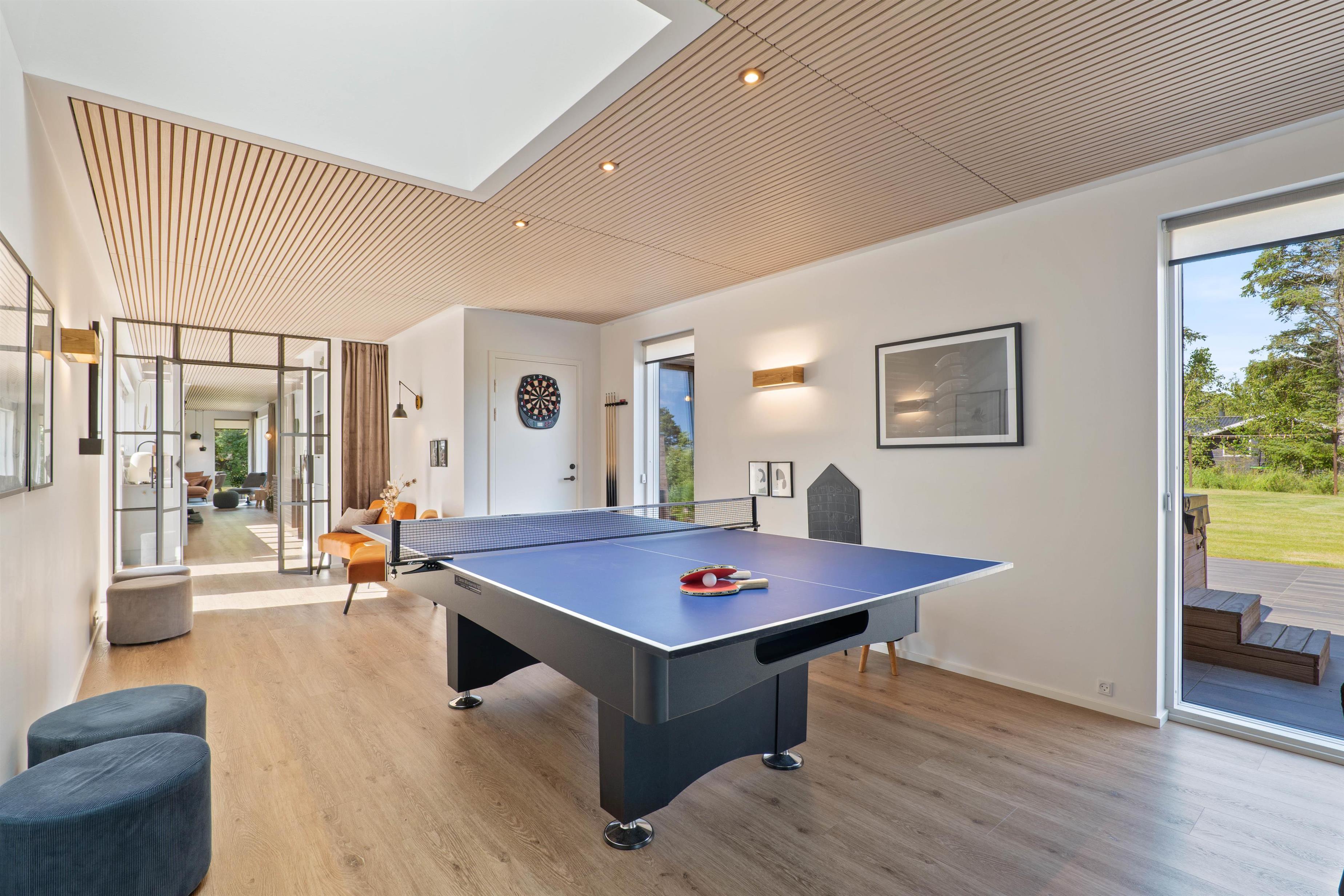 Foruden aktivitetsrum og fitnessrum er der i sommerhuset også et dejligt, lyst alrum, der forbinder køkkenet og spisepladsen med stuen, og hvor I helt sikkert vil tilbringe mange timer af jeres ferie med hele ferieflokken. Fra alrummet har I også et skønt udsyn til haven.