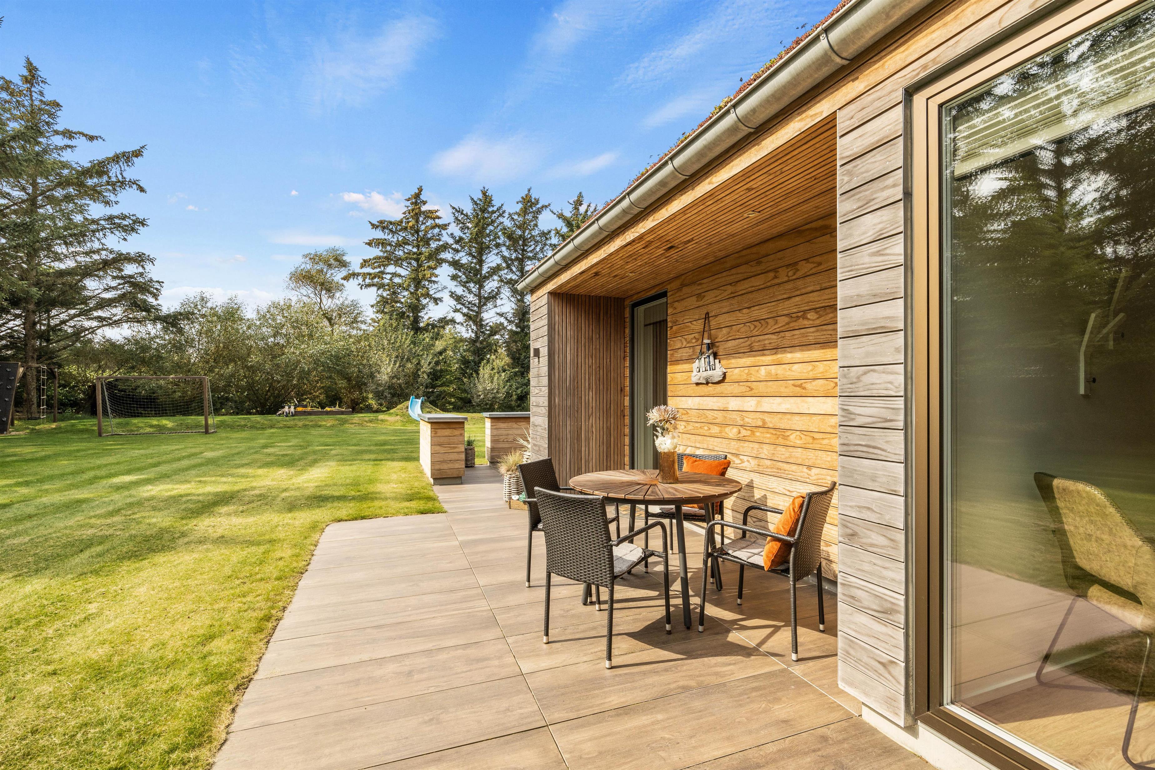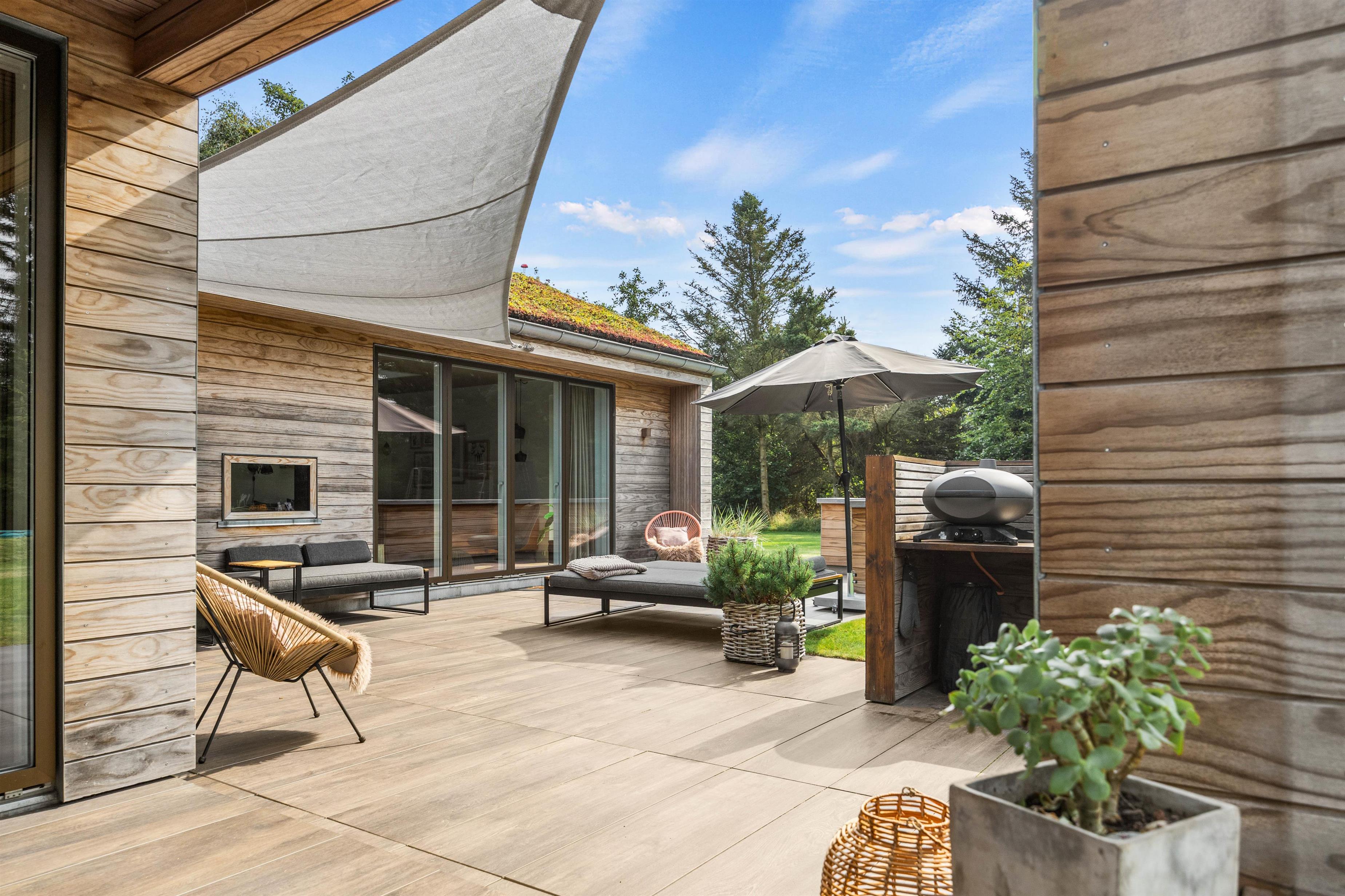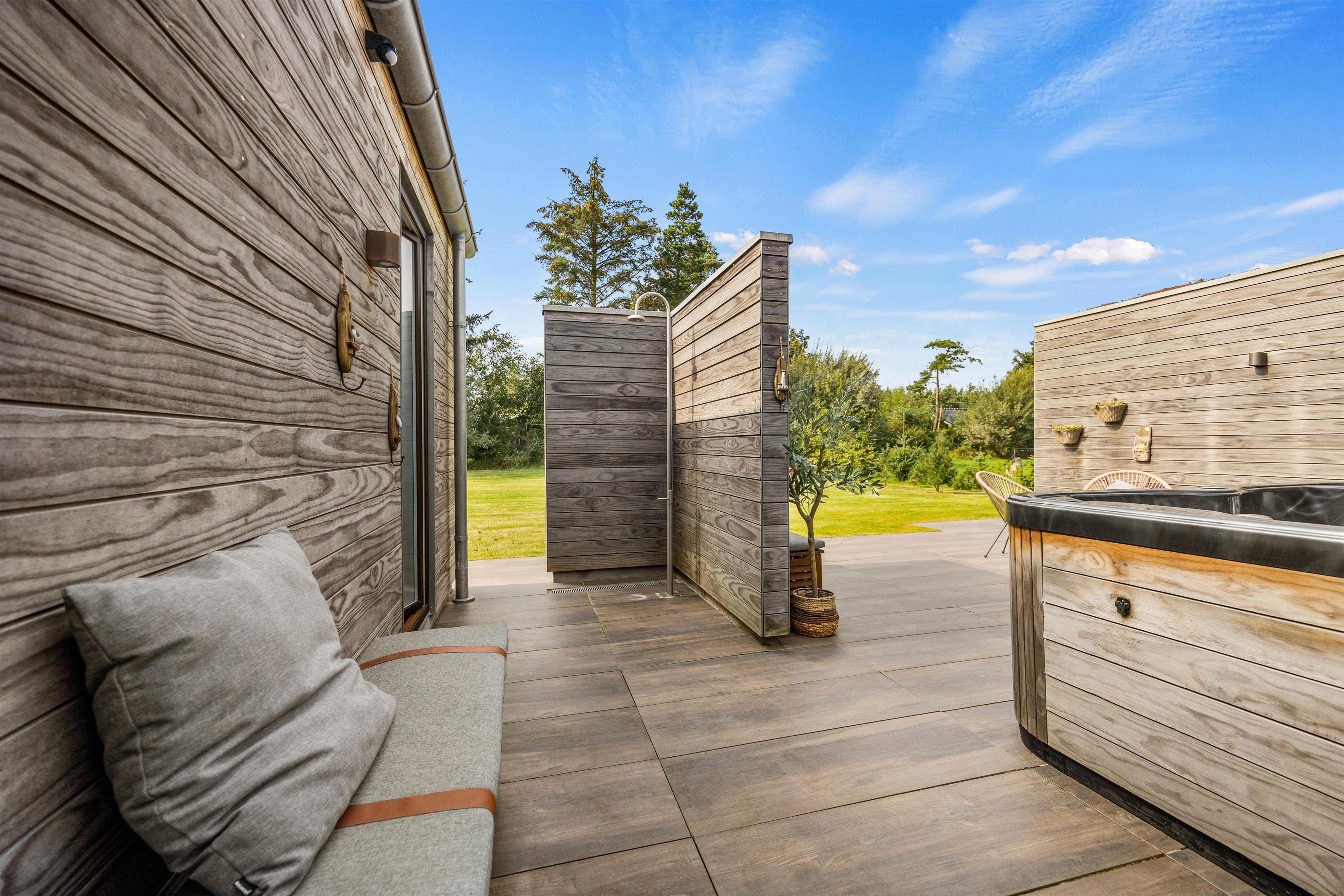 Sommerhuset har en stor, delvist overdækket terrasse, som I kan tilbringe de varme og solrige feriedage på. På terrassen har I også mulighed for at holde en wellness-session, for her står der både udespa, infrarødsauna og udendørs bruser klar til jer. Udebruseren kan benyttes fra 1. april til 31. oktober.