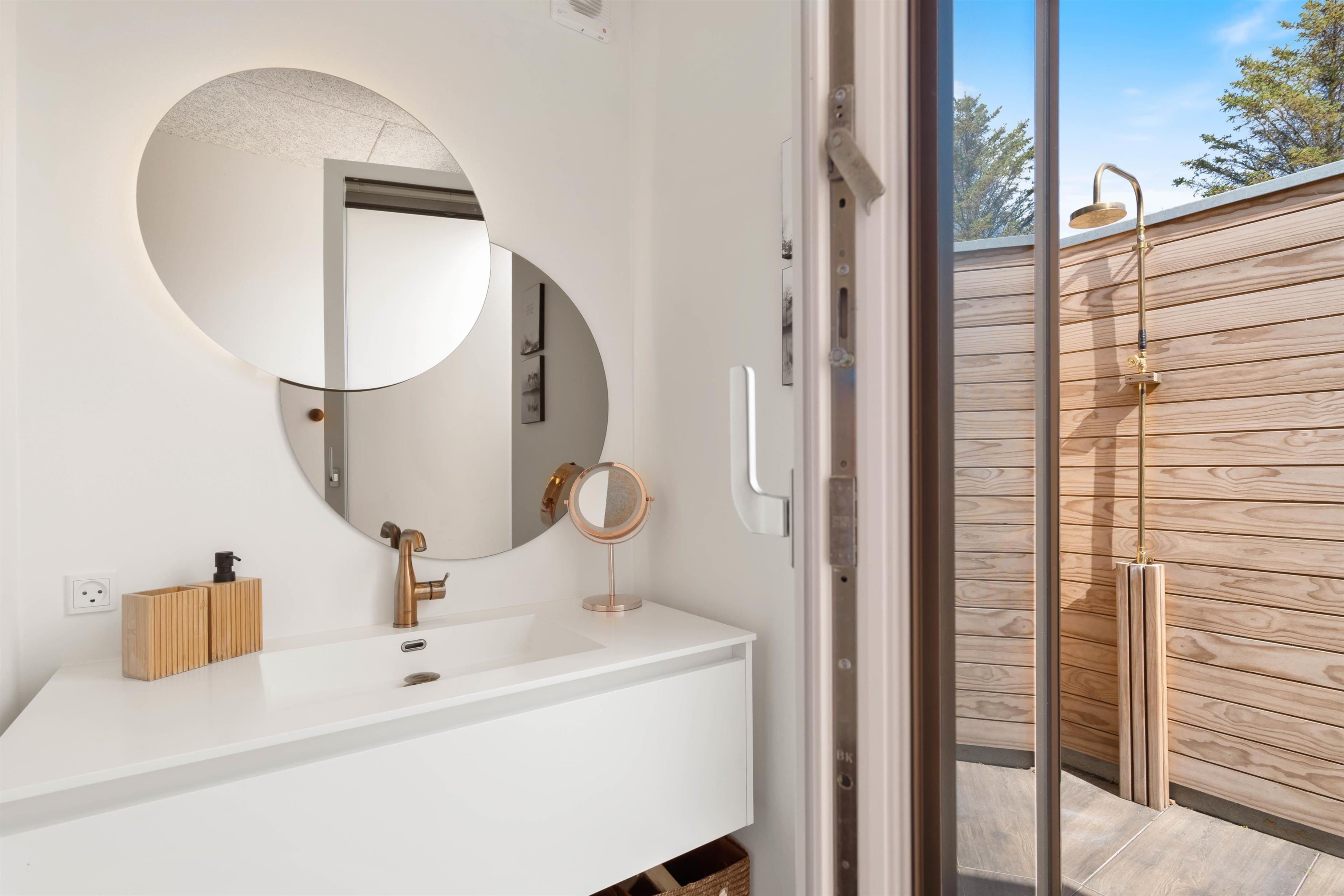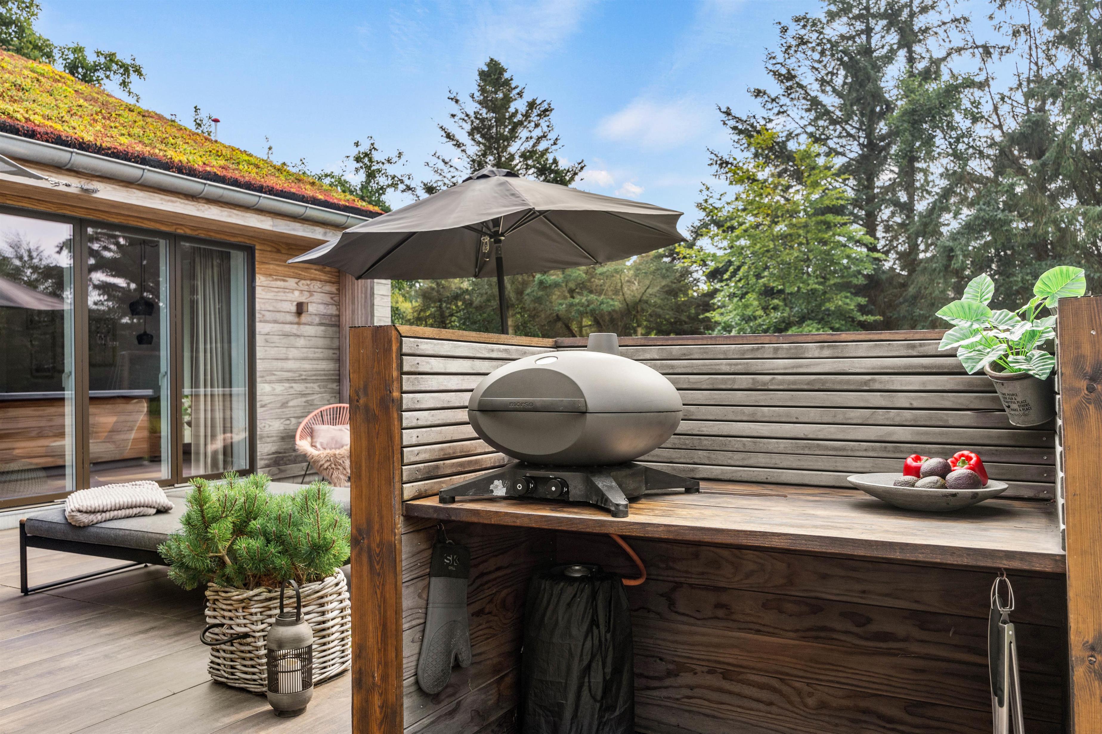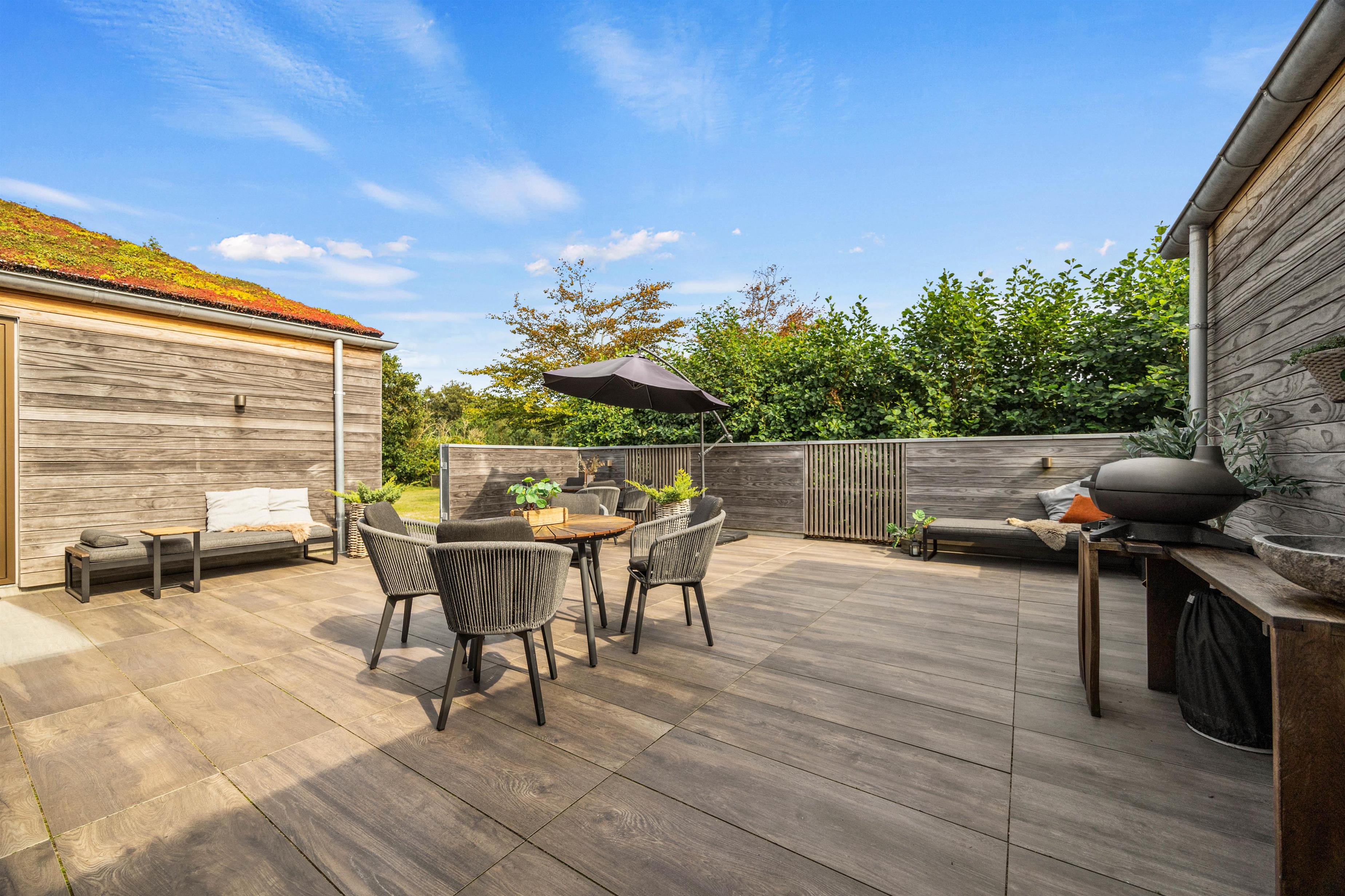 Sommerhuset har en stor, delvist overdækket terrasse, som I kan tilbringe de varme og solrige feriedage på. På terrassen har I også mulighed for at holde en wellness-session, for her står der både udespa, infrarødsauna og udendørs bruser klar til jer. Udebruseren kan benyttes fra 1. april til 31. oktober.