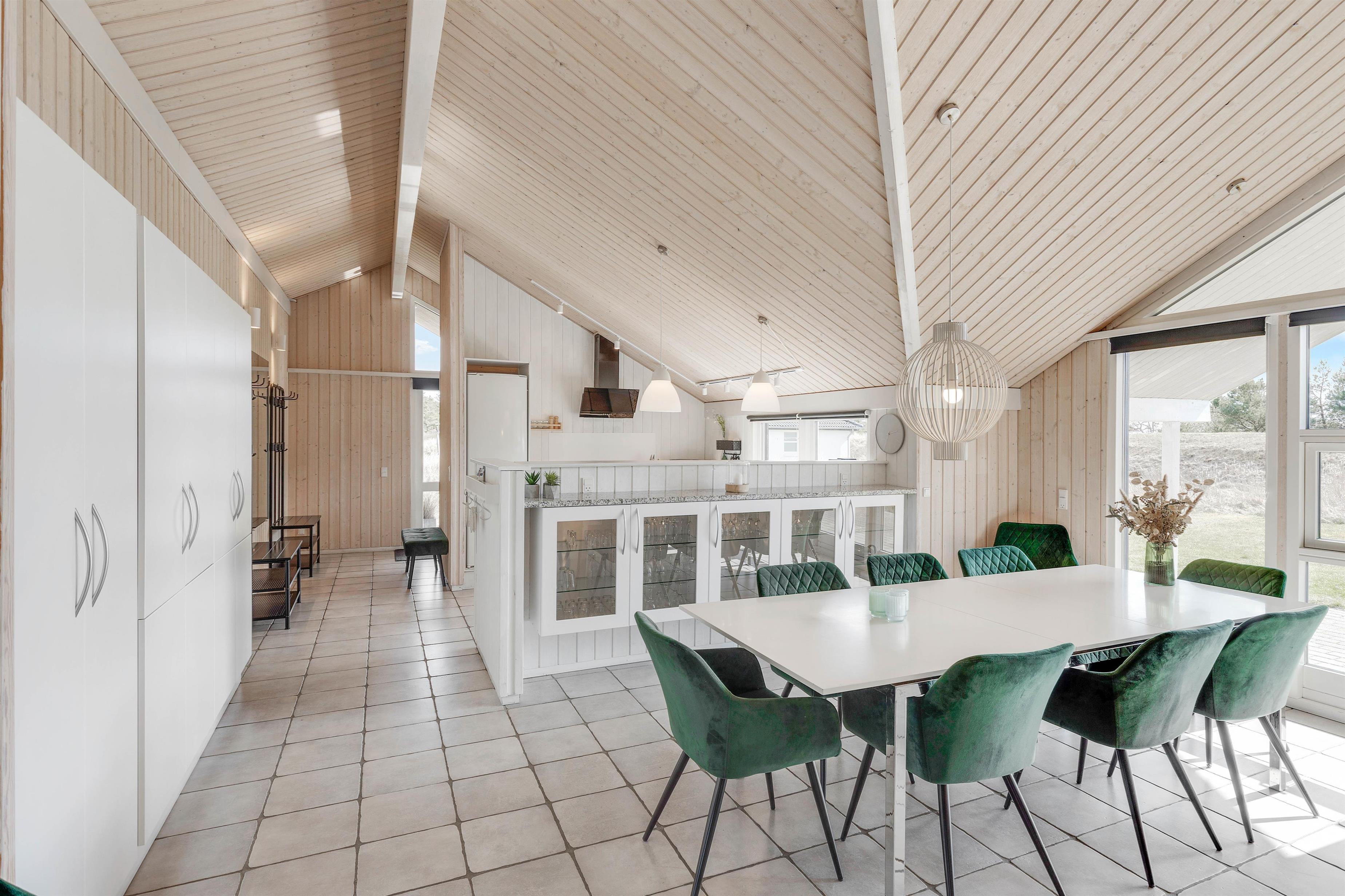 Hjertet i feriehuset er det store alrum, hvor køkken, spiseplads og stue er forenet. Her er der rig mulighed for, at I kan nyde hinandens selskab. Brændeovnen sætter prikken over i’et for feriestemningen med sin knitren og varme.