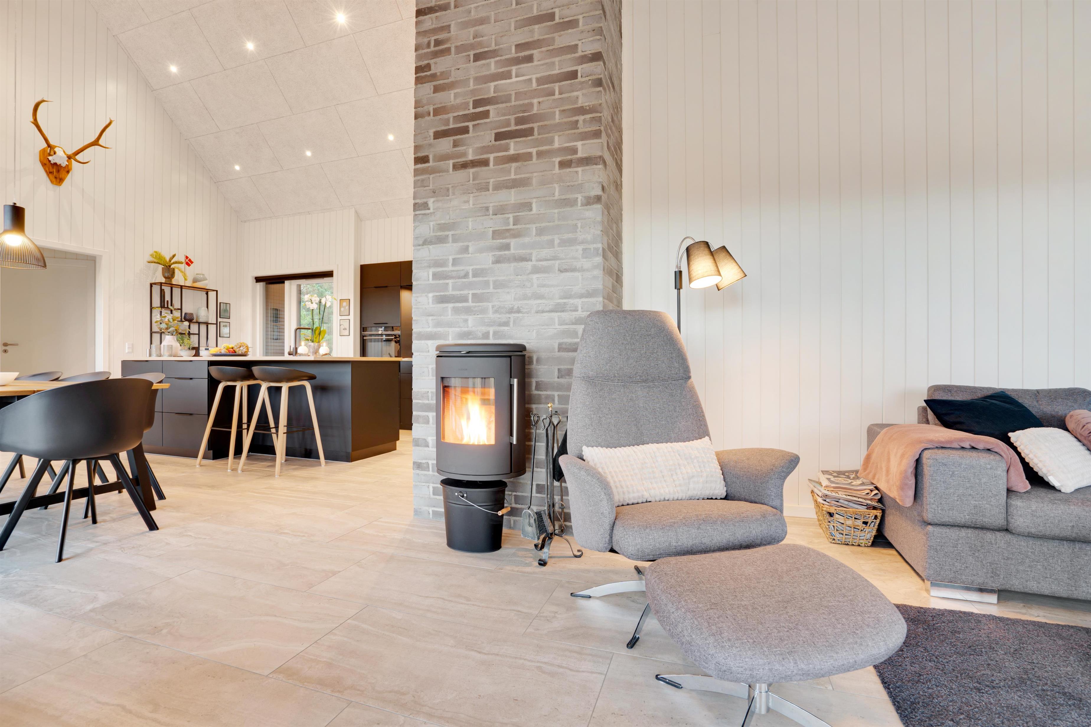 Det stråtækte luksussommerhus er opført i 2019, og den stilfulde indretning med sans for både detaljer og kvalitet vil falde i selv den mest kræsne feriegæsts smag. Loft til kip får omgivelserne til at syne endnu større, og de træbeklædte vægge gør, at I stadig får fornemmelsen af ægte sommerhushygge – også hjulpet på vej af den charmerende alkove i køkkenalrummet og den klassiske brændeovn. Fra de store vinduespartier i alrummet har I en skøn udsigt til den omkringliggende natur.