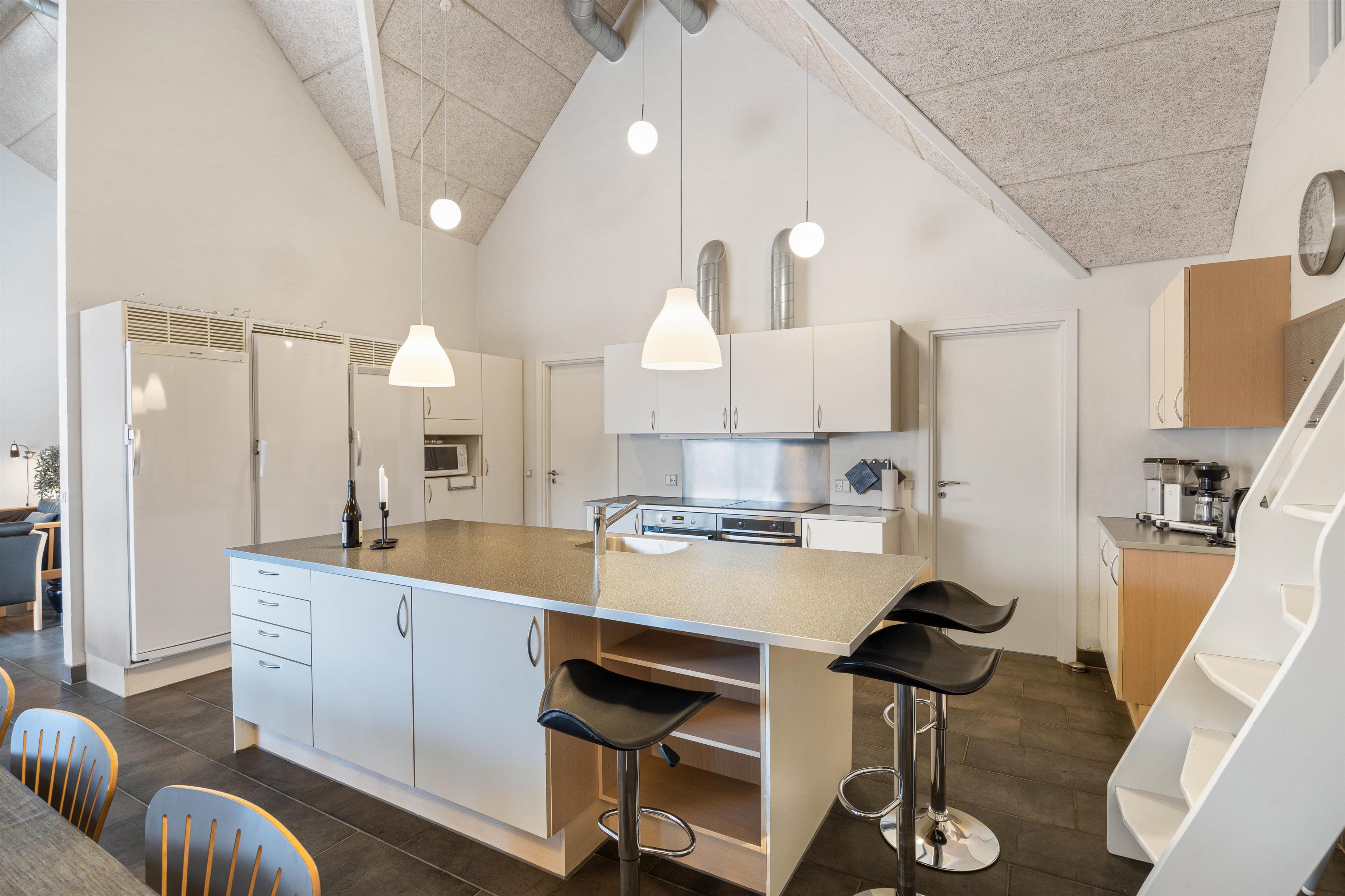 Sommerhuset er 305 kvadratmeter stort, og her venter jer en rummelig indretning med god plads til alle gæster. Sommerhusets køkken, stue og spiseplads udgør alrummet, hvor I kan samles til lækre måltider, gode film i tv’et og sjove spil ved bordet, mens brændeovnen fuldender stemningen med sine knitrende flammer i baggrunden. Fra alrummet kan I også gå op til en hyggelig tv-stue.
