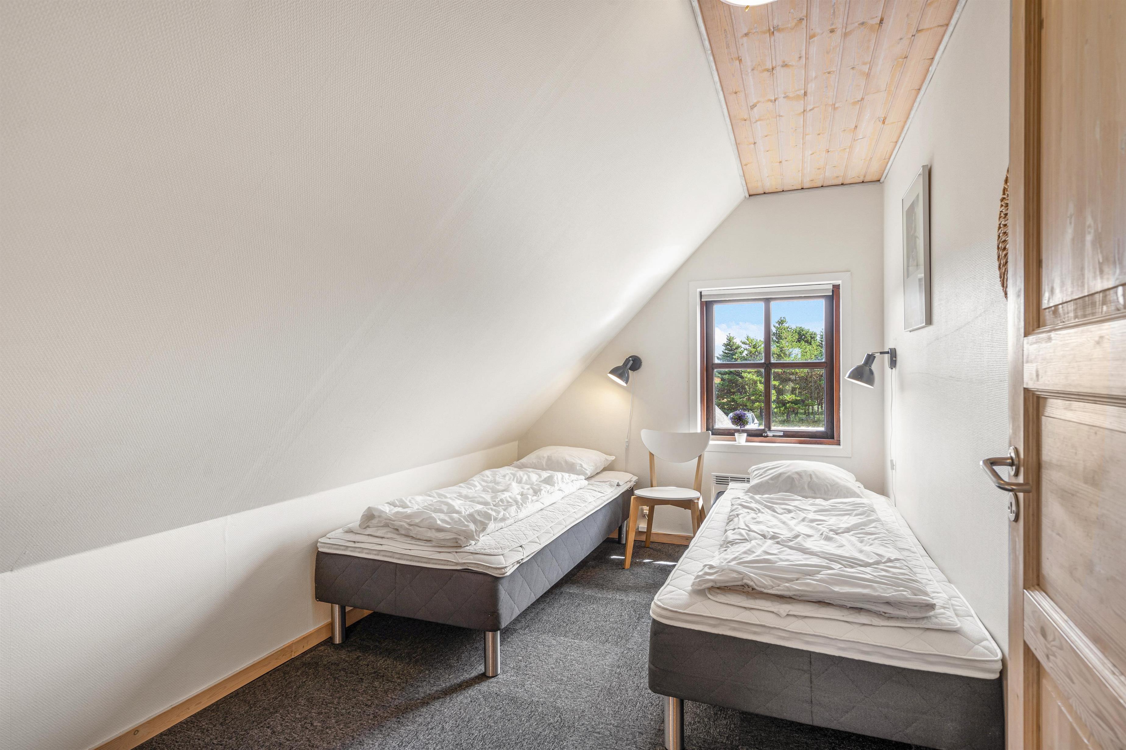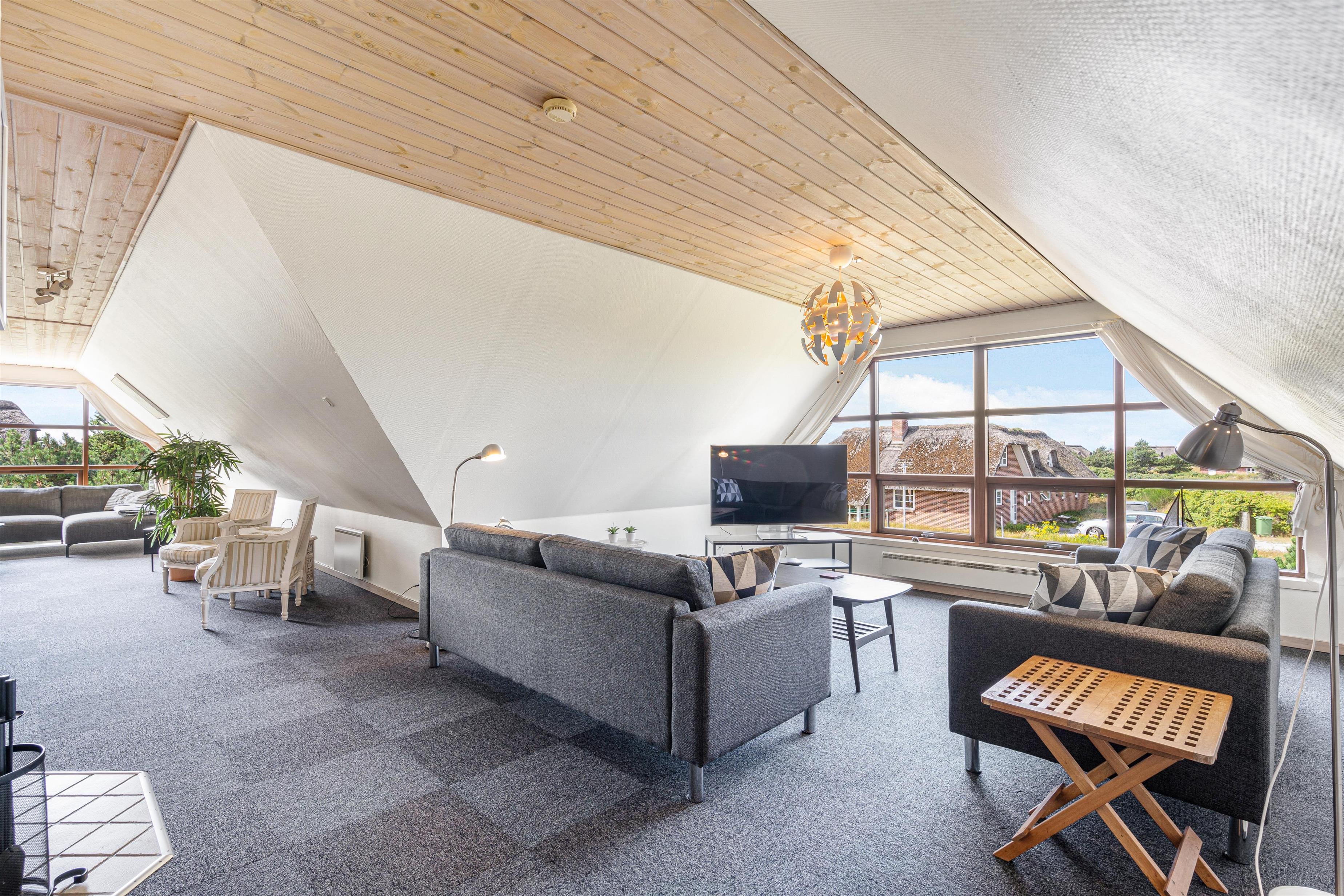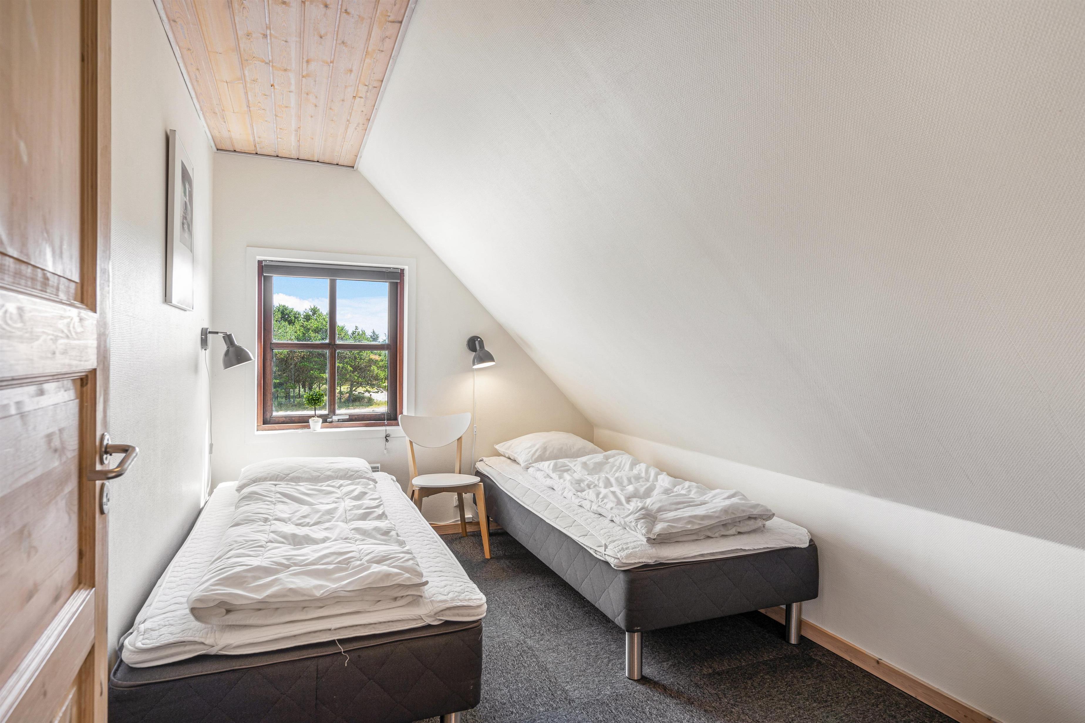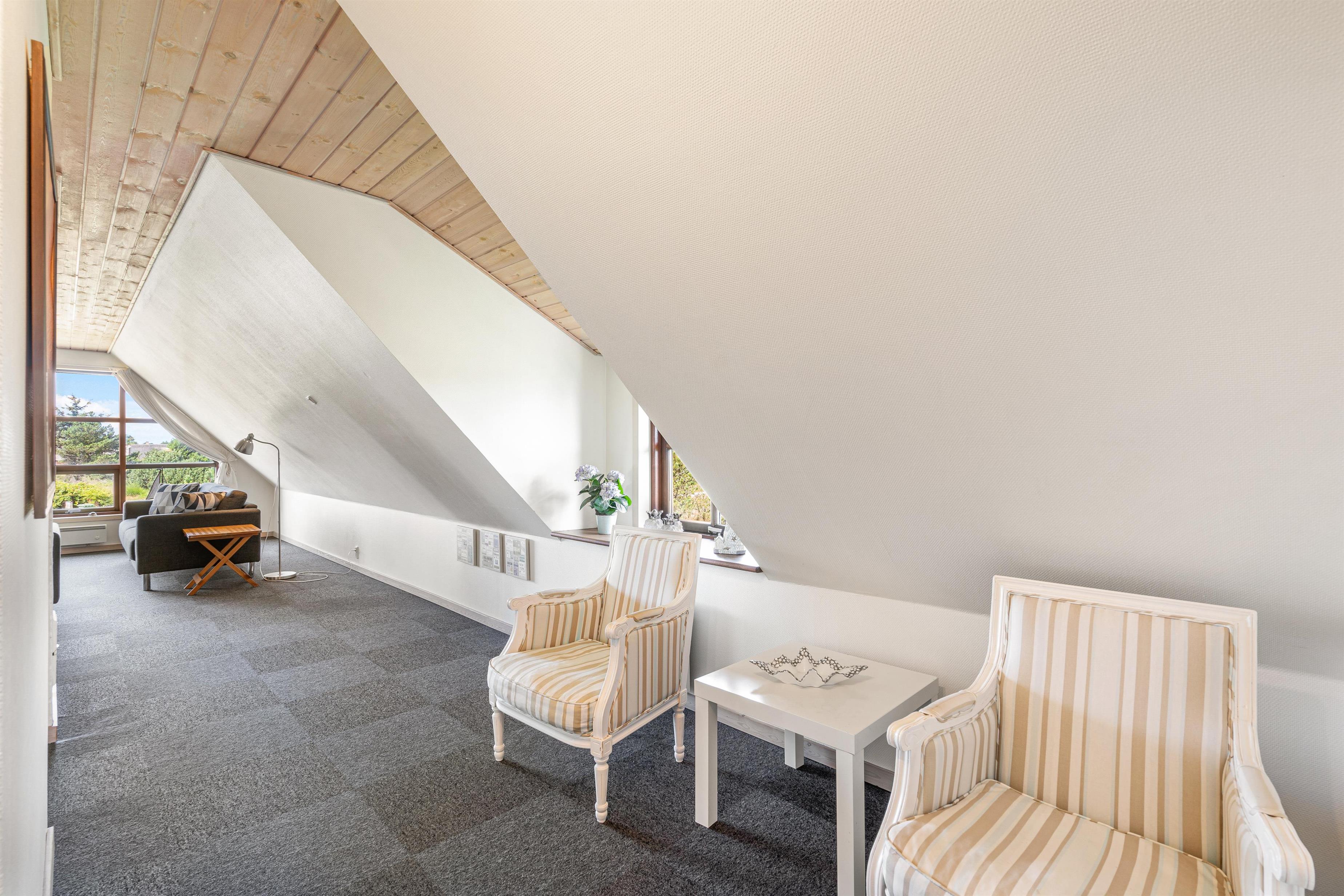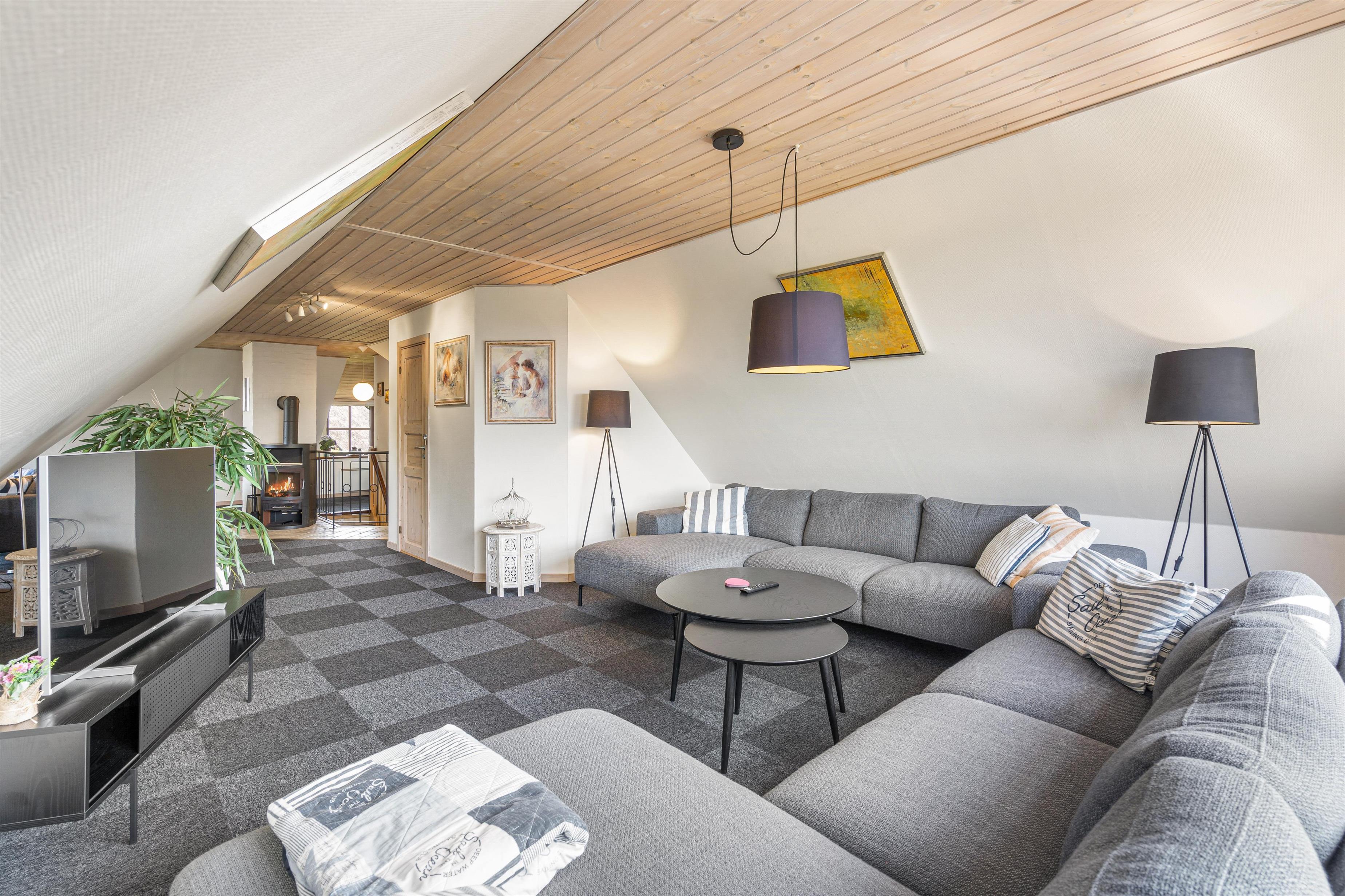 I kan også tilbringe hyggelige feriestunder på sommerhusets førstesal, hvor der venter jer en stor vinkelstue, der har en smuk udsigt over sommerhusetområdet samt en flot udsigt mod Blåvand Fyr. Her kan I også nyde solnedgangen i fyrtårnets skær om aftenen.