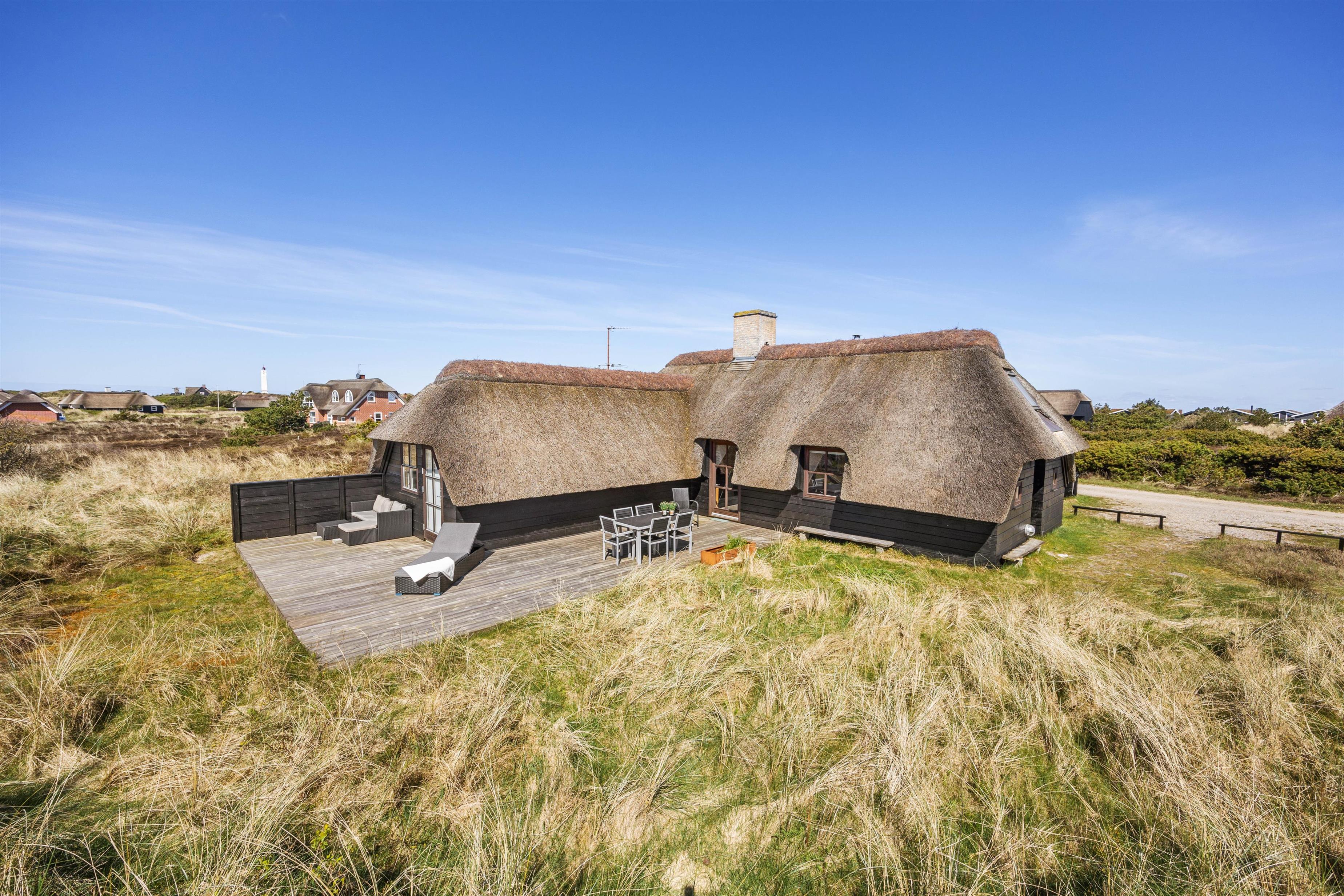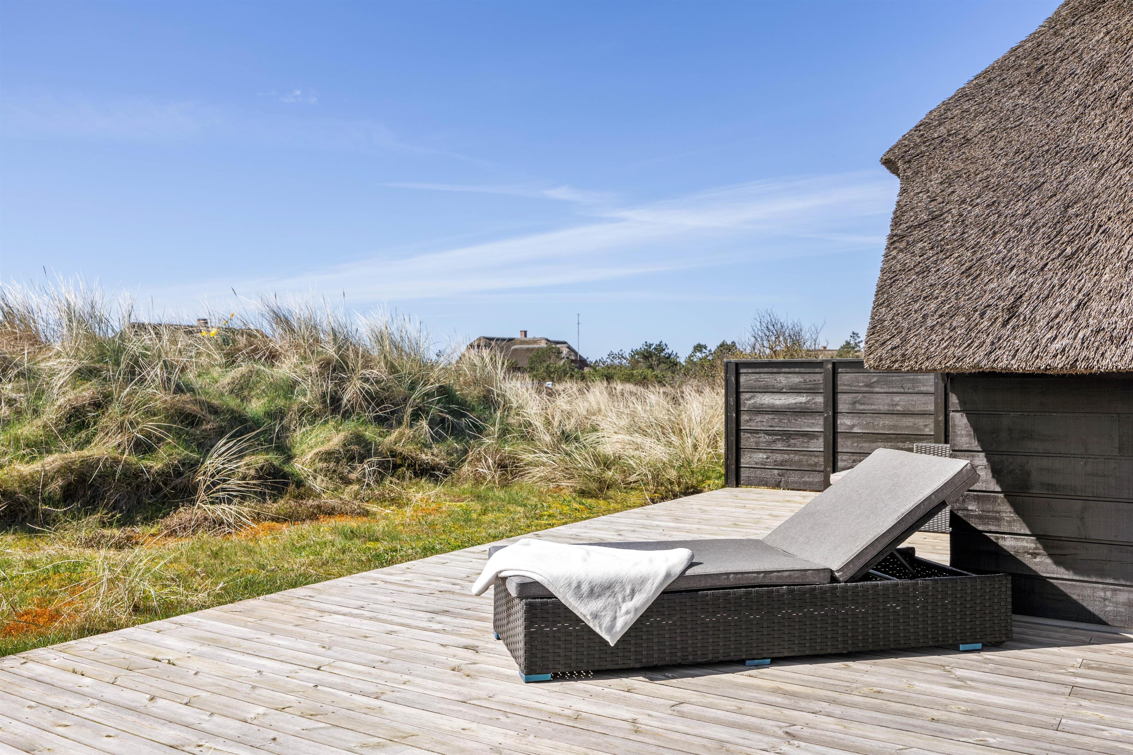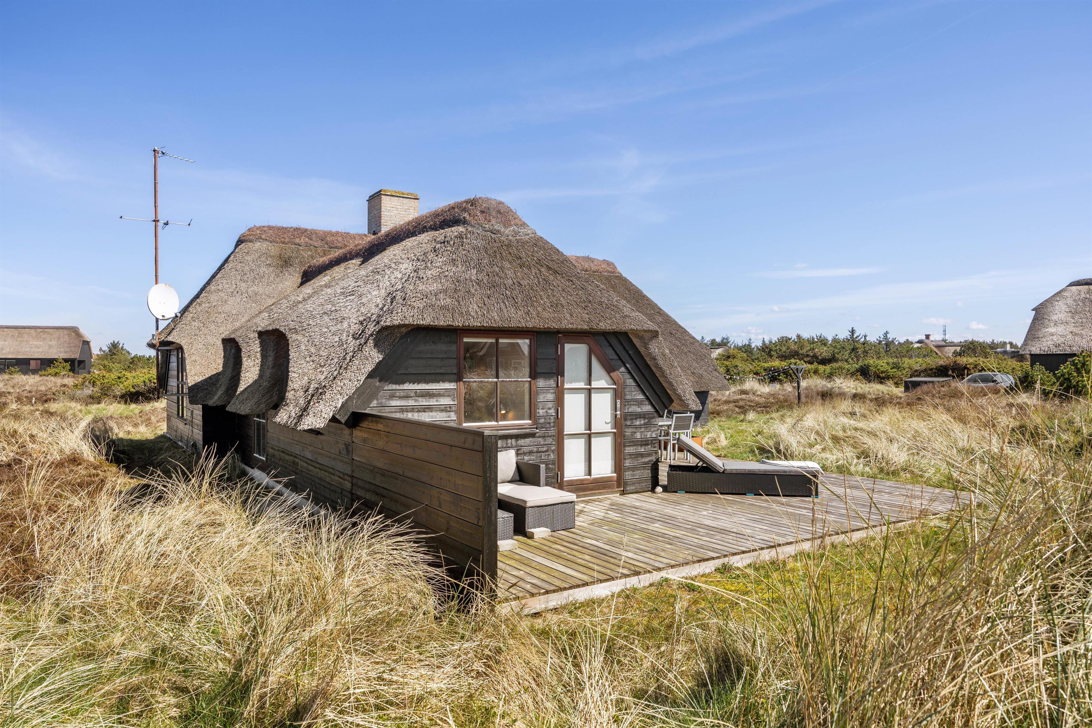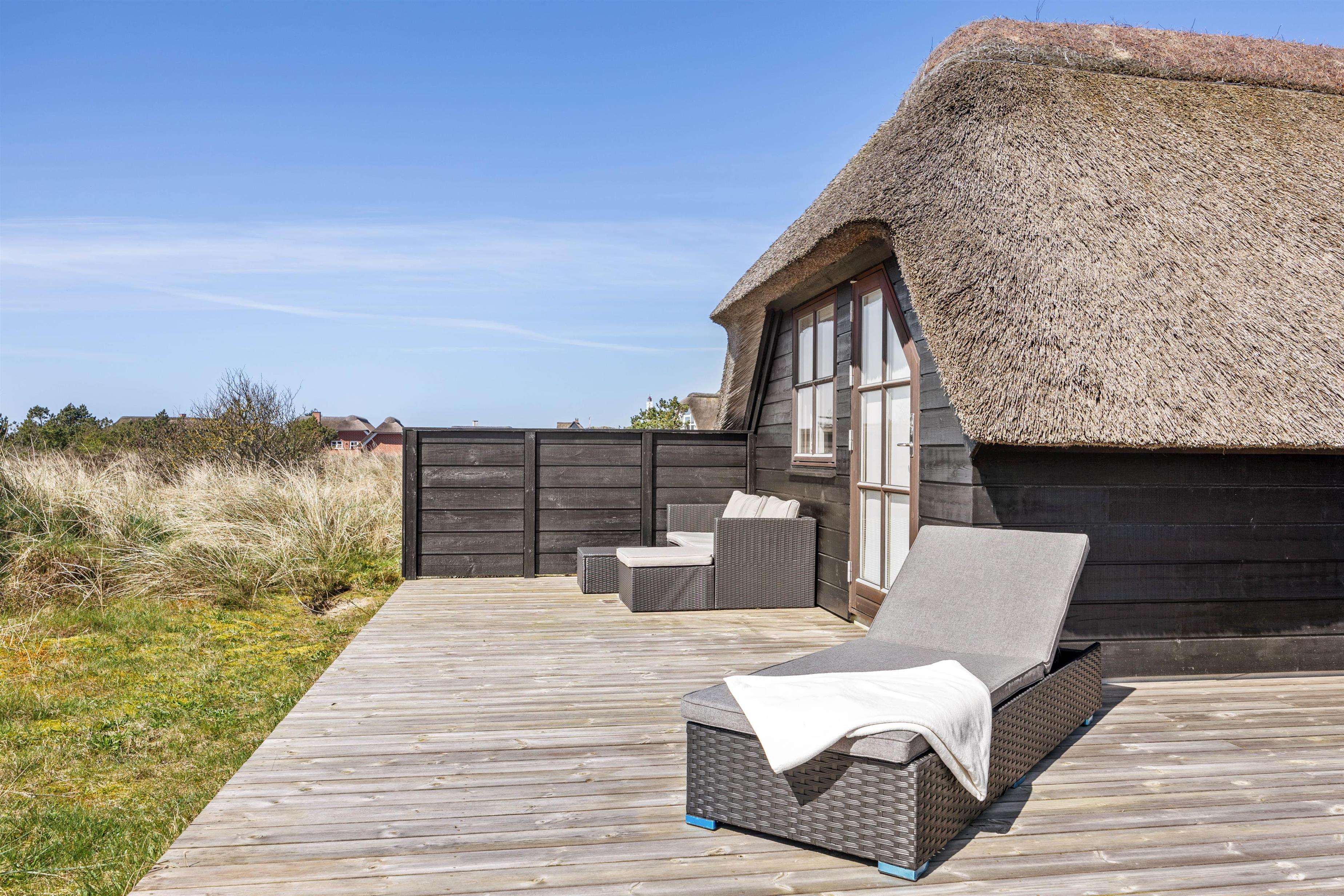 Sommerhuset ligger på en naturskøn grund med lyng, og ud mod sydøst er der en dejlig træterrasse med havemøbler, hvor I kan nyde morgenkaffen eller en middag fra grillen. Den friske havluft og lyden af Vesterhavet, som kun ligger 200 meter væk, giver ferien en helt særlig stemning. Om aftenen kan I opleve solnedgangen male himlen i smukke farver – et perfekt øjeblik til et glas vin i godt selskab.