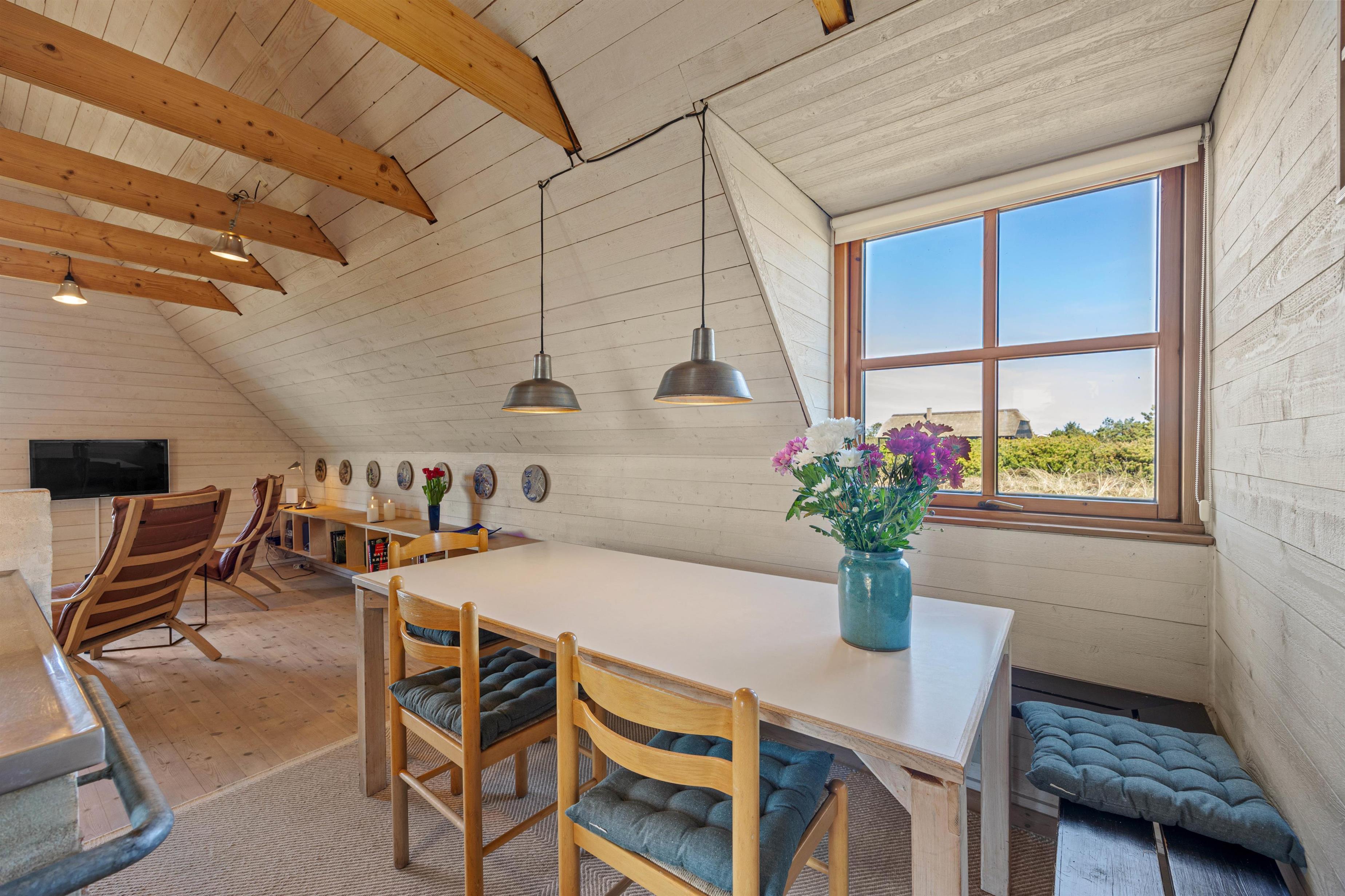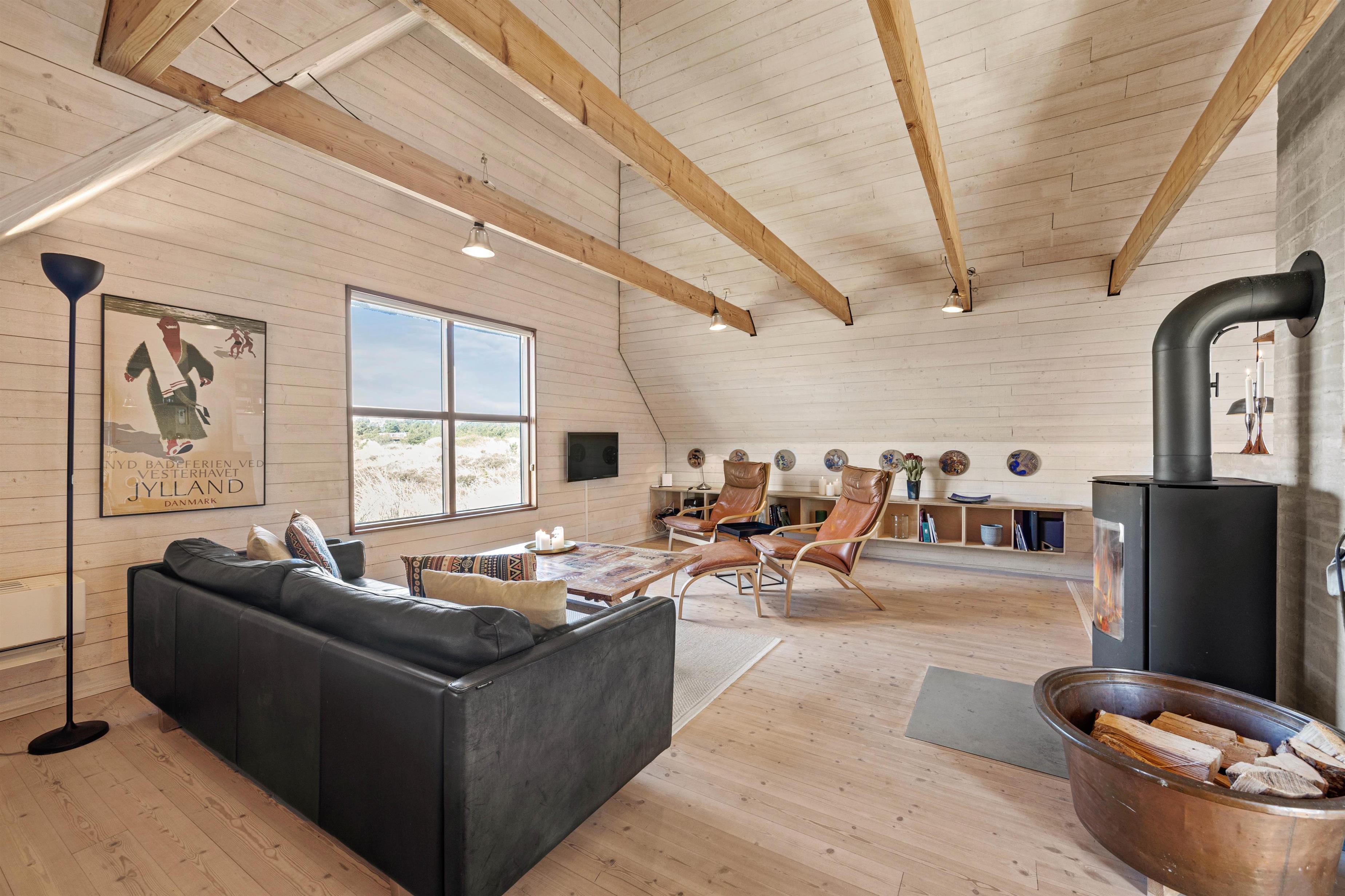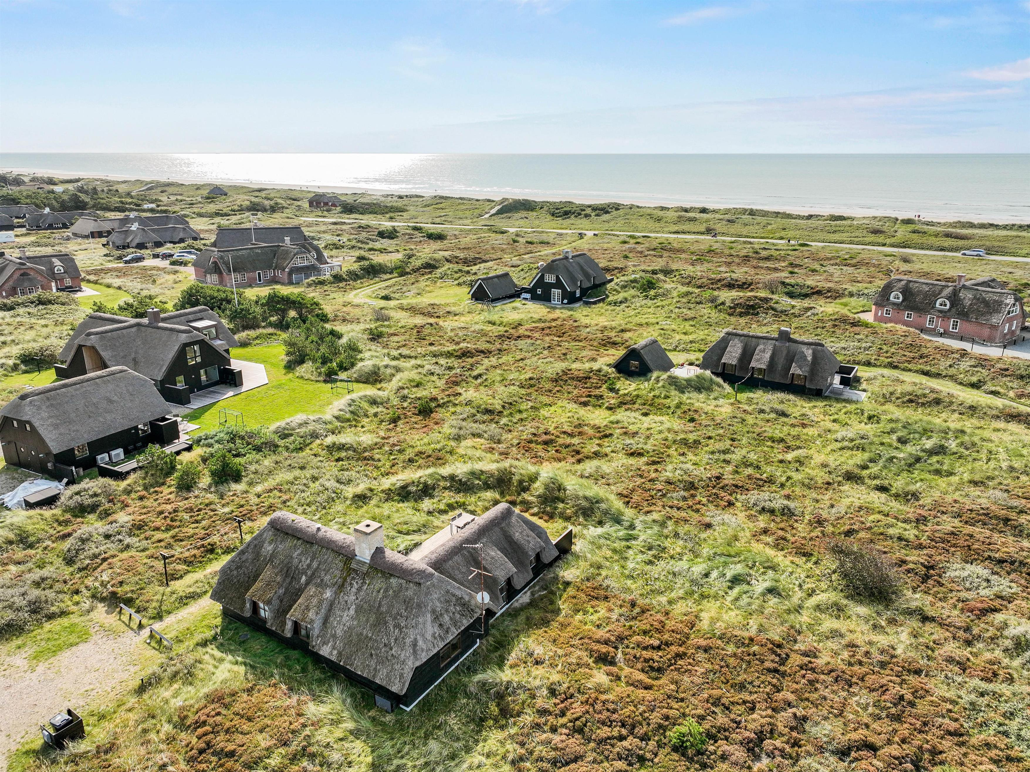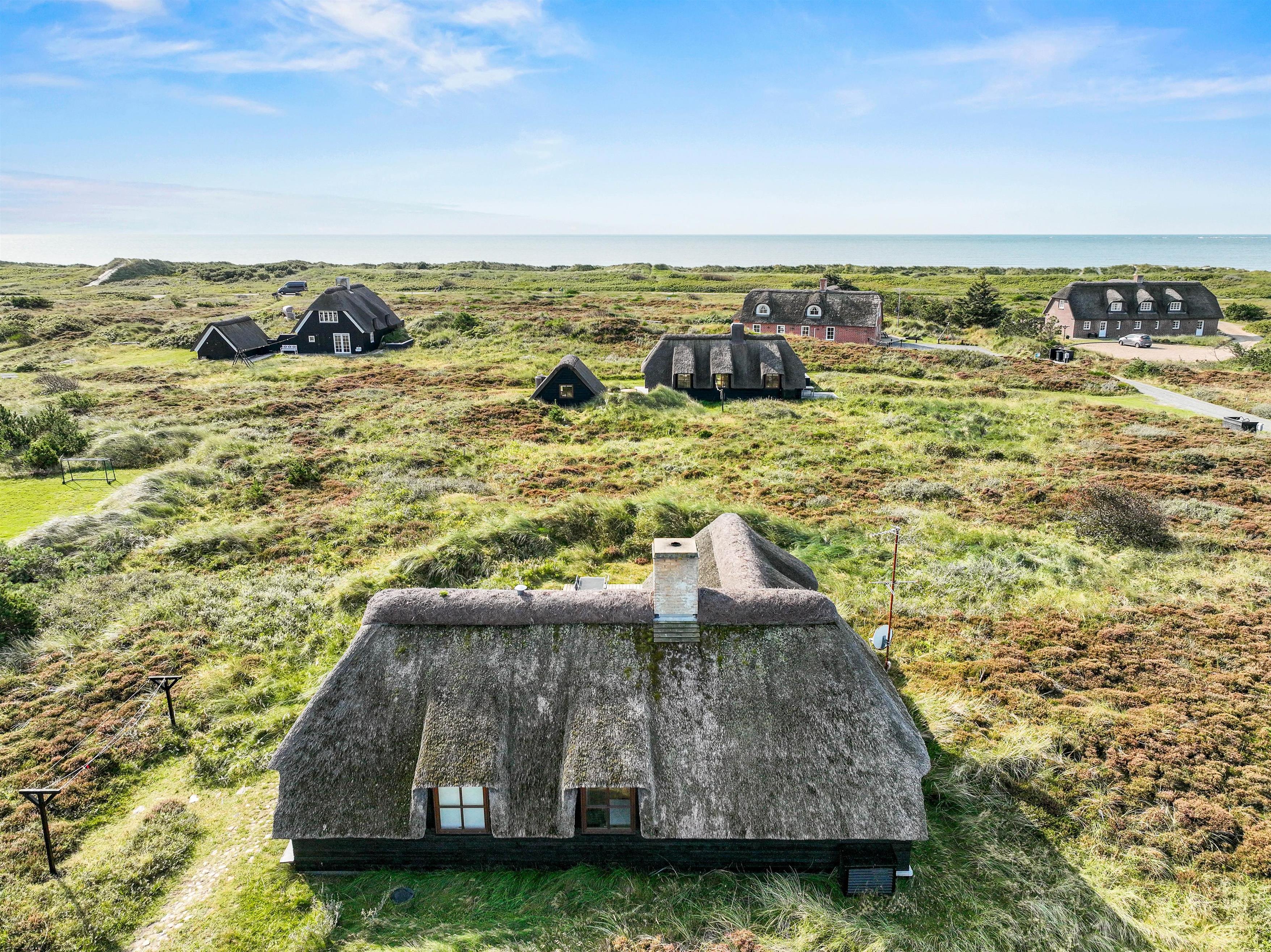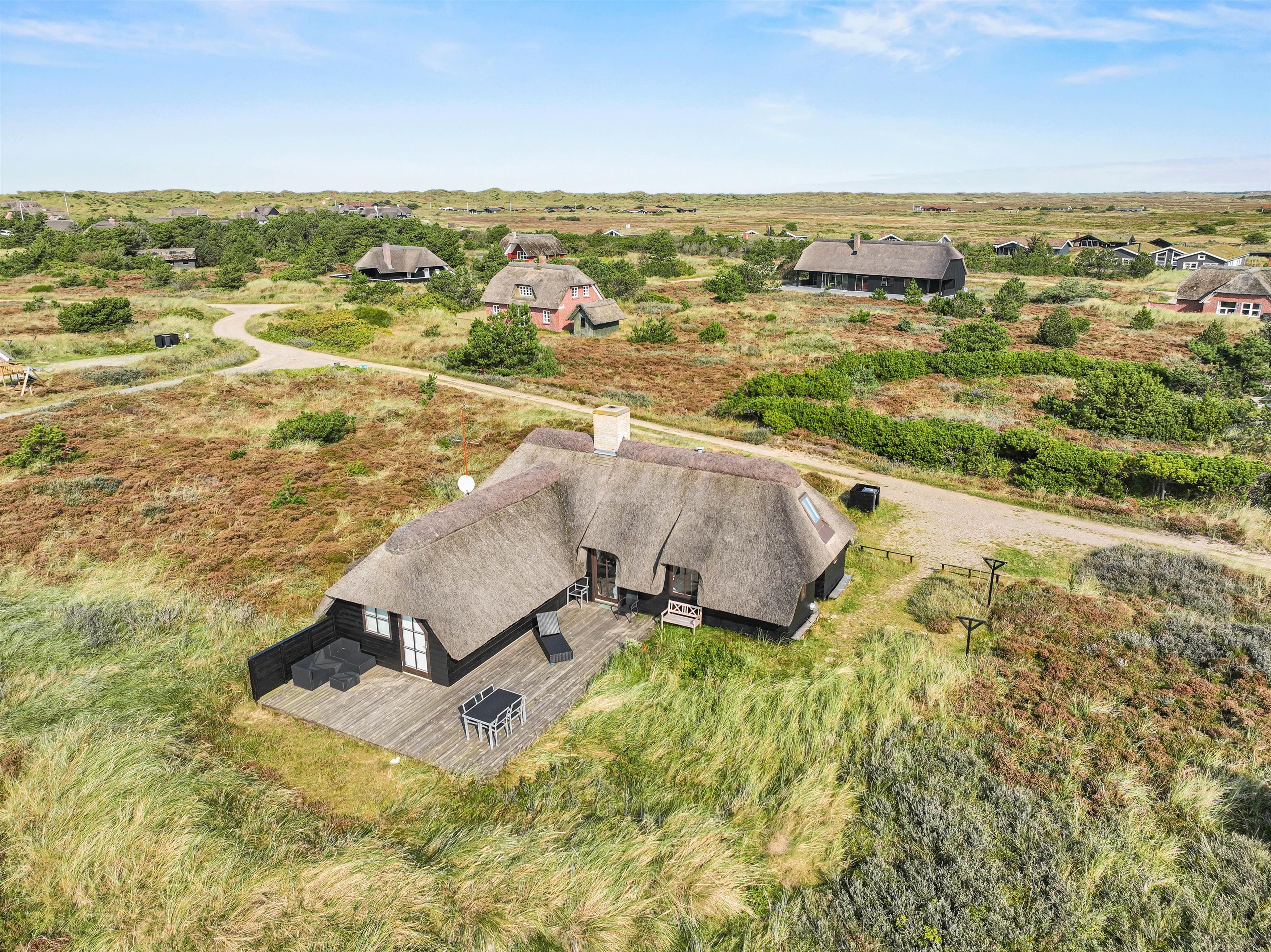Sommerhuset ligger på en naturskøn grund med lyng, og ud mod sydøst er der en dejlig træterrasse med havemøbler, hvor I kan nyde morgenkaffen eller en middag fra grillen. Den friske havluft og lyden af Vesterhavet, som kun ligger 200 meter væk, giver ferien en helt særlig stemning. Om aftenen kan I opleve solnedgangen male himlen i smukke farver – et perfekt øjeblik til et glas vin i godt selskab.