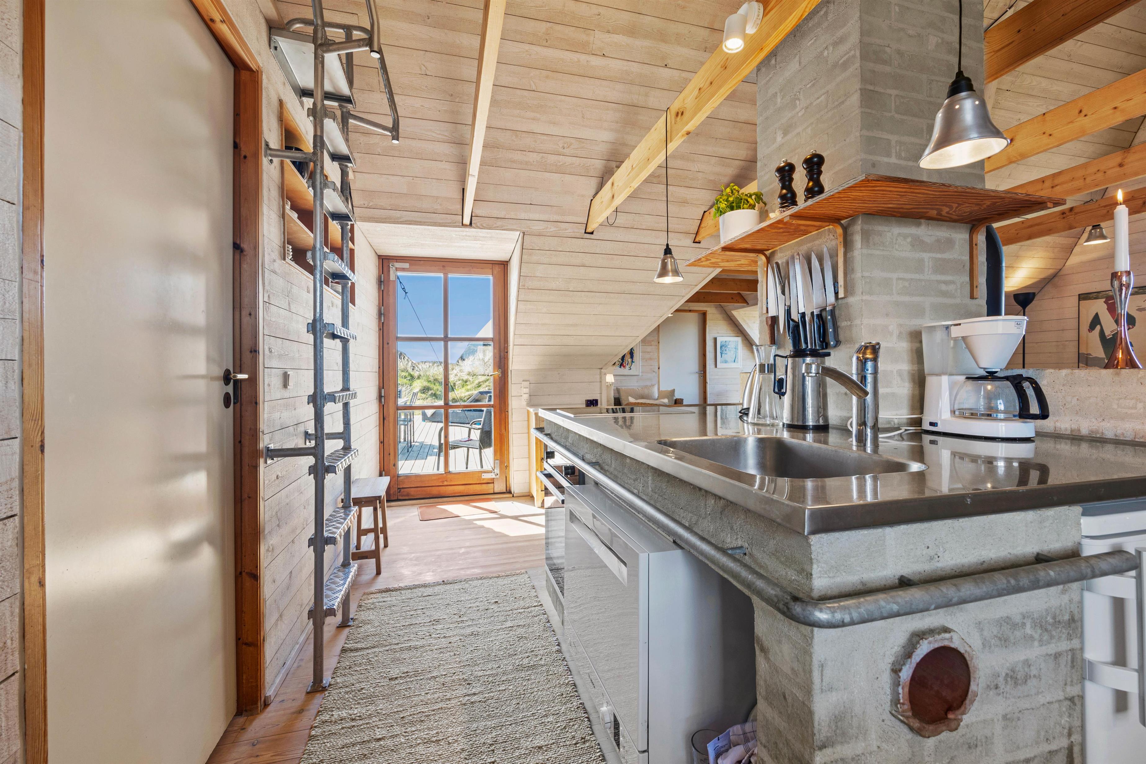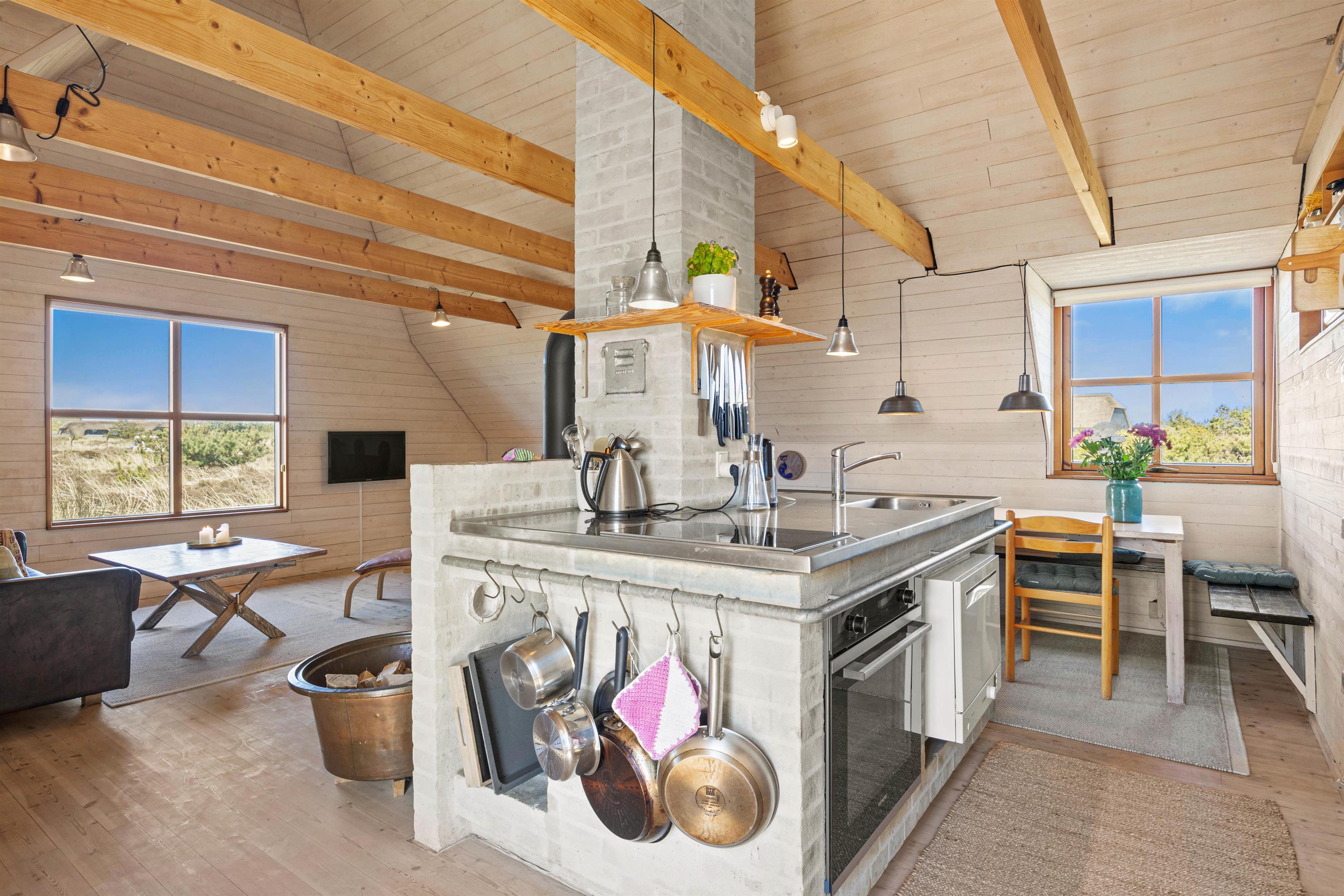 Det stråtækte sommerhus udstråler en varm og indbydende atmosfære, hvor rustikke materialer og fritlagte loftsbjælker giver sommerhuset karakter. Det åbne opholdsrum er sommerhusets hjerterum med plads til samvær og hygge. Den centralt placerede brændeovn spreder varme på kølige aftener, og foran ovnen finder I et hyggeligt sofaarrangement, der indbyder til spil og snak. Køkkenet er funktionelt med mikroovn, opvaskemaskine og alle de nødvendige faciliteter, så madlavning og oprydning foregår nemt.