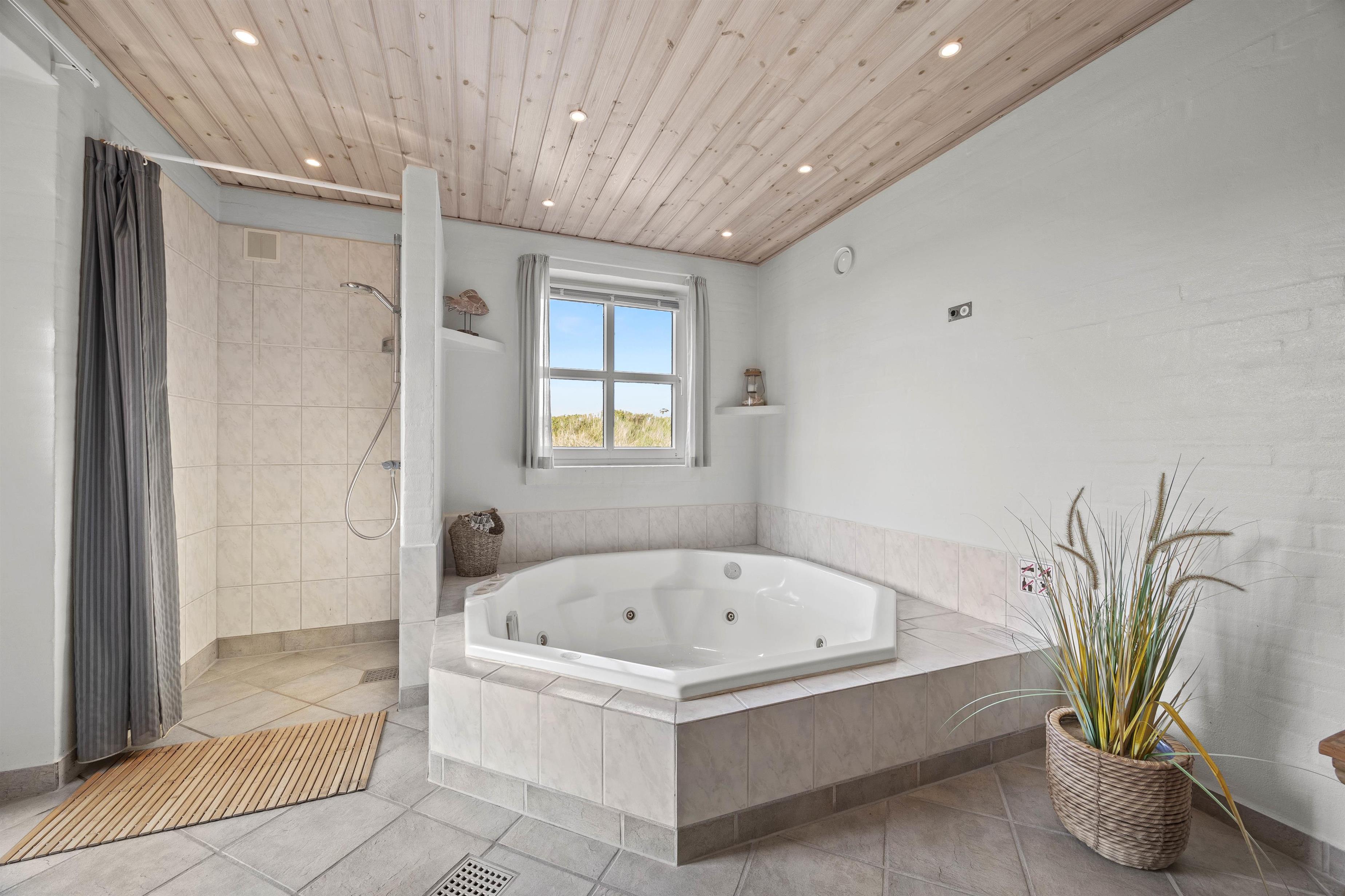 Dette rummelige sommerhus er den perfekte ramme om en hyggelig familieferie eller en forkælelsestur med vennerne. Feriehuset er veludstyret med bl.a. 6 personers spabad og stor sauna i separat wellnessrum med egen bruser.