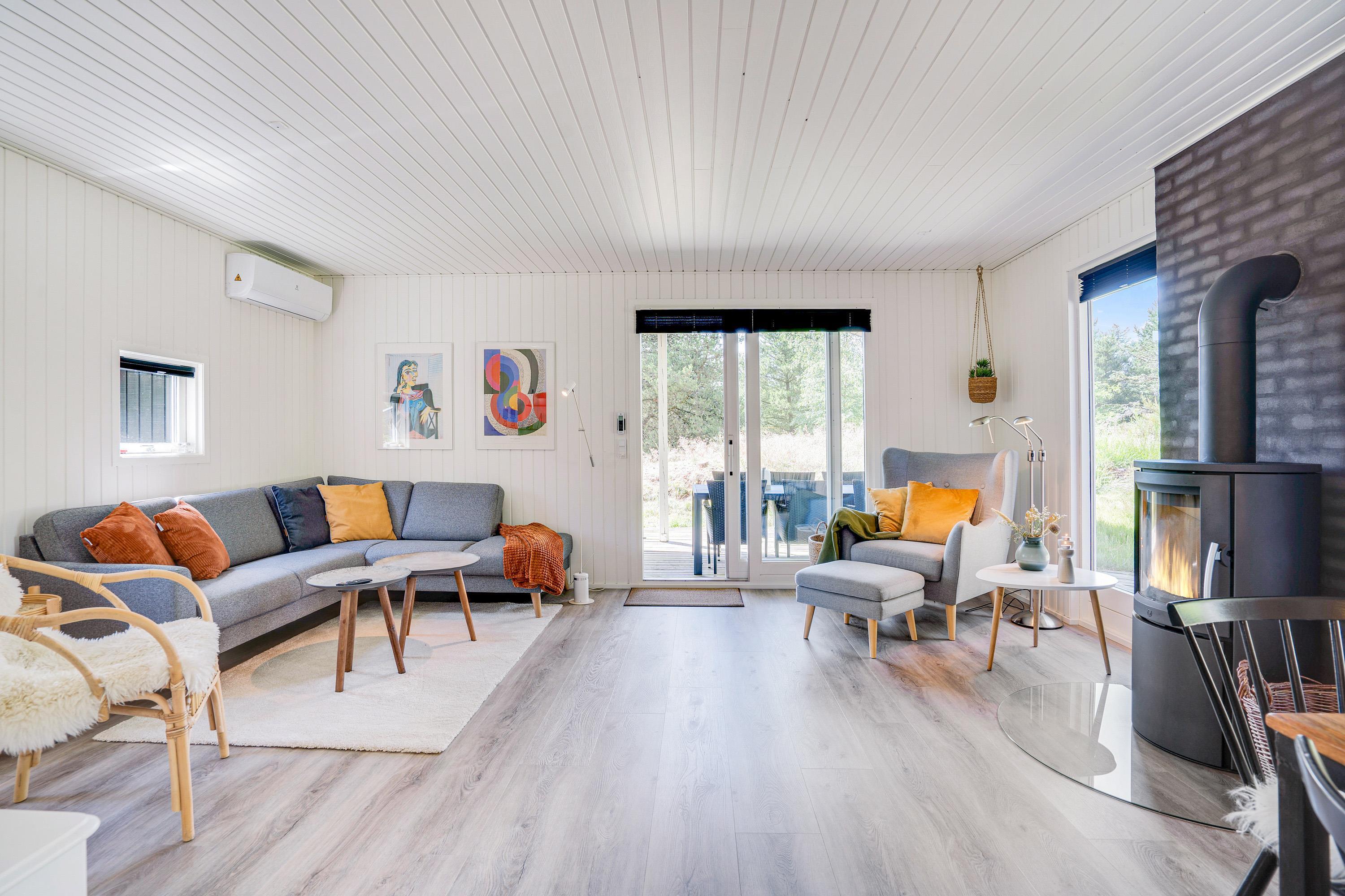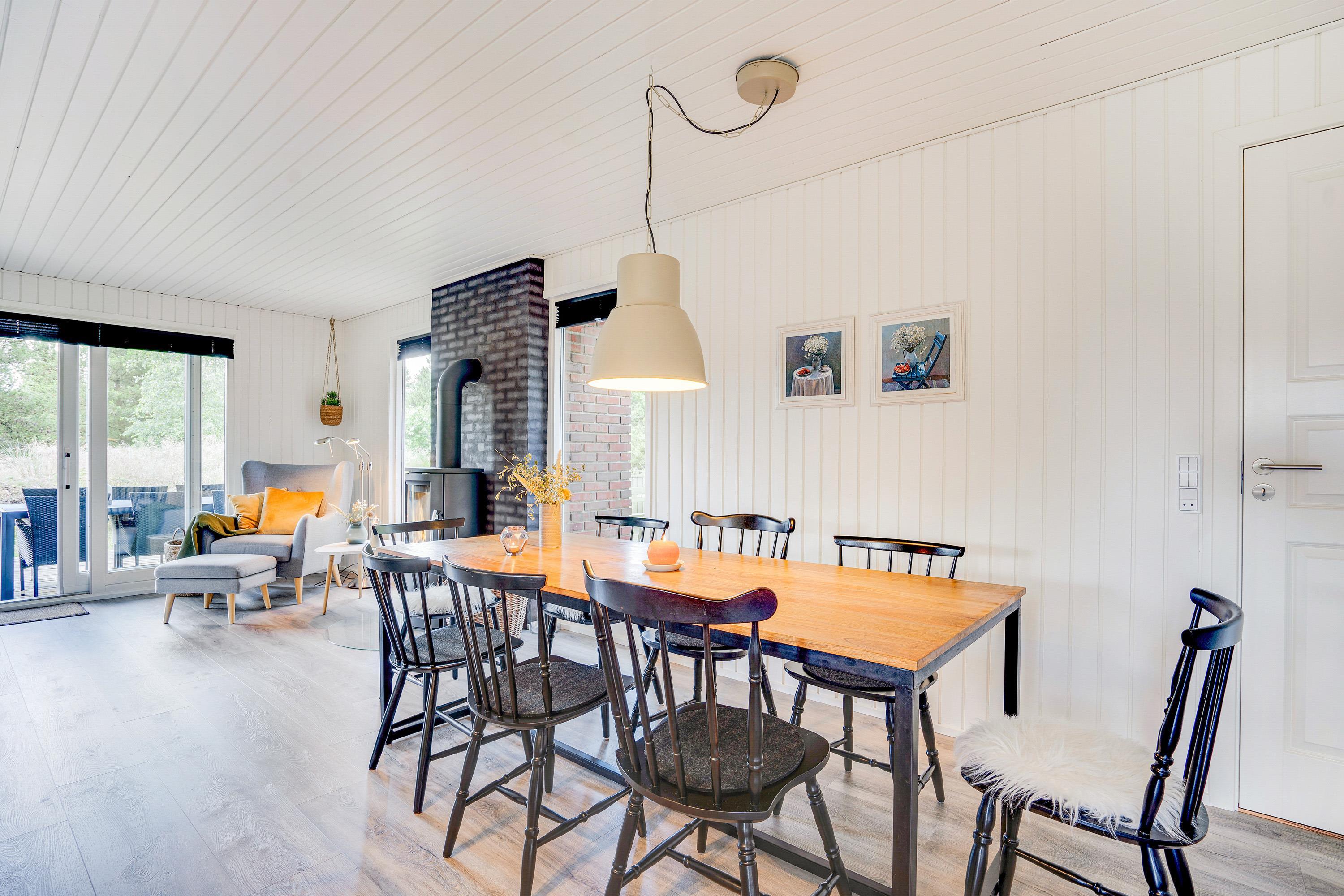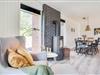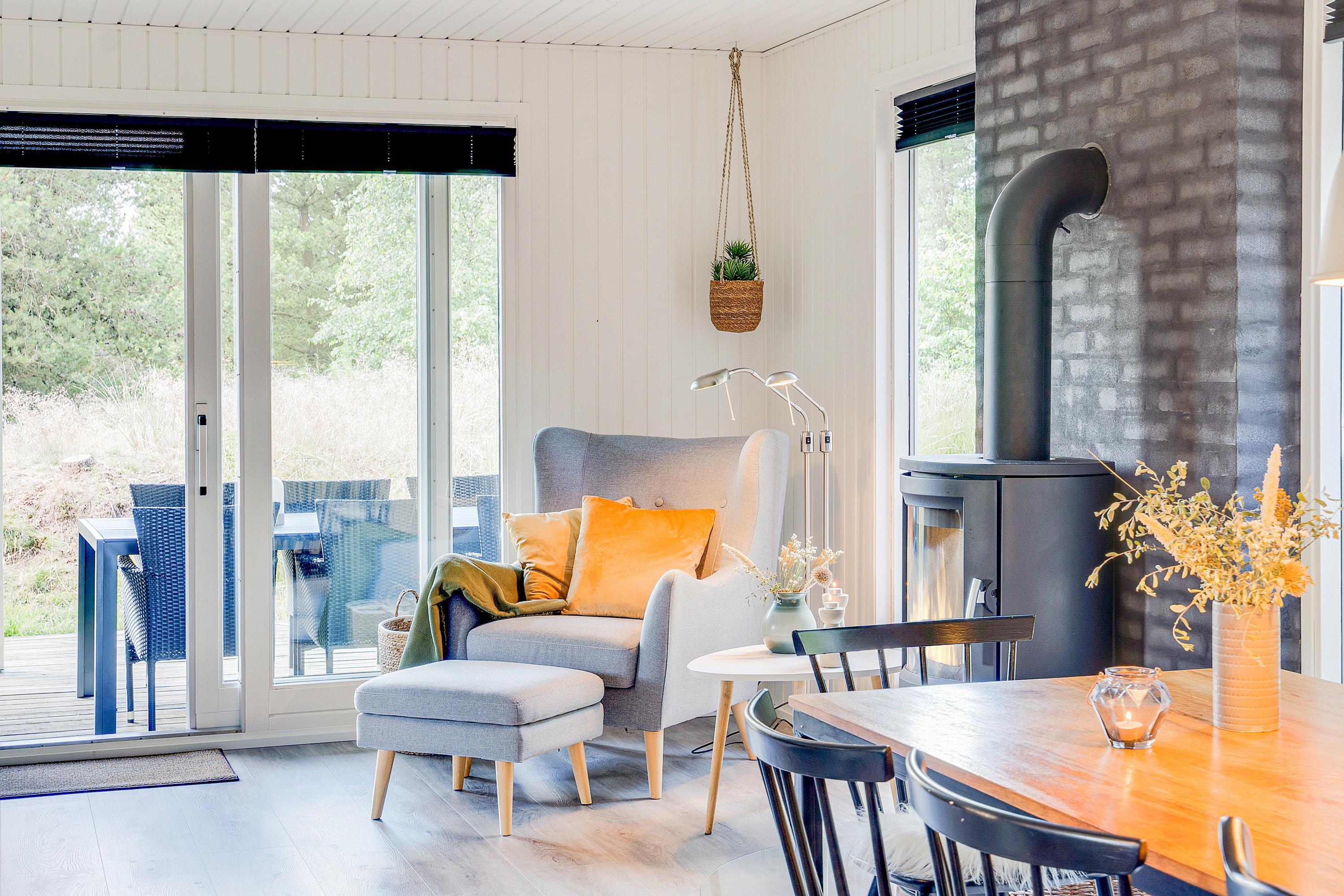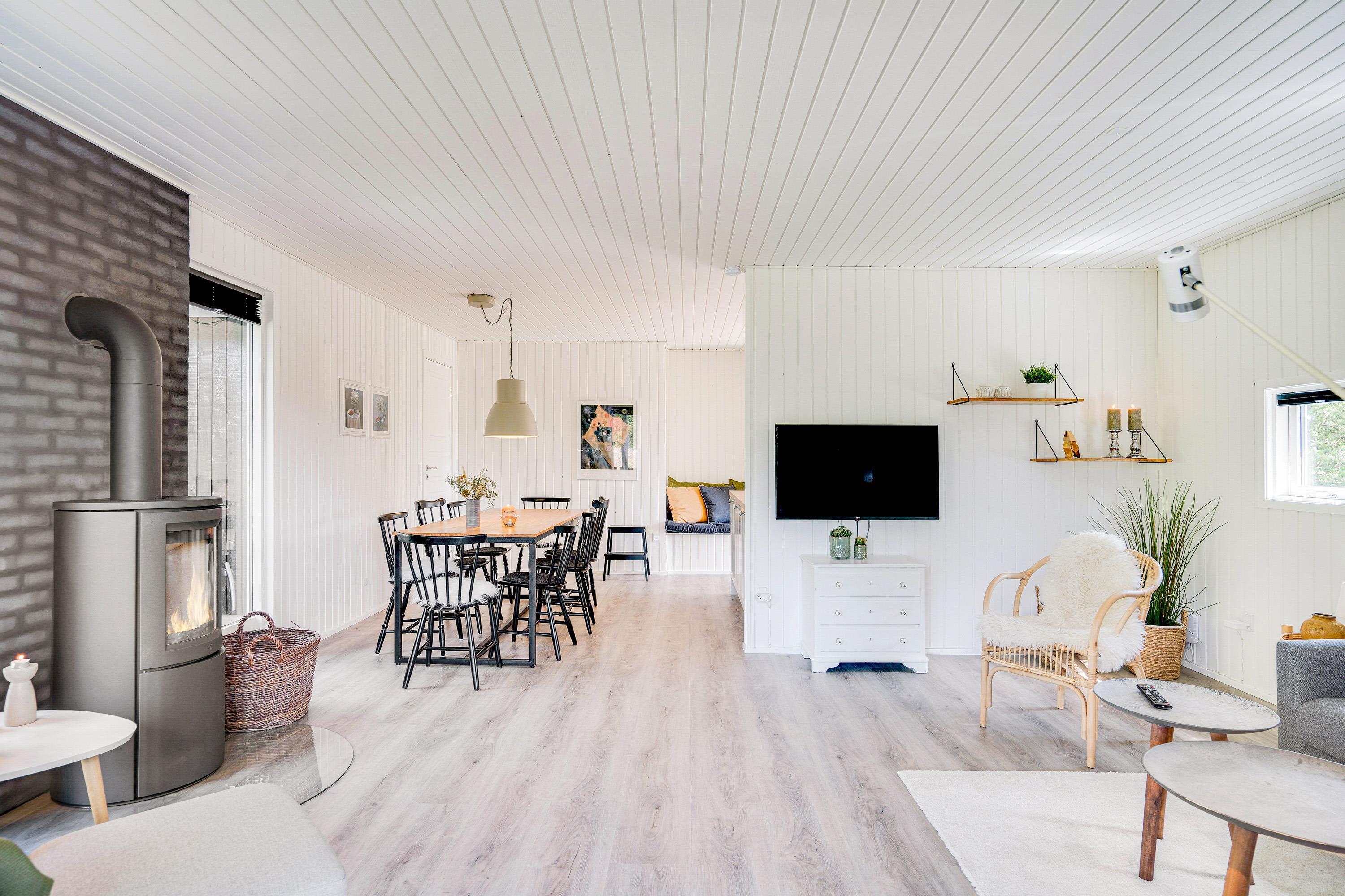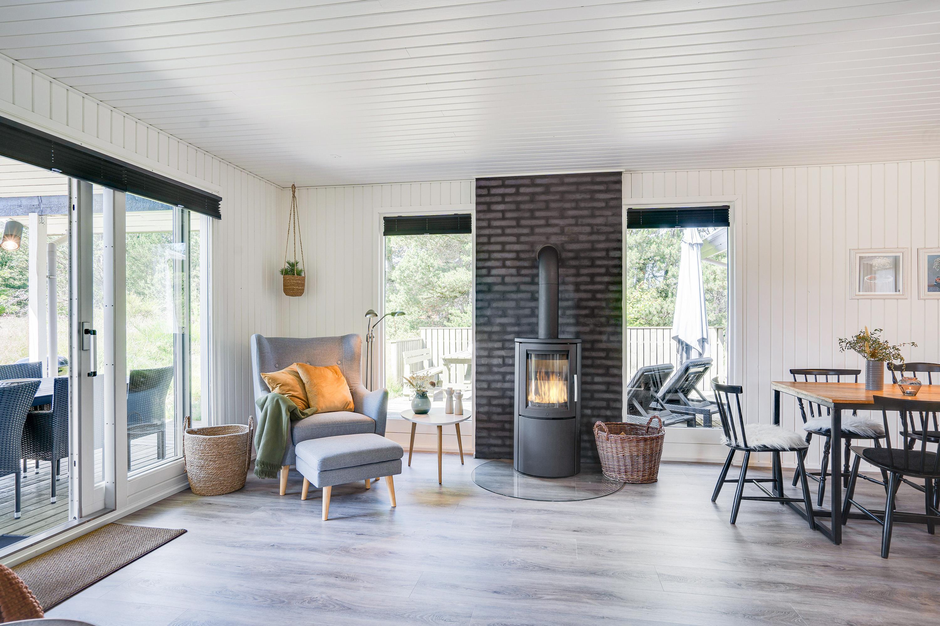 Lys og venlig indretning med brændeovn som prikken over i'et