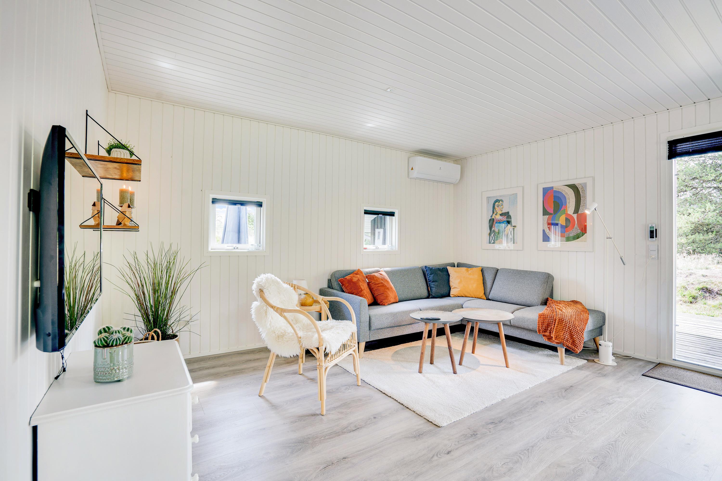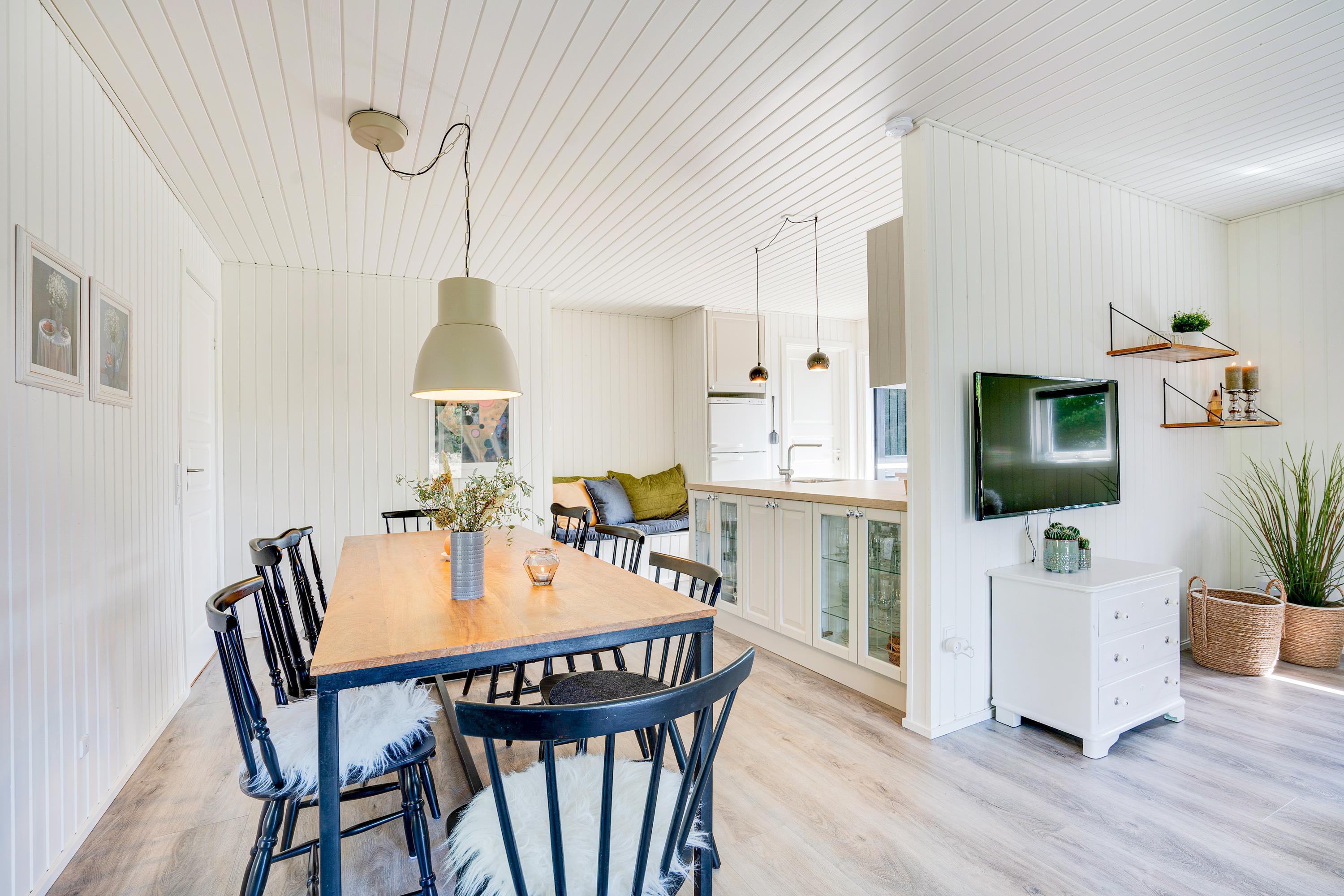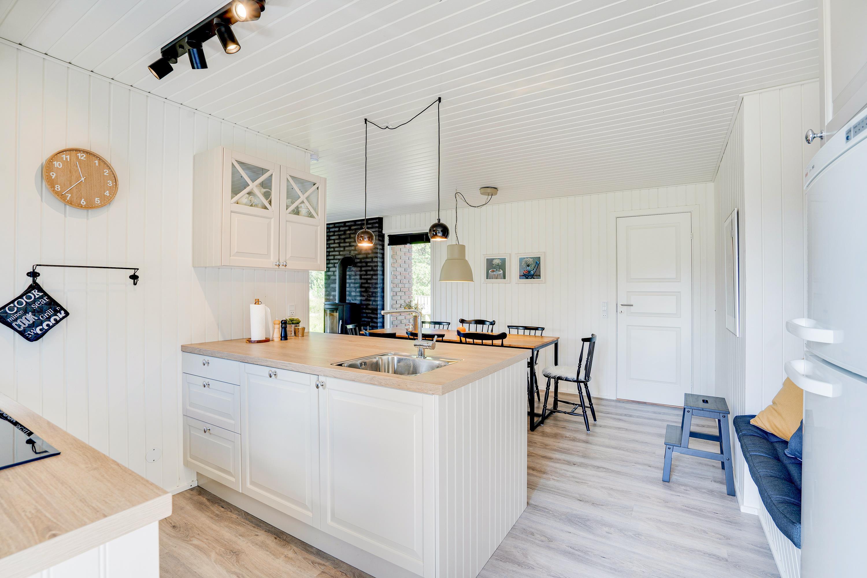 Det klassiske træsommerhus byder på skønne detaljer både inde og ude. Rummene er hyggeligt indrettet med lyse farver og der er tænkt på komforten fx med en lækker hjørnesofa og en lænestol med læselys ved brændeovnen - det perfekte sted en et par times afslapning med en god bog eller en varm kop te.