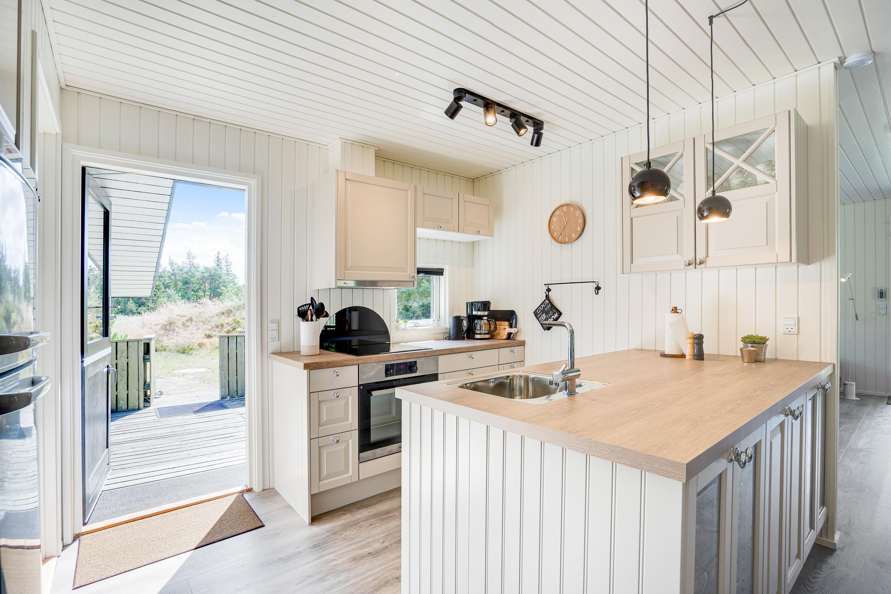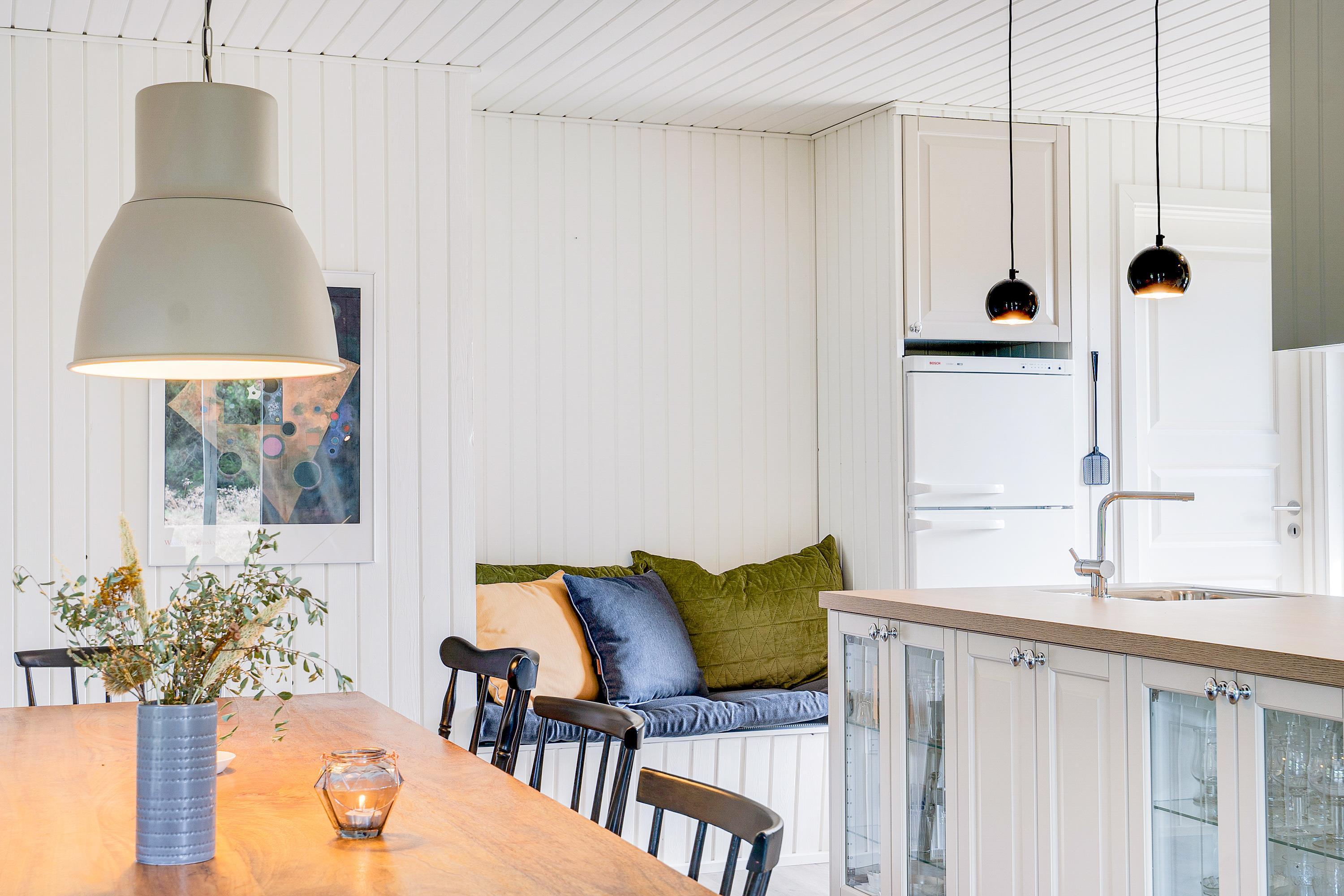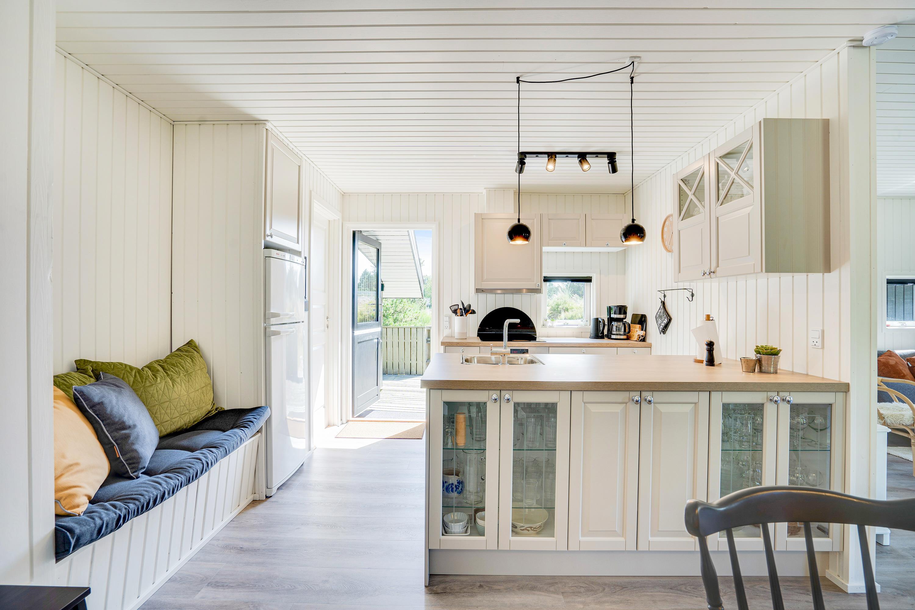 En lille alkove ved køkkenet gør det ekstra hyggeligt, når det er tid til en pre-dinner drink, mens familiens mesterkokke kreerer feriemenuen i det hyggelige landkøkken, der naturligvis er udstyret med både opvaskemaskine og et lille fryseskab.