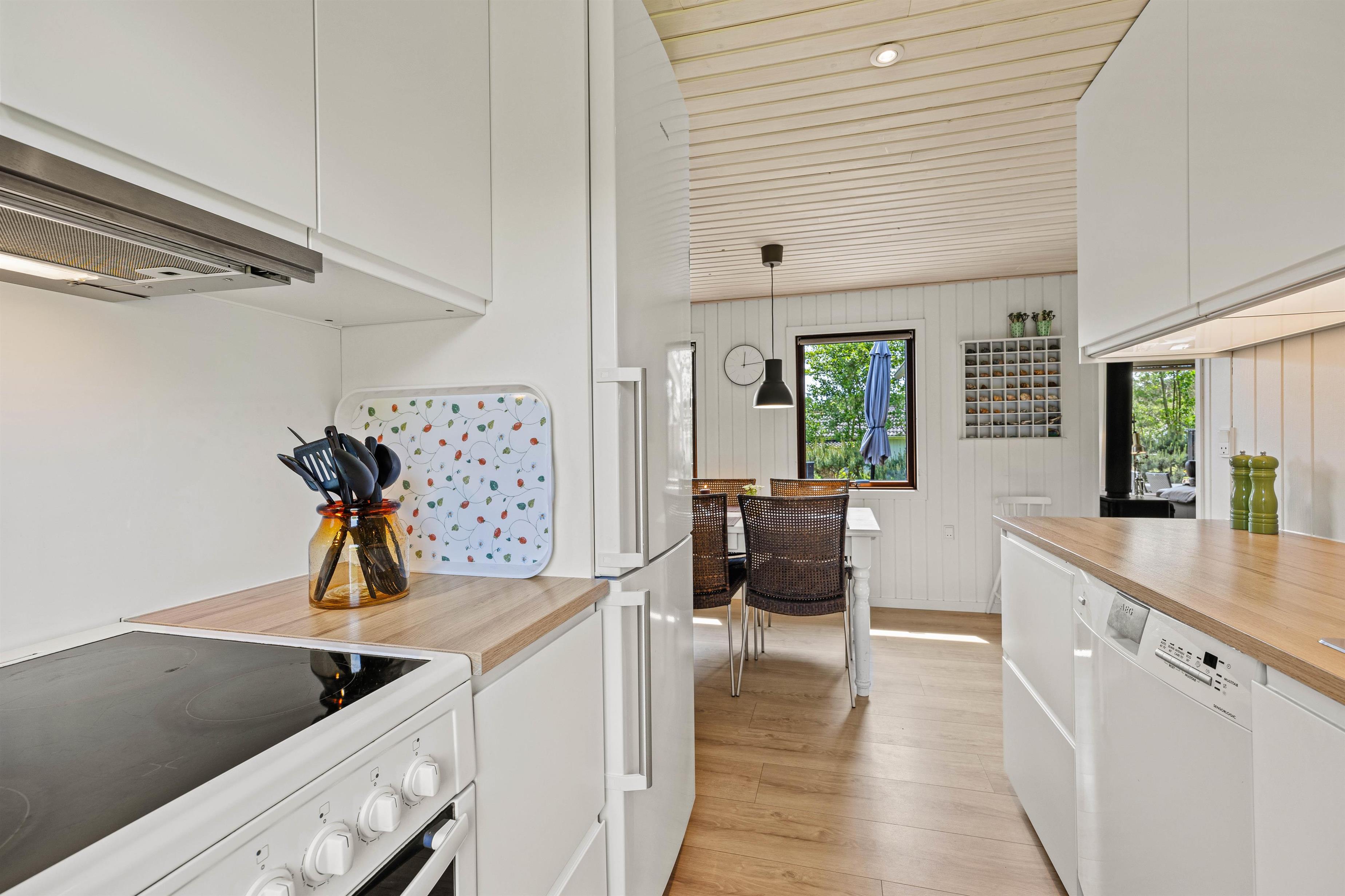 Det lille, lyse køkken har både mikroovn, opvaskemaskine og en 90 liters fryser, så I kan give jer i kast med god gastronomi på ferien og altid kan have flere forsyninger på lager. Når maden er klar, kan I samles om spisebordet og tale om dagens spændende ferieoplevelser i skønne Blåvand.
