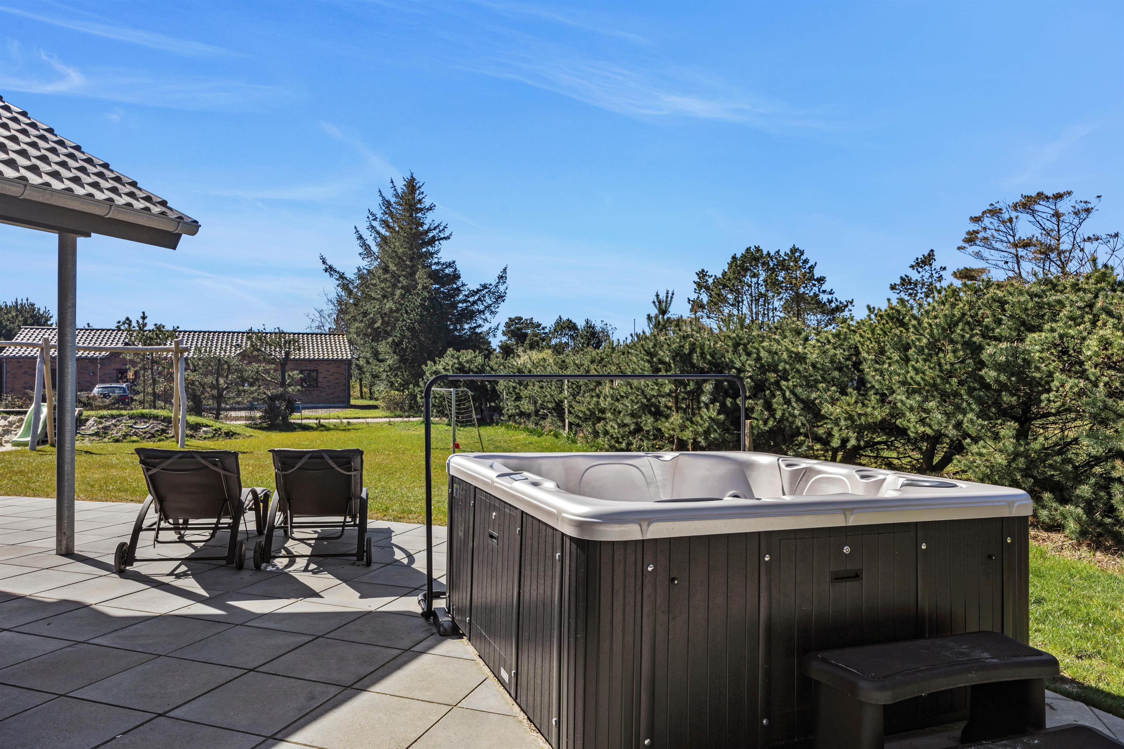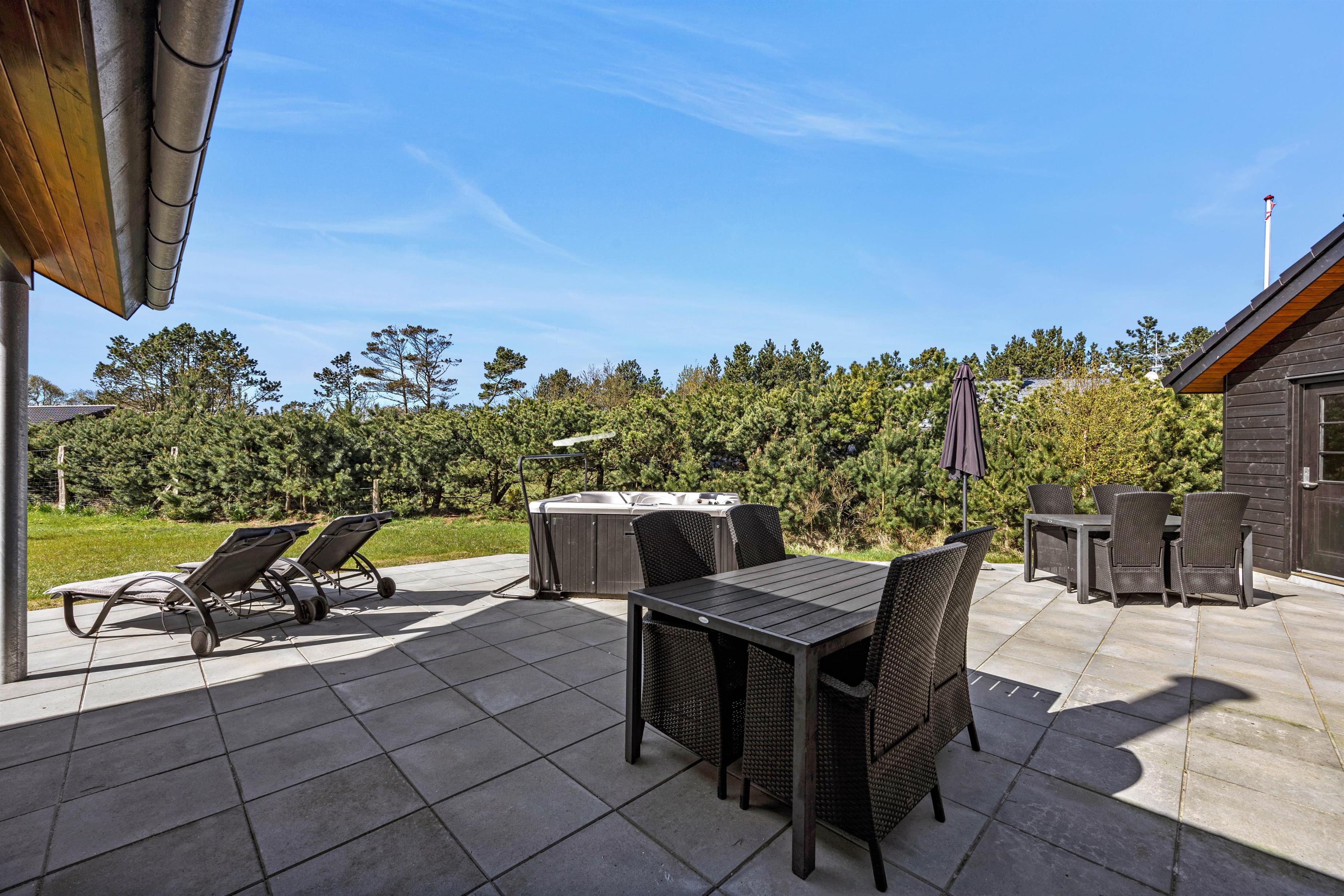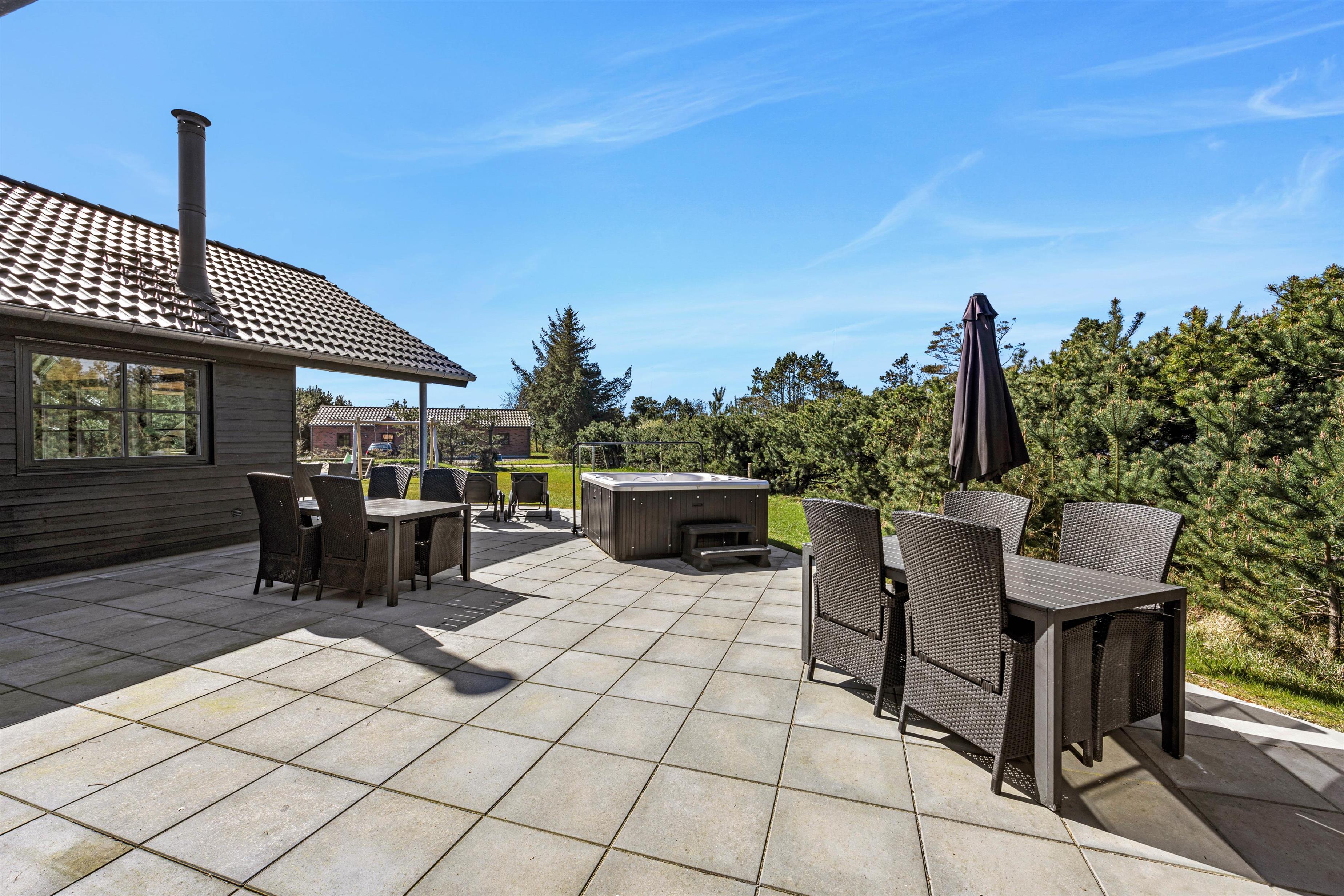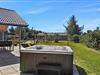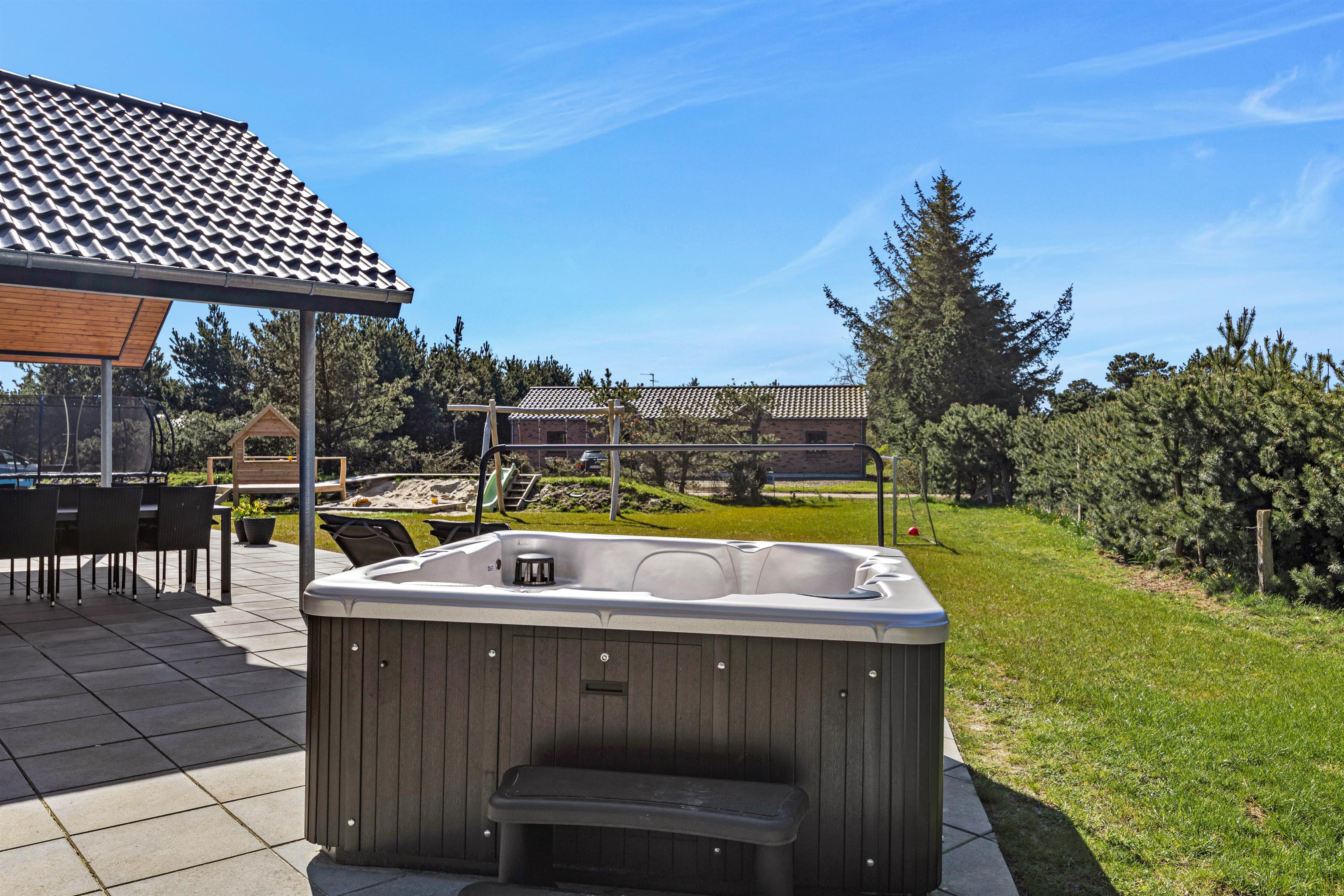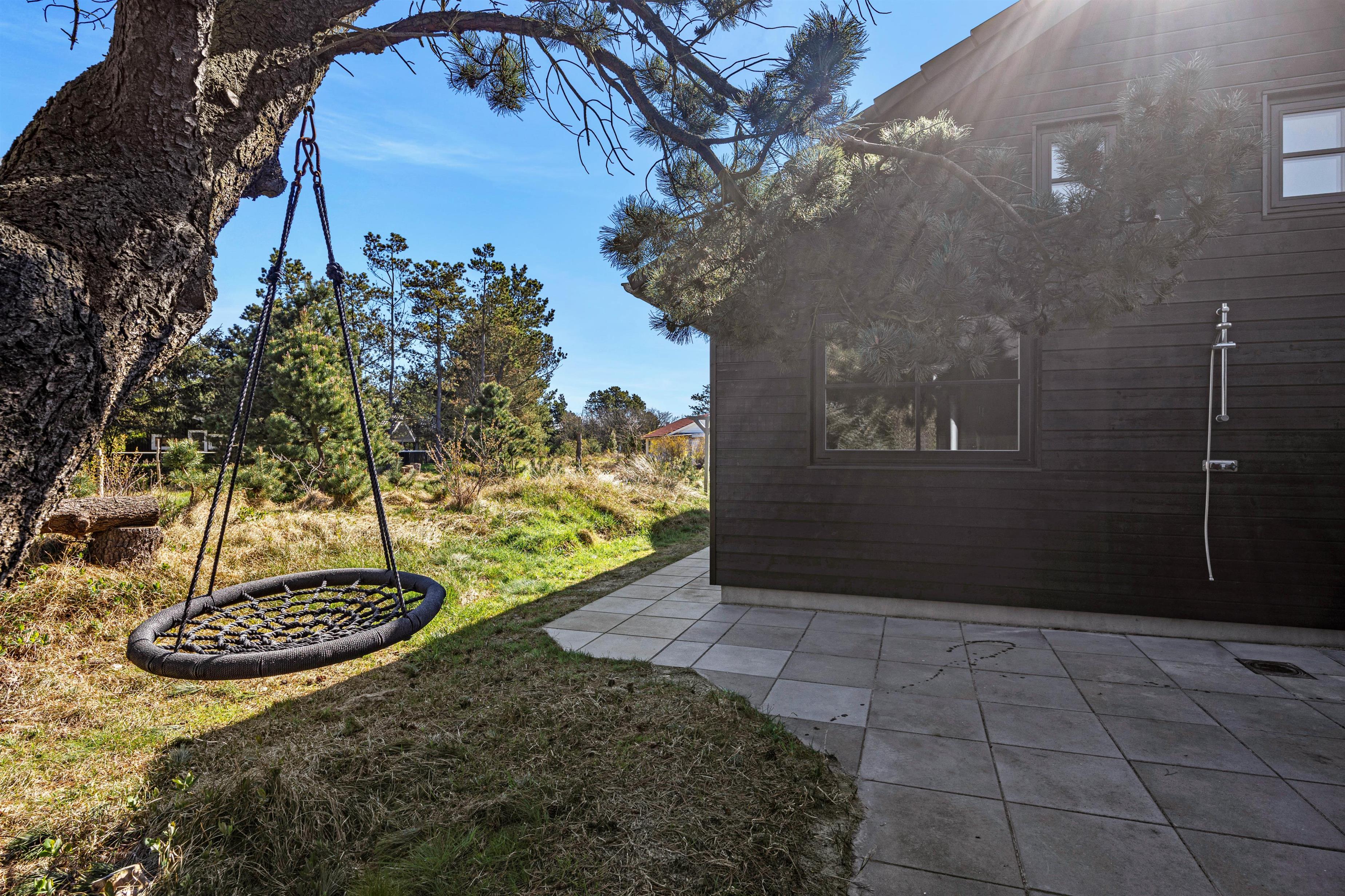 Fra stuen har i adgang til en stor flisebelagt terrasse med havemøbler. På solrige dage kan i ligge i solen på solvognene, imens i ser på børnenes leg i sandkassen eller på gyngen. Hop en tur i spaen eller saunaen og bliver det for varmt, kan I afkøle jer under udebruseren, der er til rådighed fra 1. april til 31. oktober.
