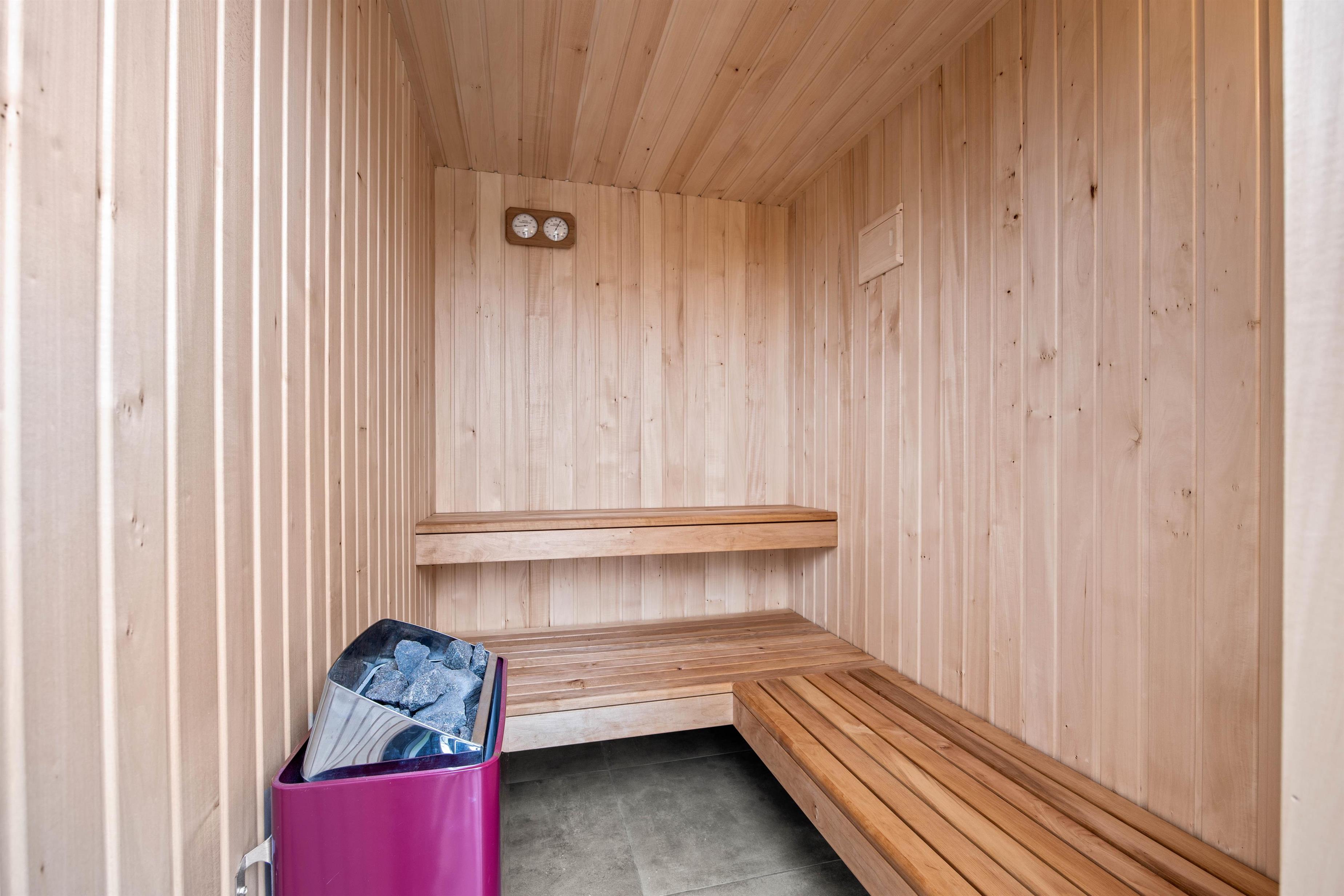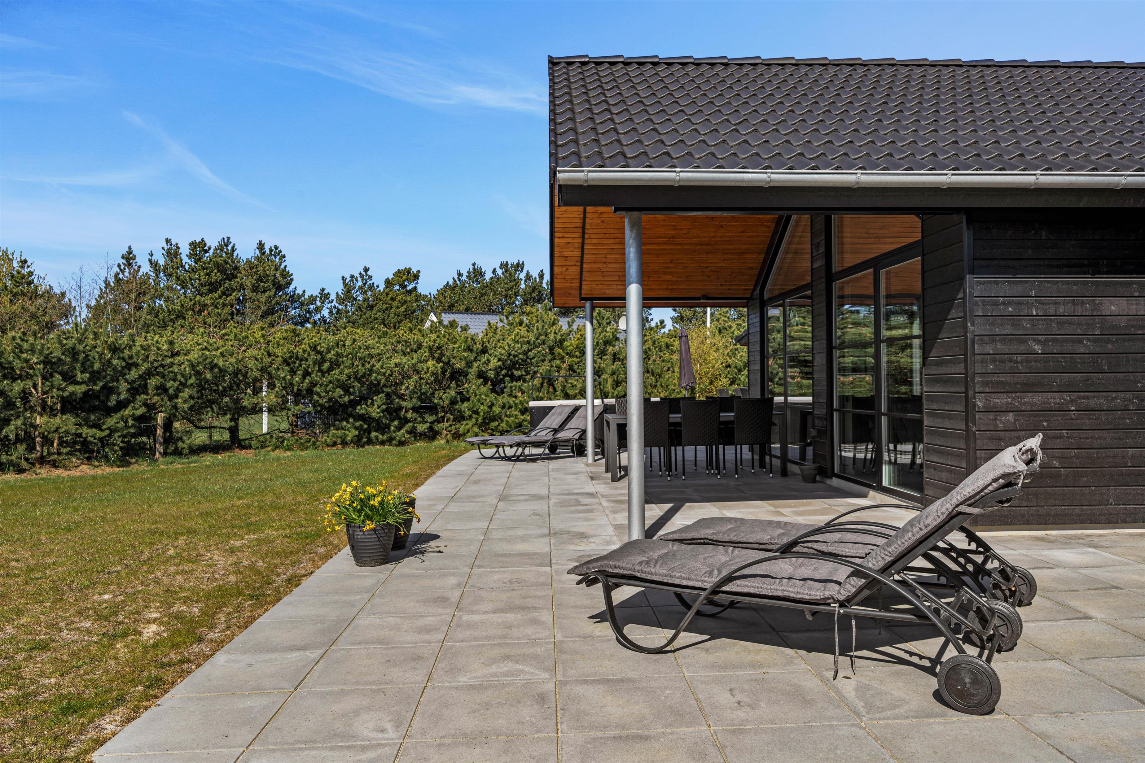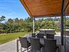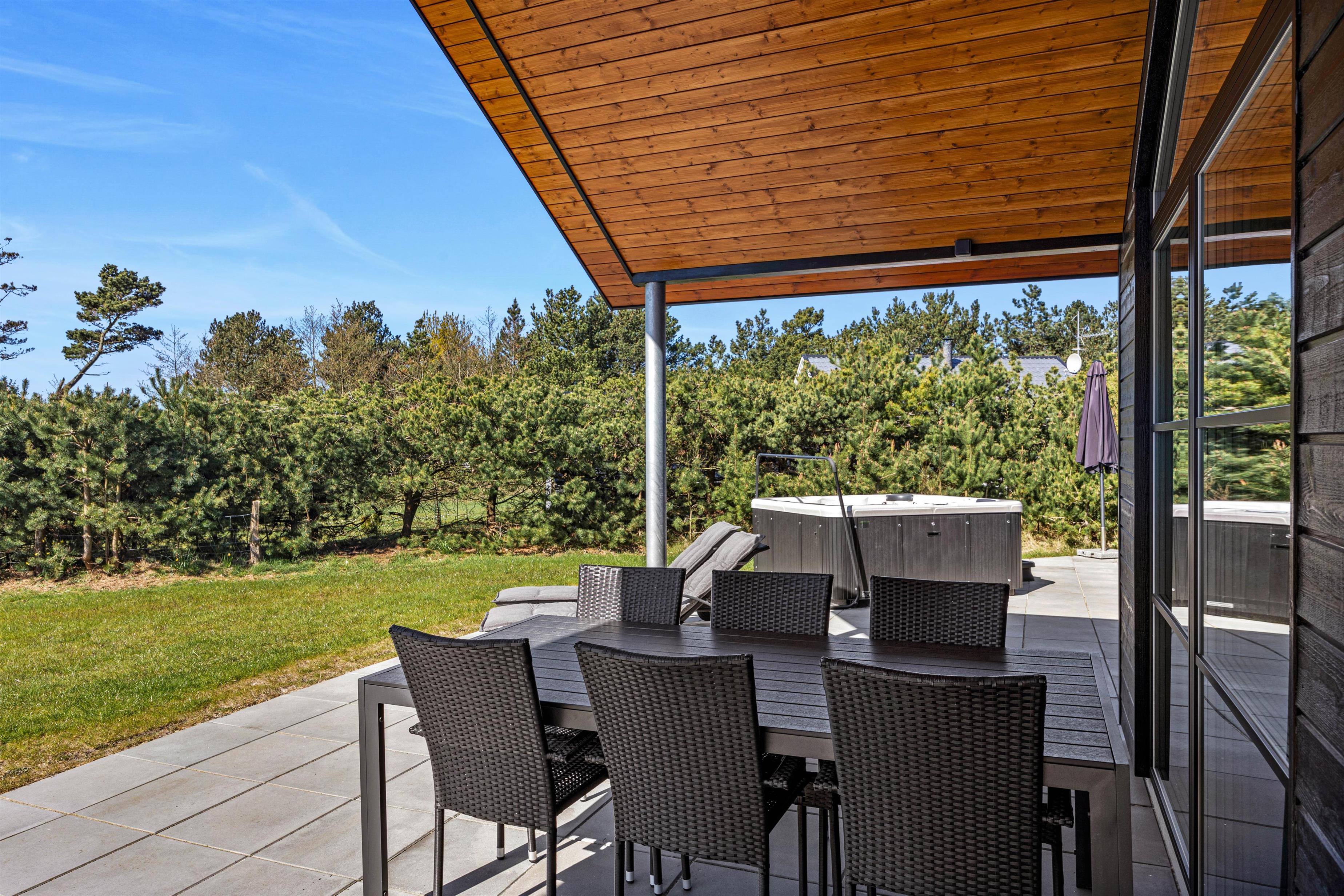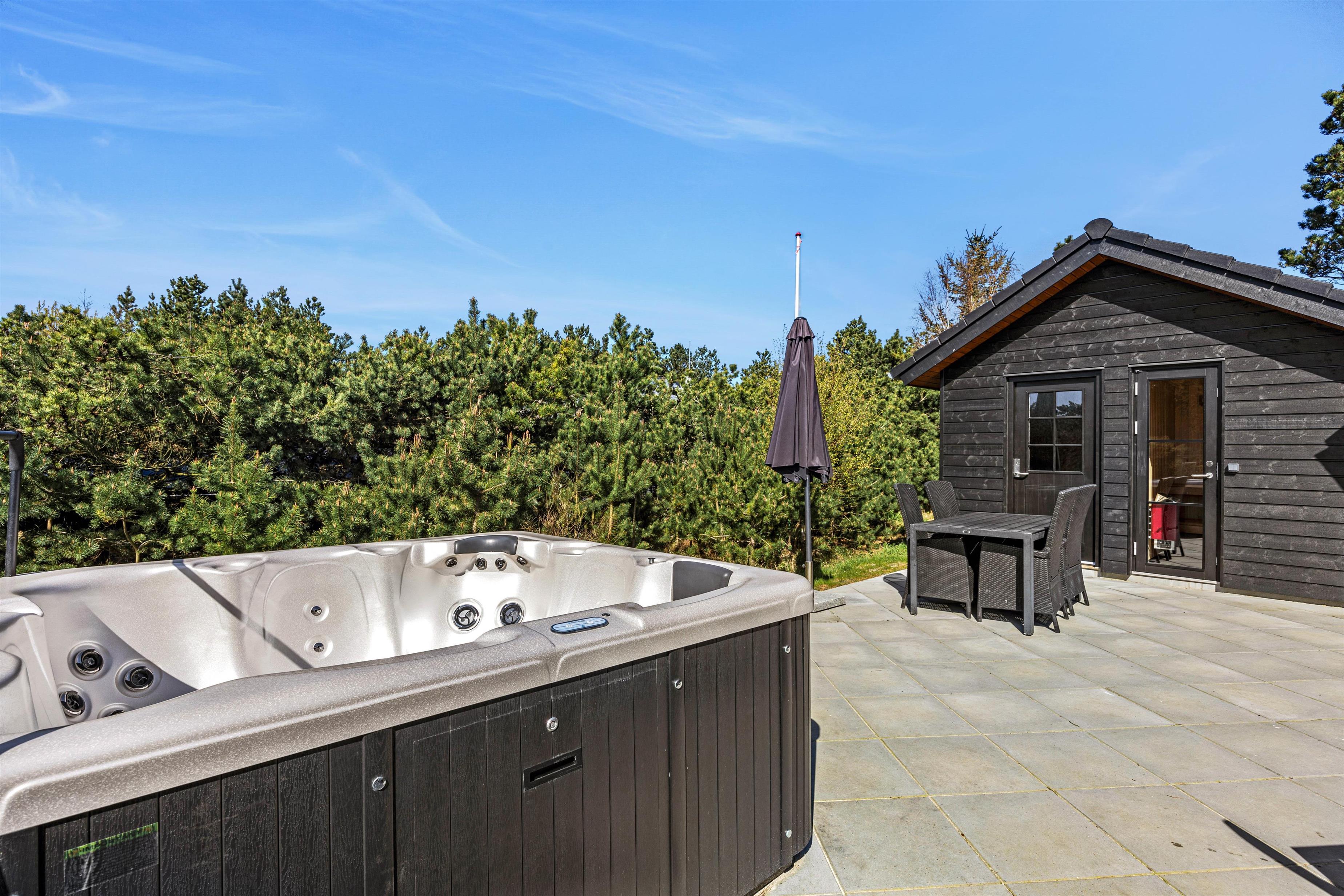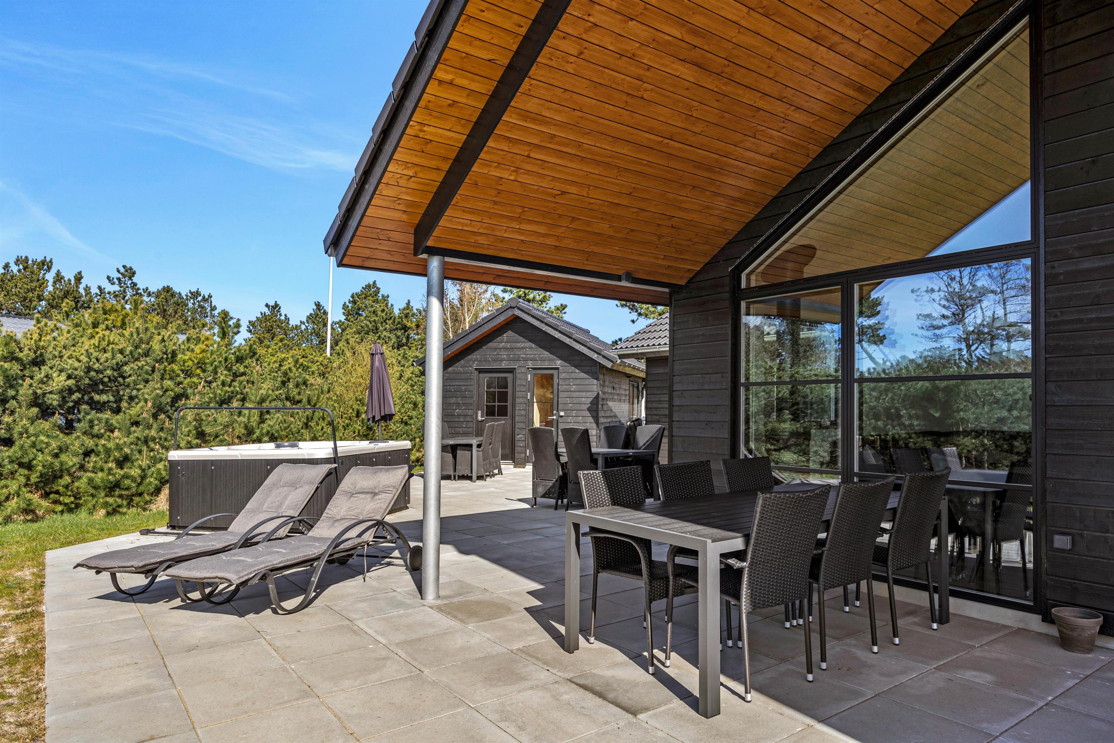 Fra stuen har i adgang til en stor flisebelagt terrasse med havemøbler. På solrige dage kan i ligge i solen på solvognene, imens i ser på børnenes leg i sandkassen eller på gyngen. Hop en tur i spaen eller saunaen og bliver det for varmt, kan I afkøle jer under udebruseren, der er til rådighed fra 1. april til 31. oktober.