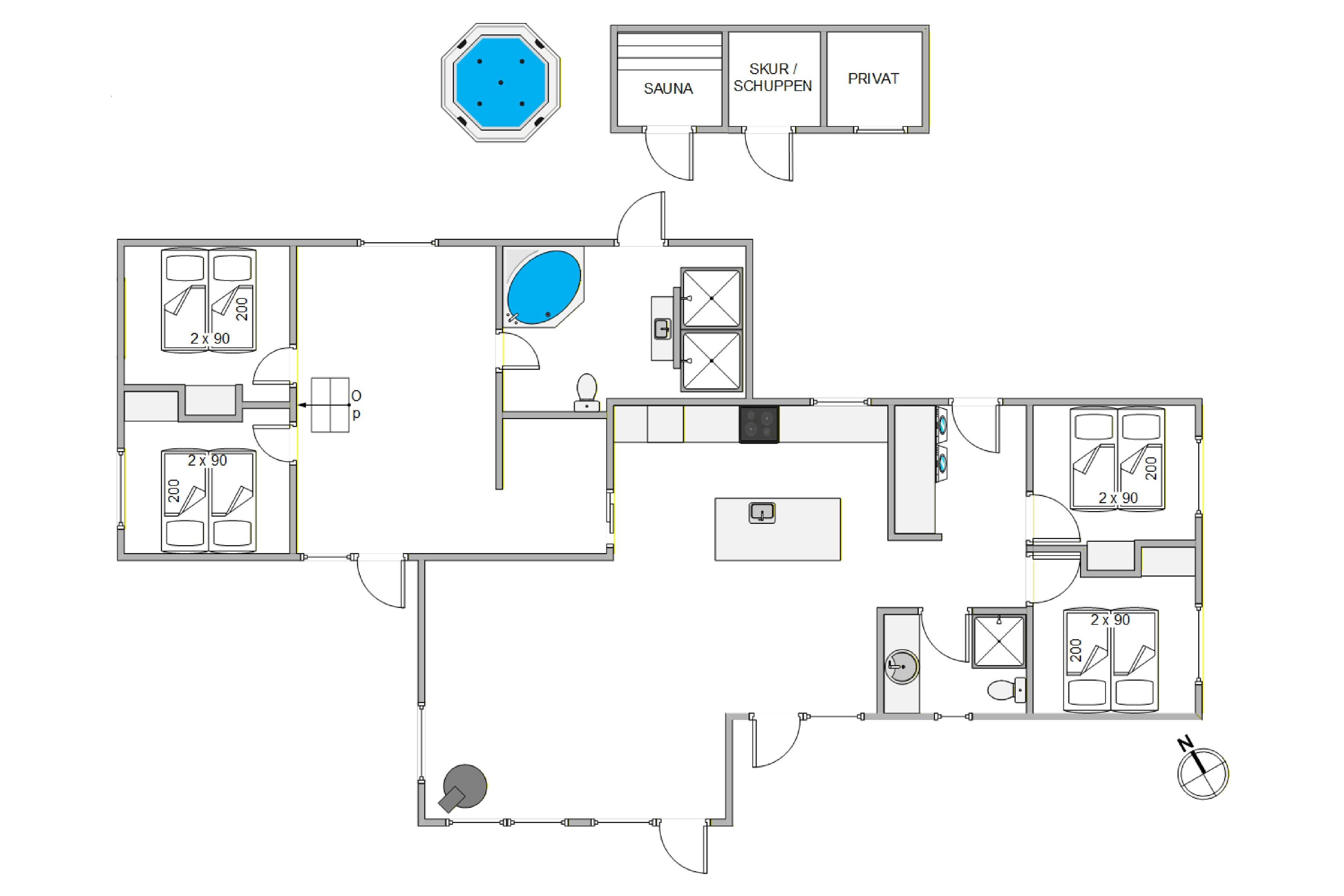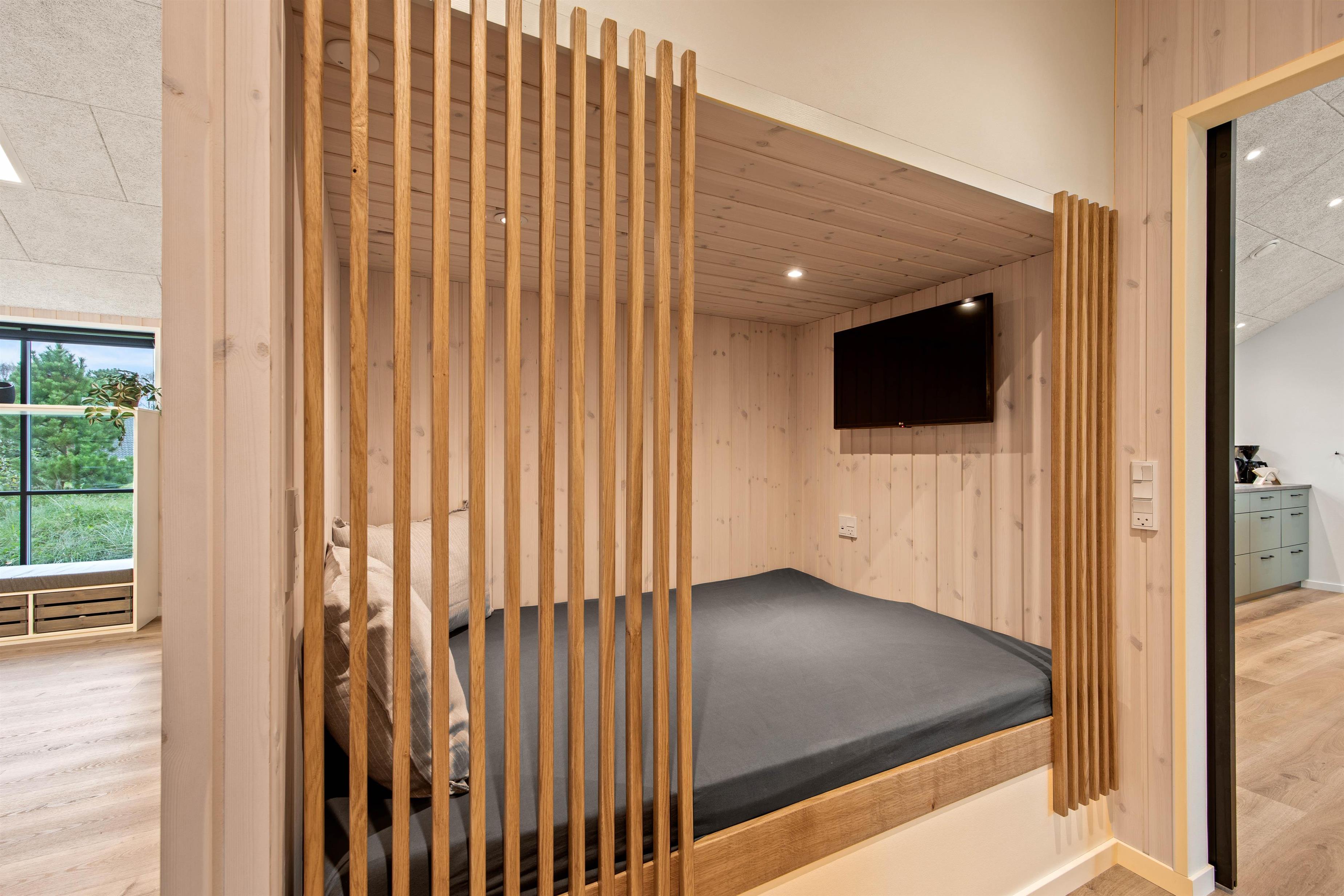 4 soveværelser står til jeres rådighed som alle er indrettet med dobbeltsenge. Desuden har I 2 badeværelser med gulvvarme i dette feriehus, det ene med en spa og en dobbelt brusekabine.