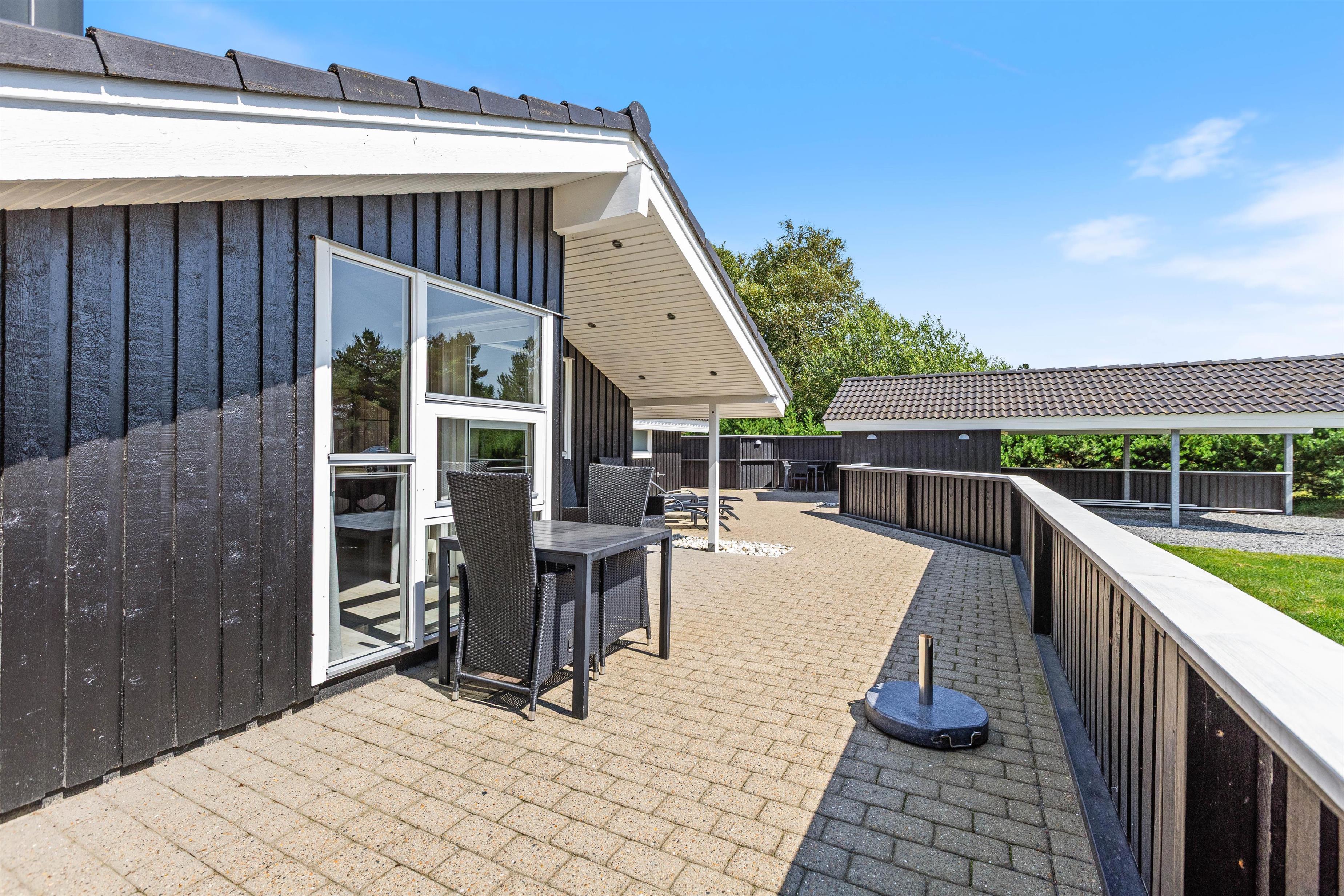 Den delvist overdækkede og indhegnede terrasse når I gennem stuen. Terrassen omgiver hele huset og er godt møbleret, så I sammen kan grille, spise god mad og dase i solen. Her er I omgivet af en stor grund med grønt græs, og der er tilmed en gynge og en sandkasse til børnene. Carporten sørger også for, at bilen står godt beskyttet.