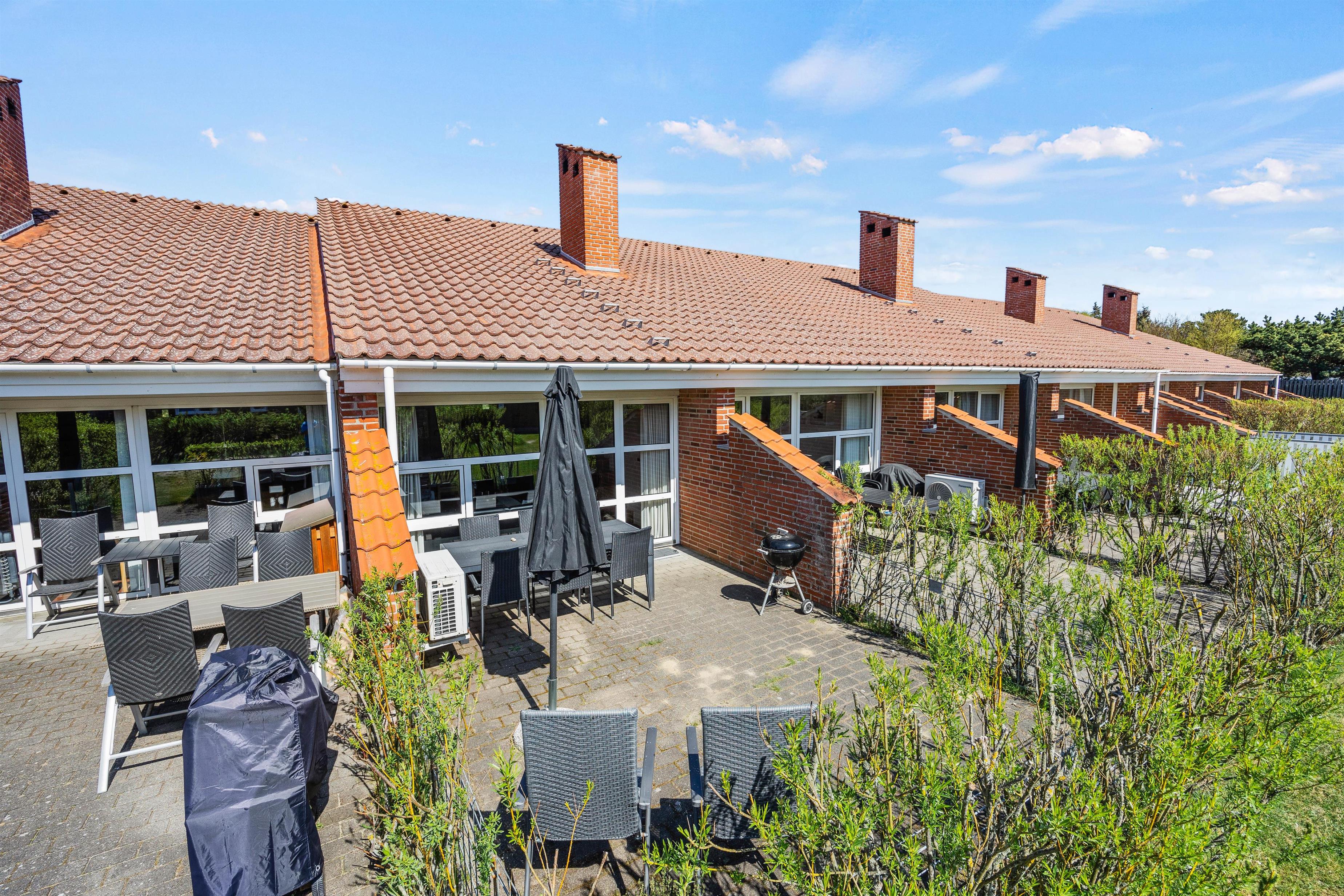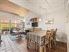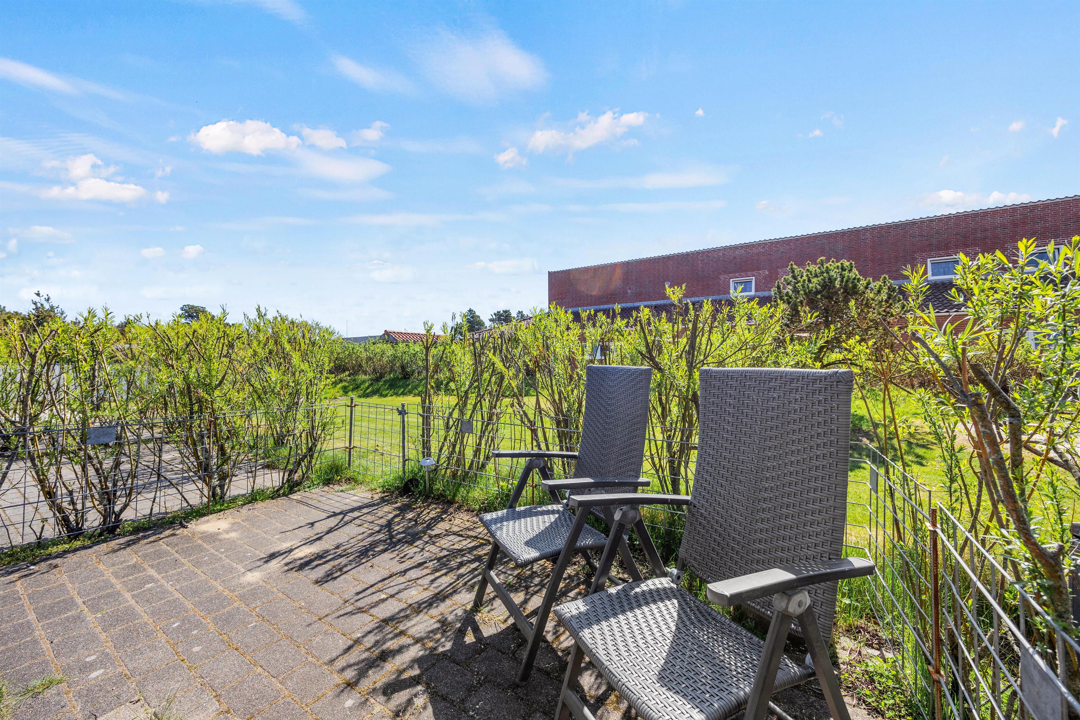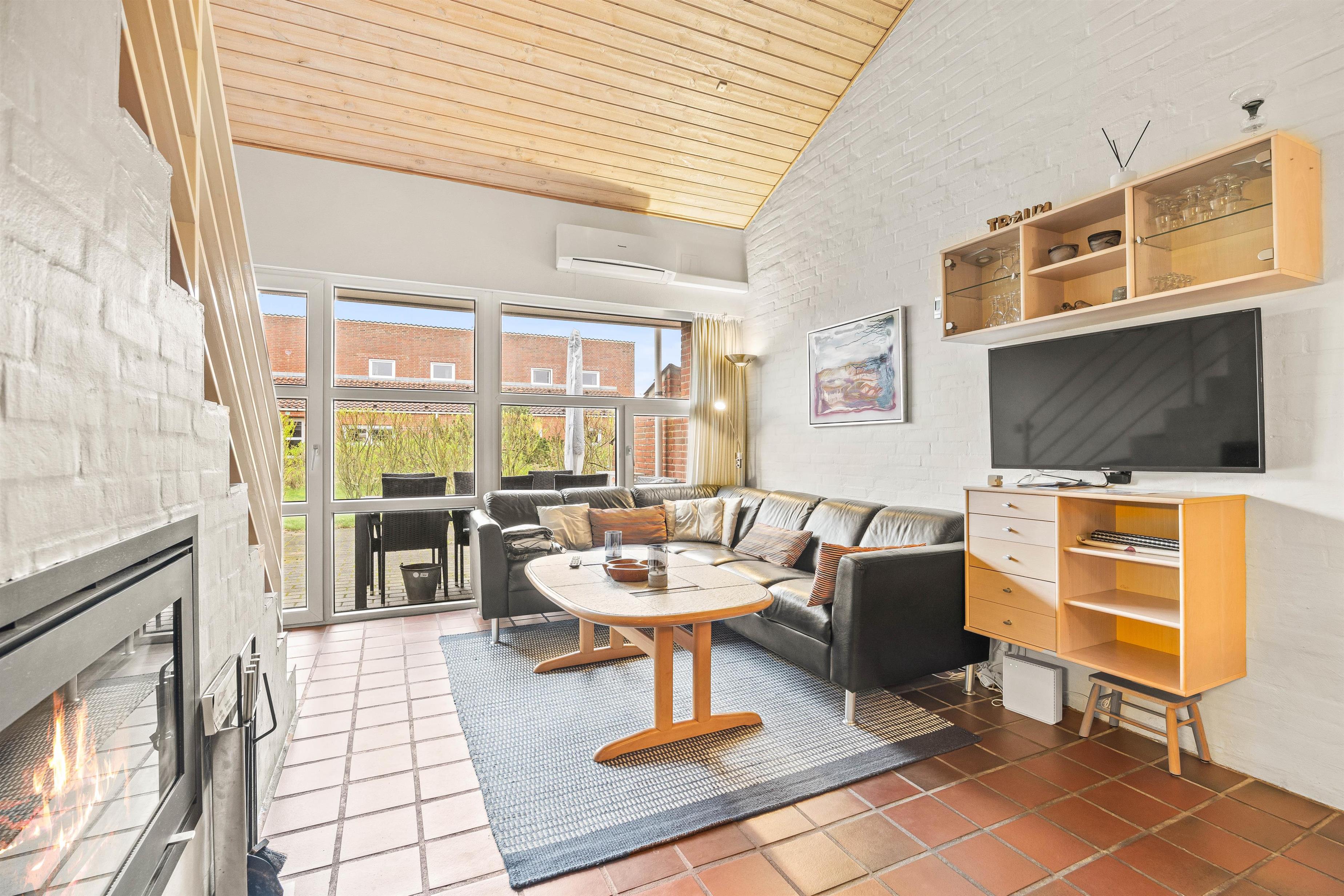 Fra den hyggelige opholdsstue i den toetagers ferielejlighed har du direkte adgang til den åbne terrasse. Sæt jer godt til rette i havemøblerne med en friskbrygget kop kaffe, læs en bog eller løs en krydsogtværs.