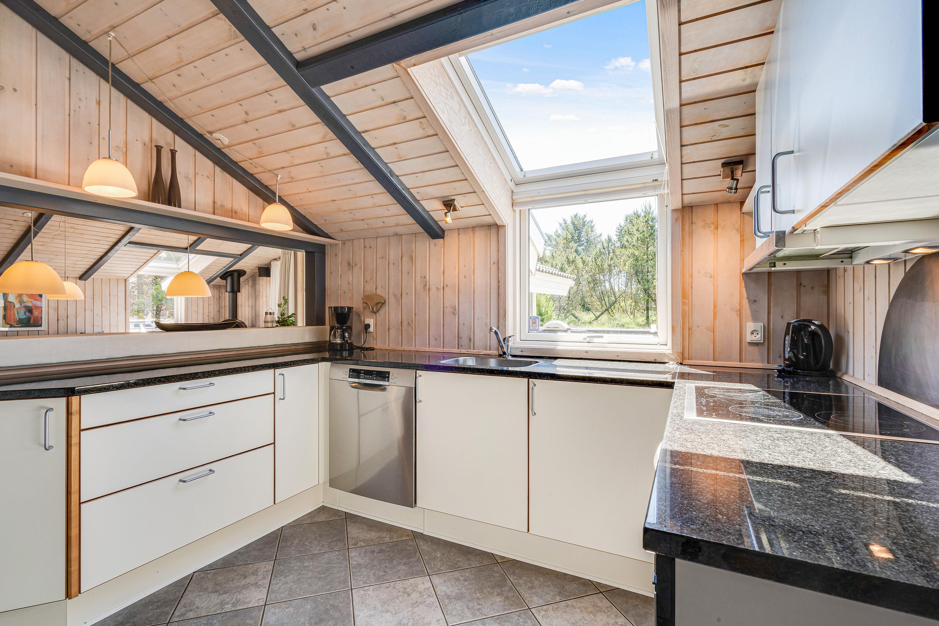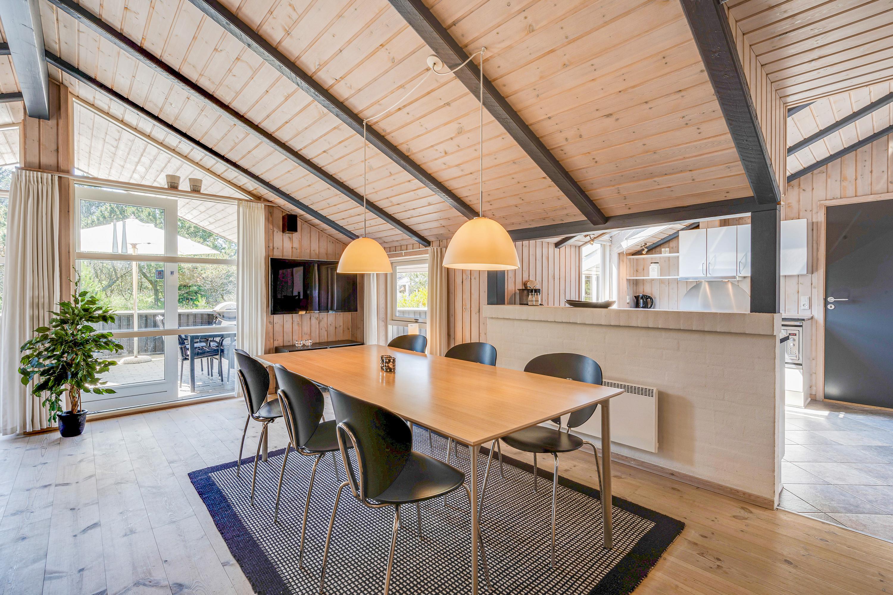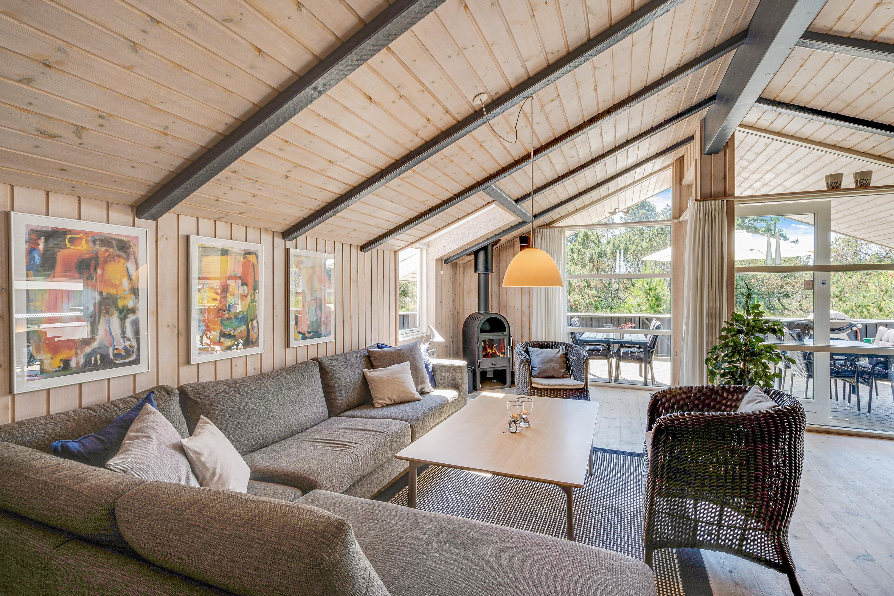 I alrummet, der forener køkken, stue og spisestue, kommer I uden tvivl også til at tilbringe mange hyggelige feriestunder med madlavning, spil og film. Skal der skrues ekstra op for den hyggelige feriestemning, kan I tænde op i brændeovnen, der også sørger for god varme – og ellers sørger varmepumpen for et godt indeklima i feriehuset.