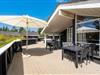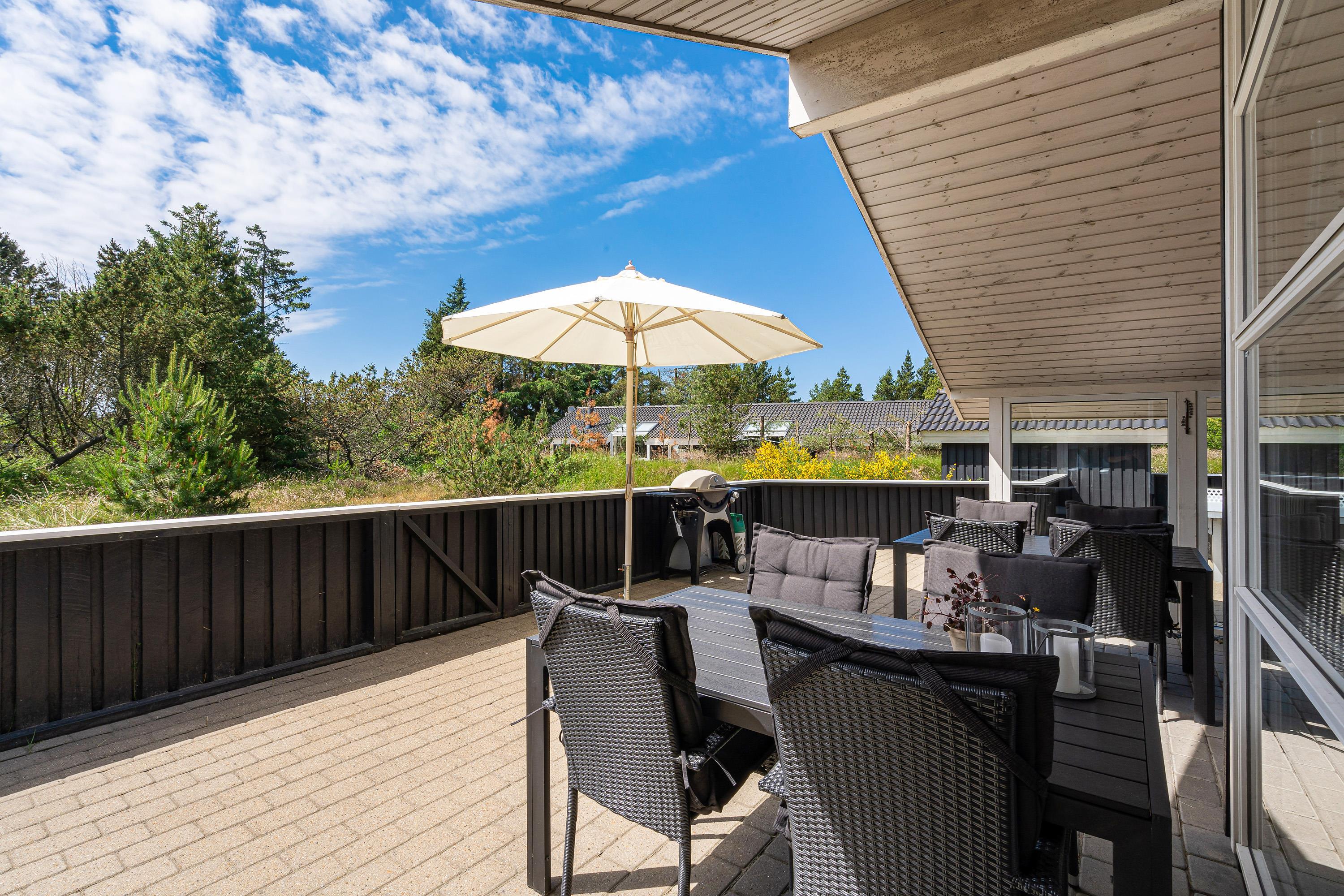 Det er ikke kun indendørs, at sommerhuset på Søren Gades Mark 30B er skønt; det er udeområdet nemlig også. Sommerhuset har en stor terrasse, der er delvist overdækket, hvor I finder flere gode highlights.