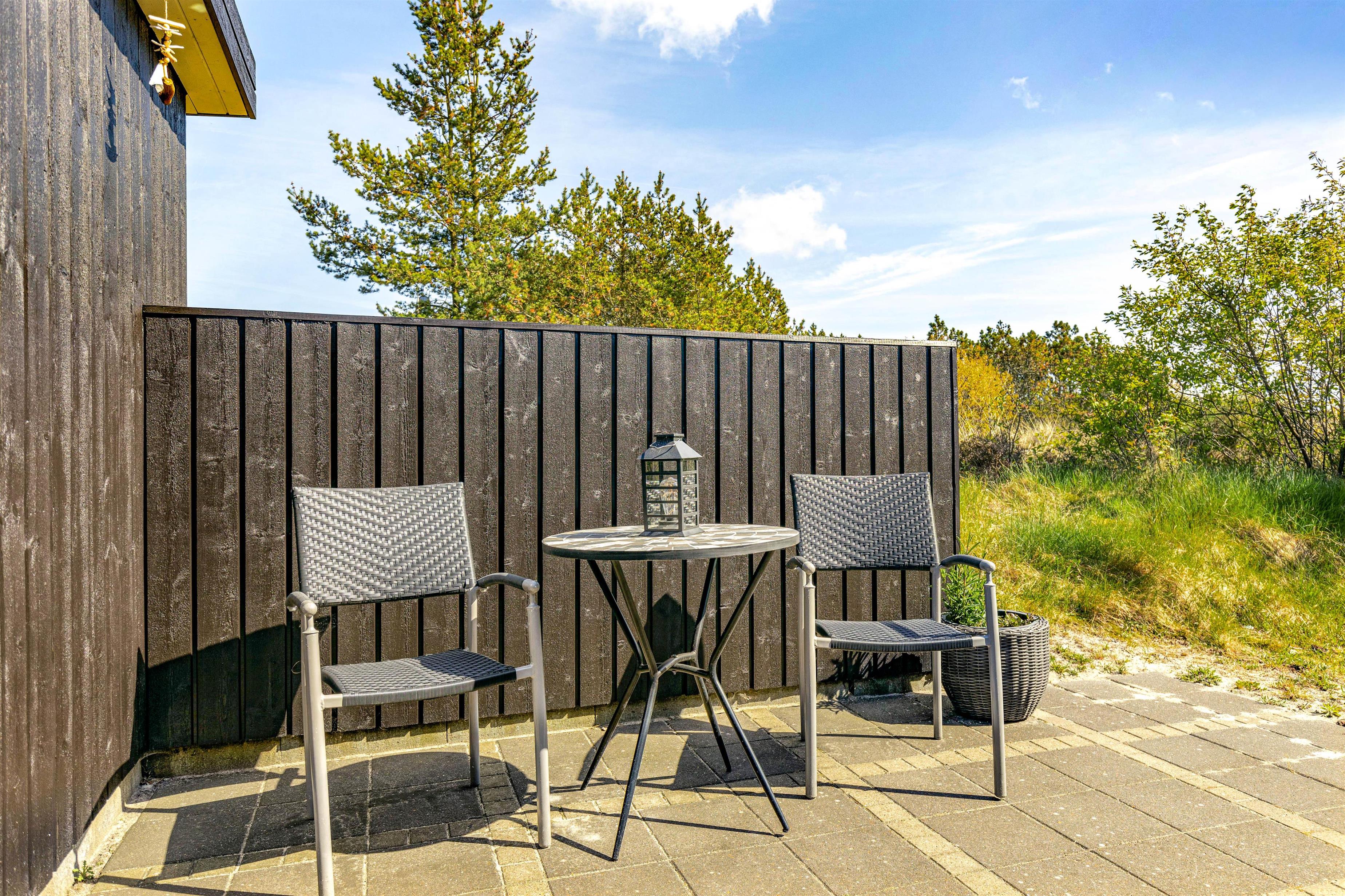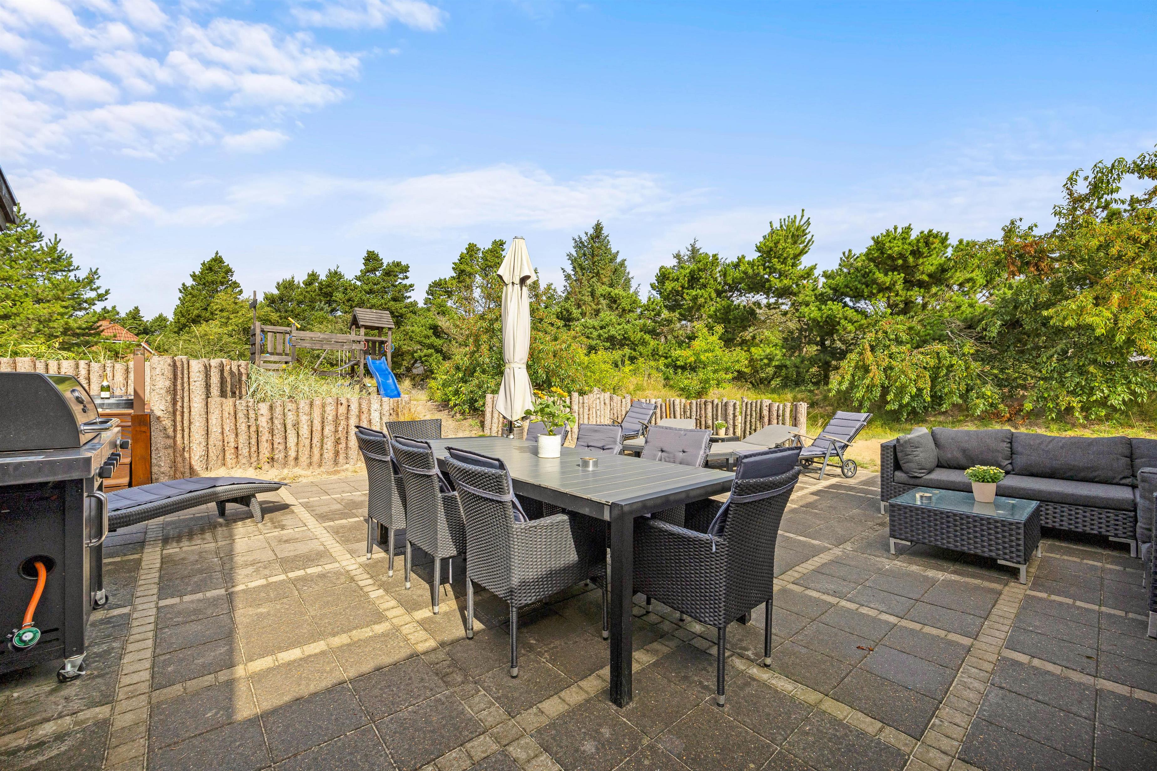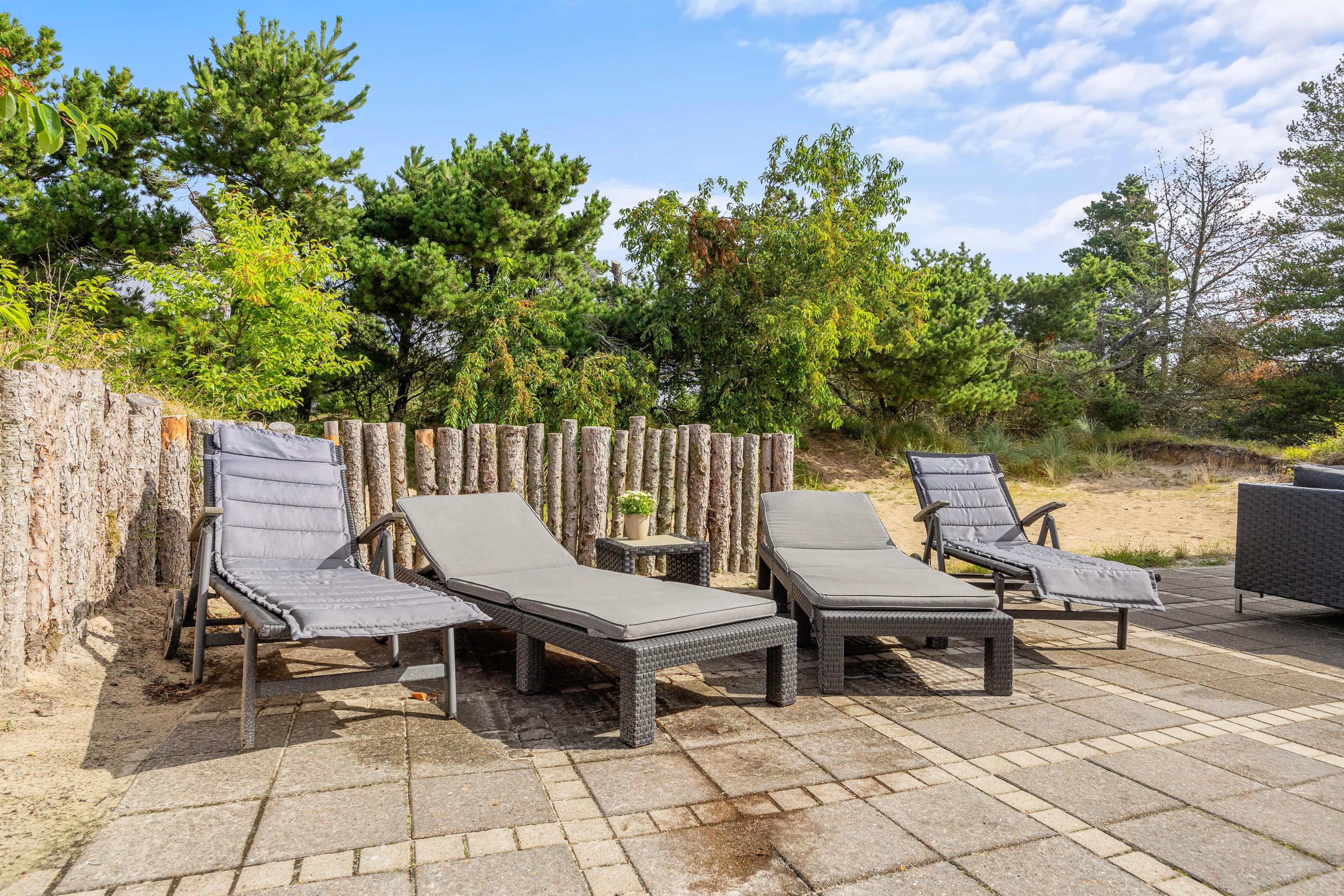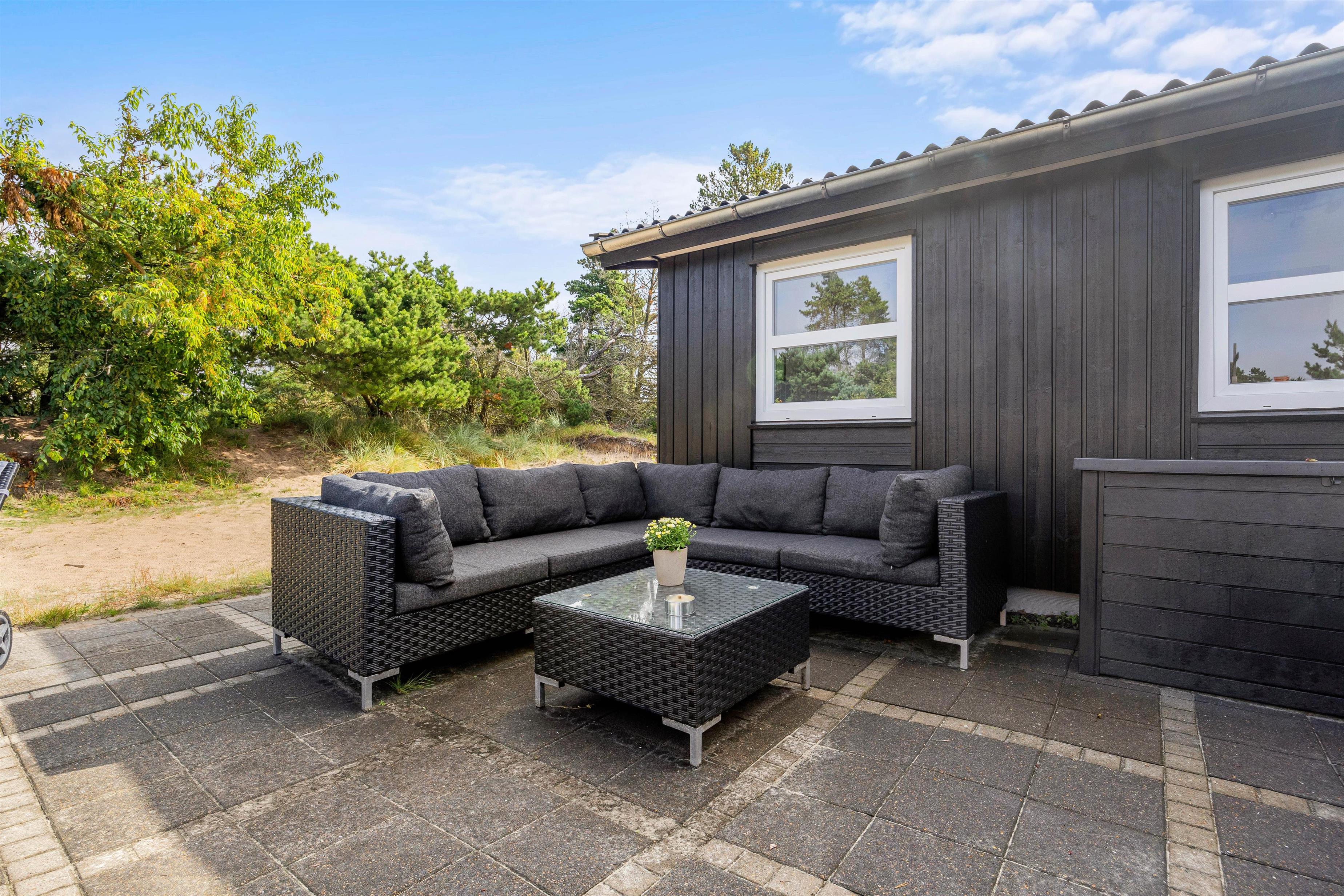 Når I træder ud på sommerhusets terrasse, venter der jer et dejligt udeområde, hvor der er noget for både store og små. På den åbne terrasse er der havemøbler og liggestole, som de voksne kan sætte sig til rette i og slappe af i den friske luft.
