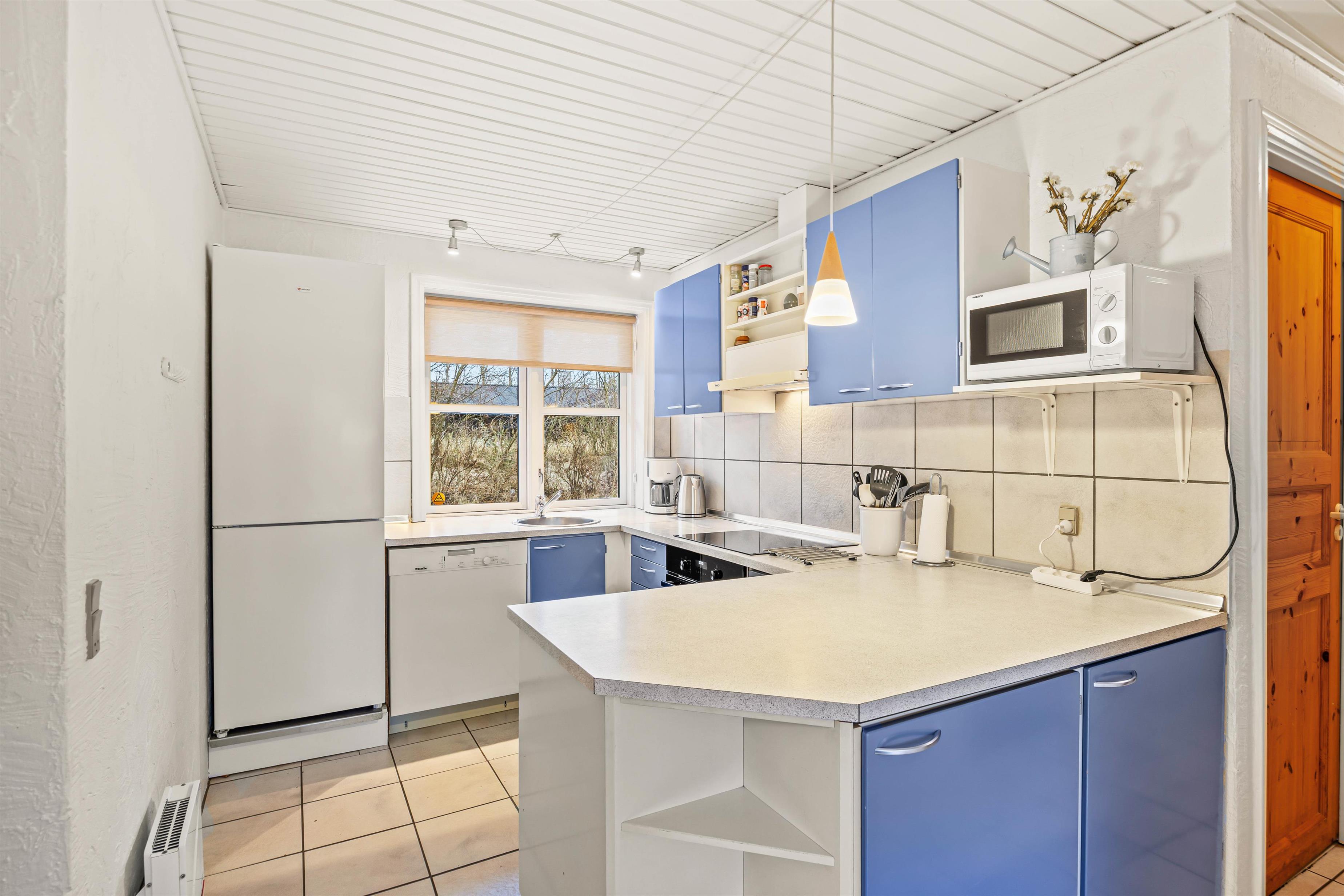 Køkken, stue og spiseplads ligger i åben forbindelse i hjertet af huset, og alrummet indbyder til hyggelige feriestunder med madlavning, spil og film. Brændeovnen sørger for god feriestemning, mens varmepumpen sørger for et behageligt indeklima uanset årstiden.