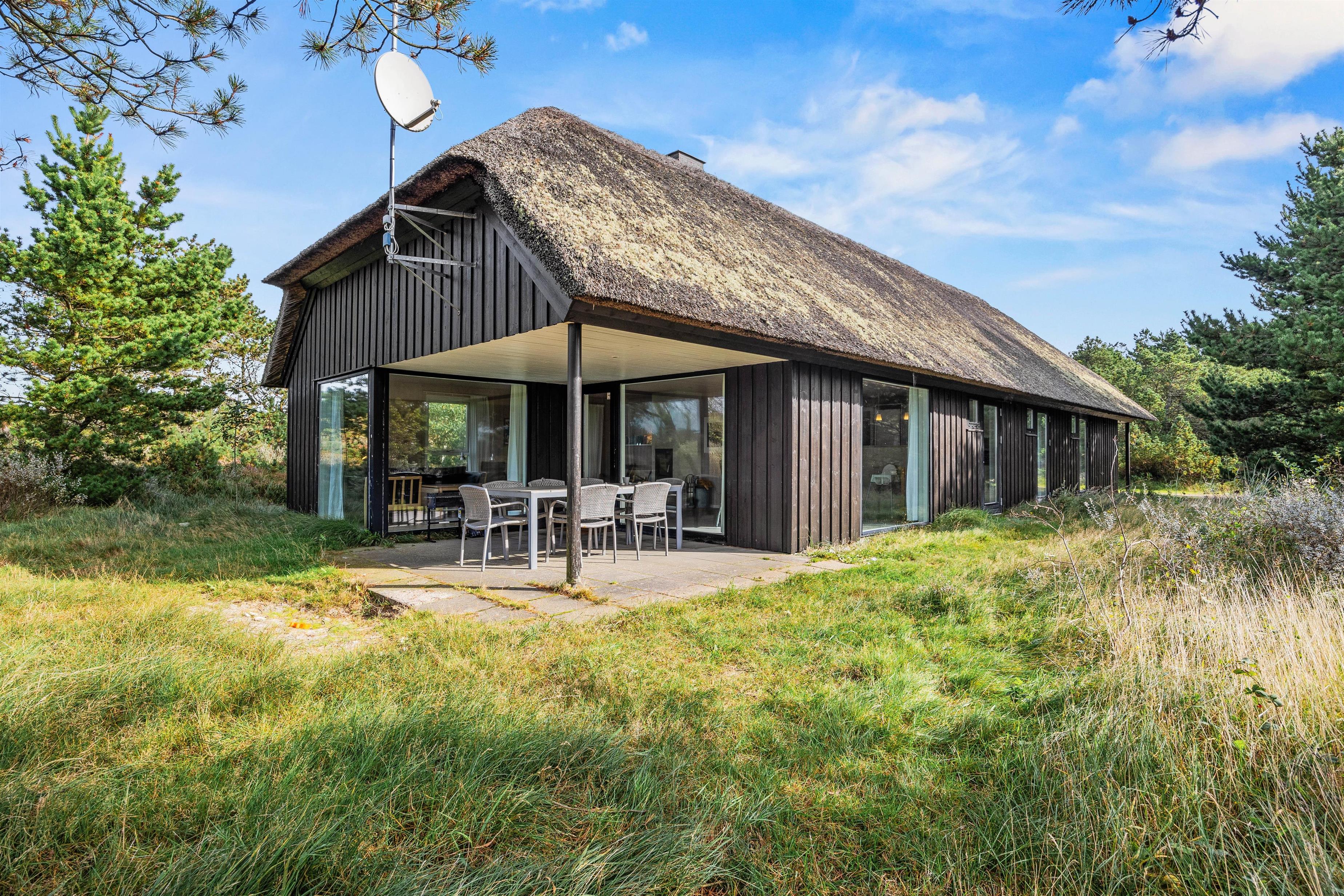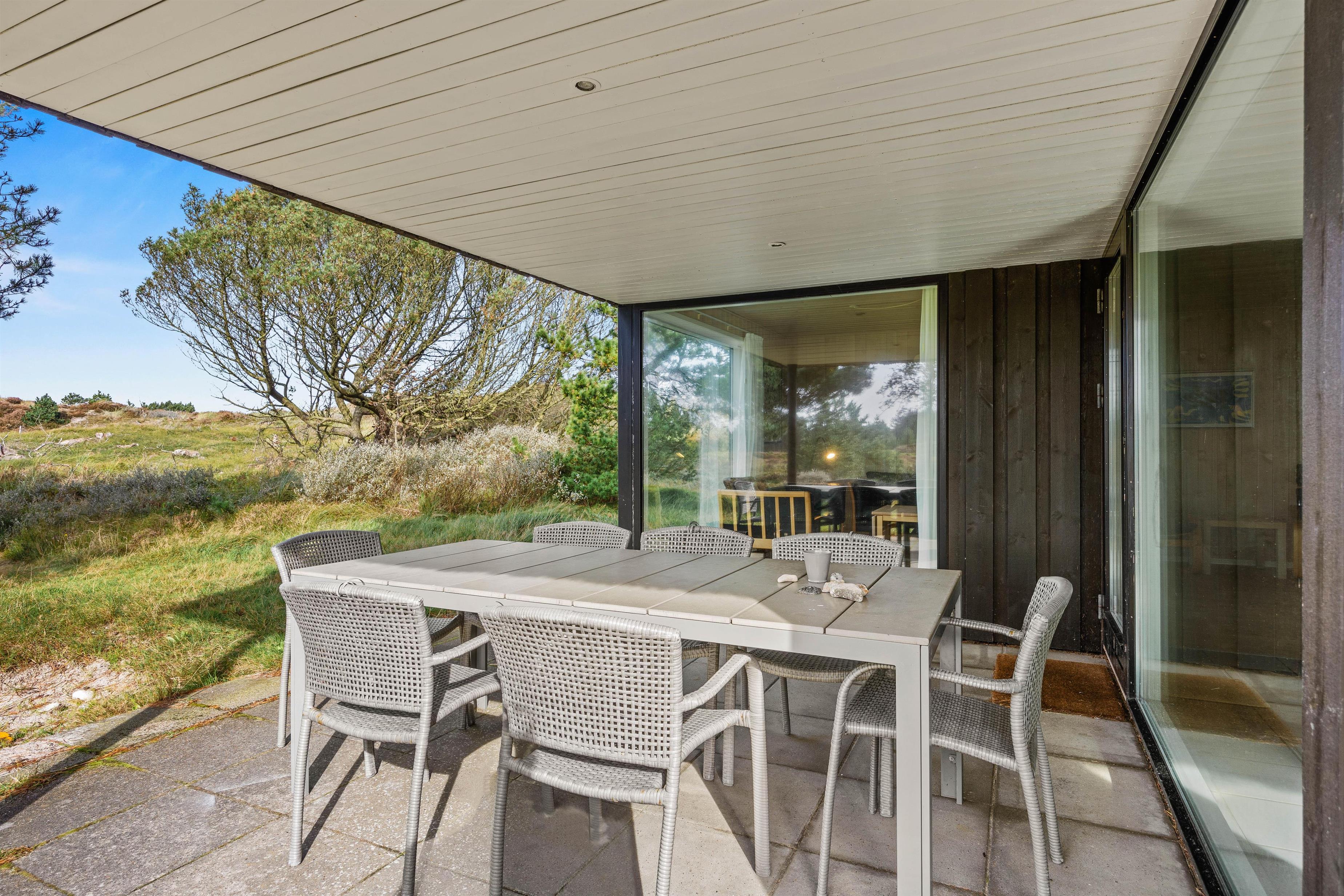 Både de åbne og overdækkede terrasser rundt om huset på klitgrunden byder på perfekte steder til at trække den friske havluft helt ned i lungerne. Her kan I nyde sommeraftener med lækker grillmad, da både en kulgrill og behagelige havemøbler står klar til jer – den ene terrasse sågar lige udenfor køkken/alrummet – og den store grund inviterer til at bruge tid udendørs i al naturens pragt.