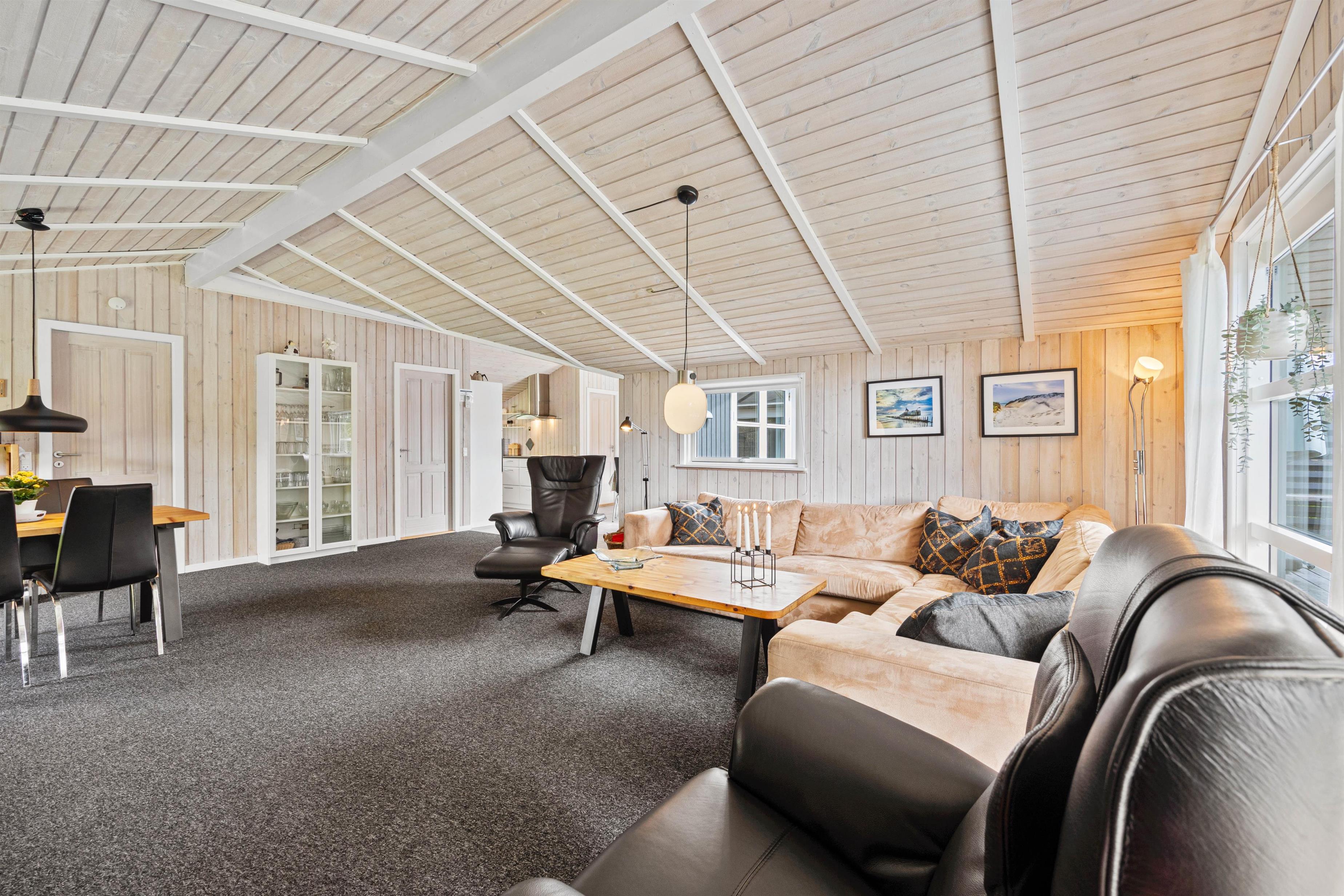 Den store stue har en stor hjørnesofa, der lokker til afslapning foran fjernsynet og brændeovnen og der er desuden plads til et ekstra bord, hvor der kan spilles spil eller lægges puslespil, der ikke behøver blive ryddet af til spisetid.