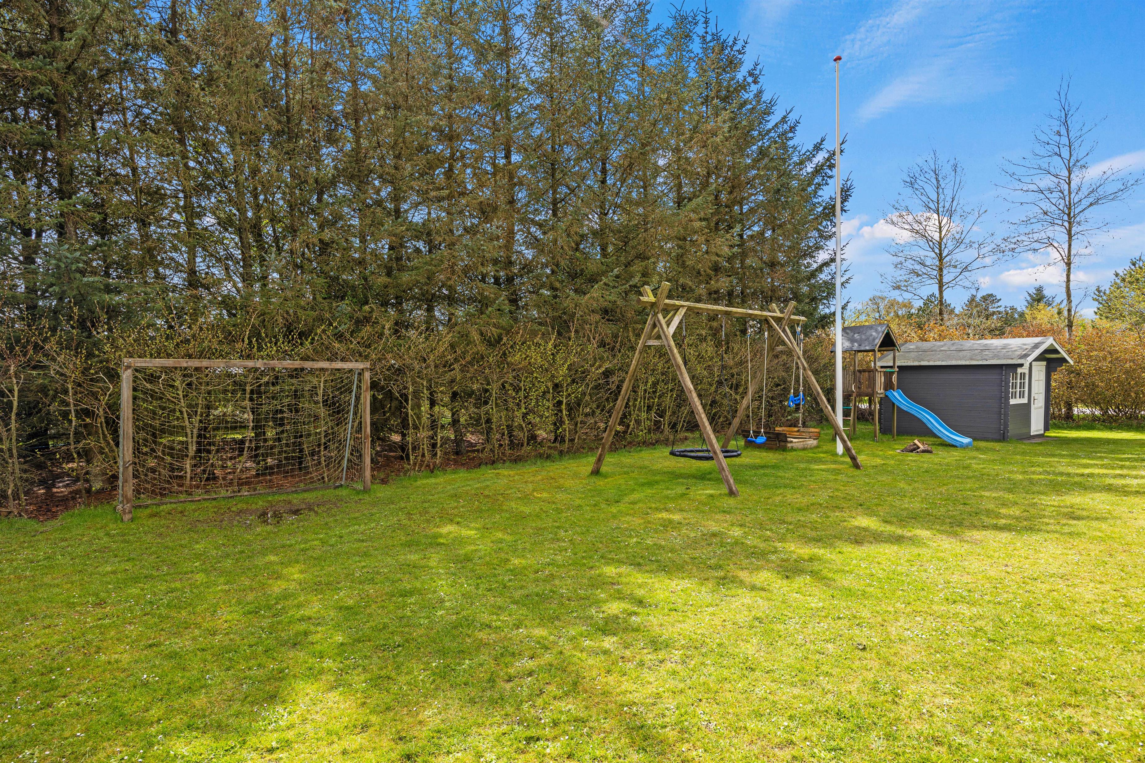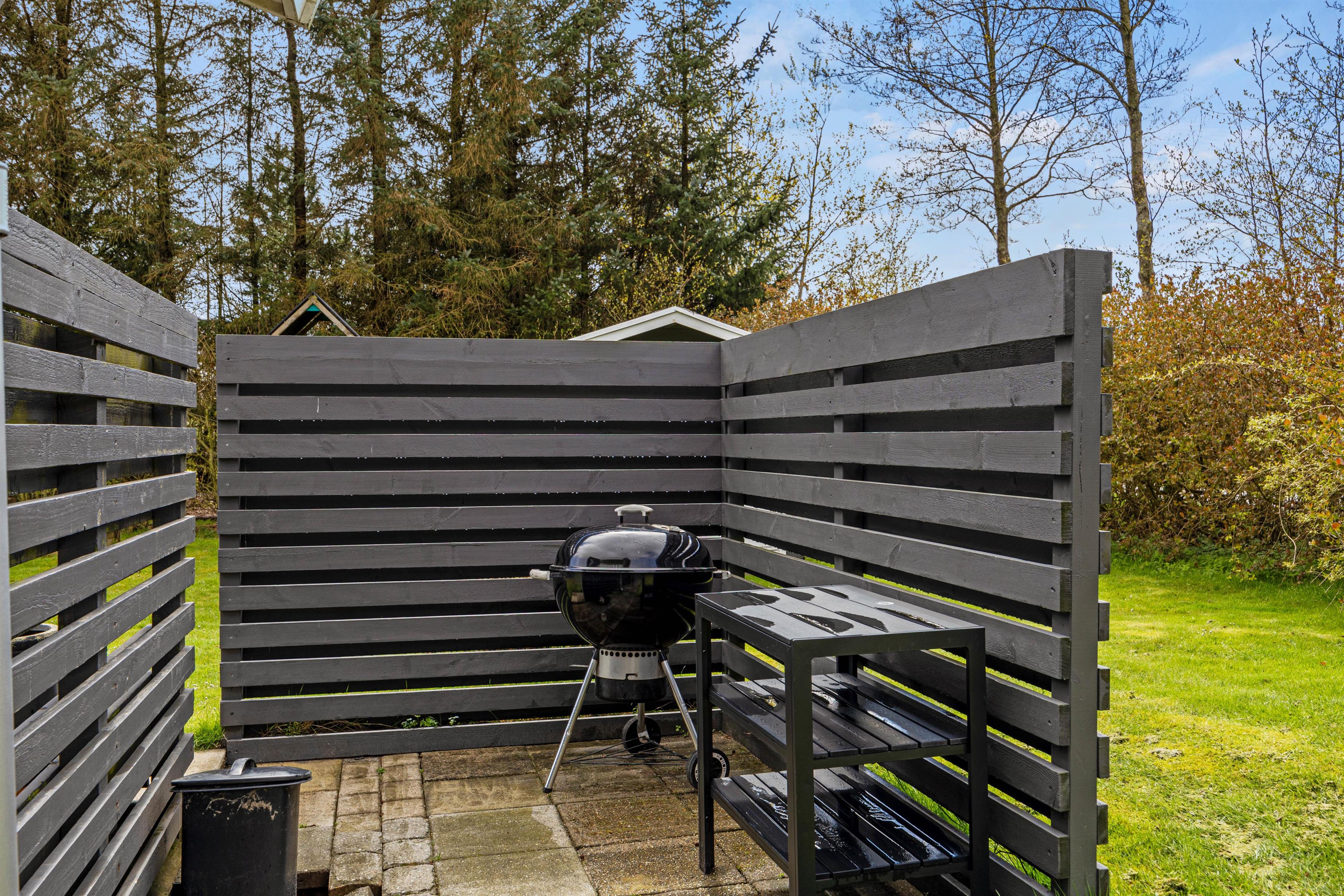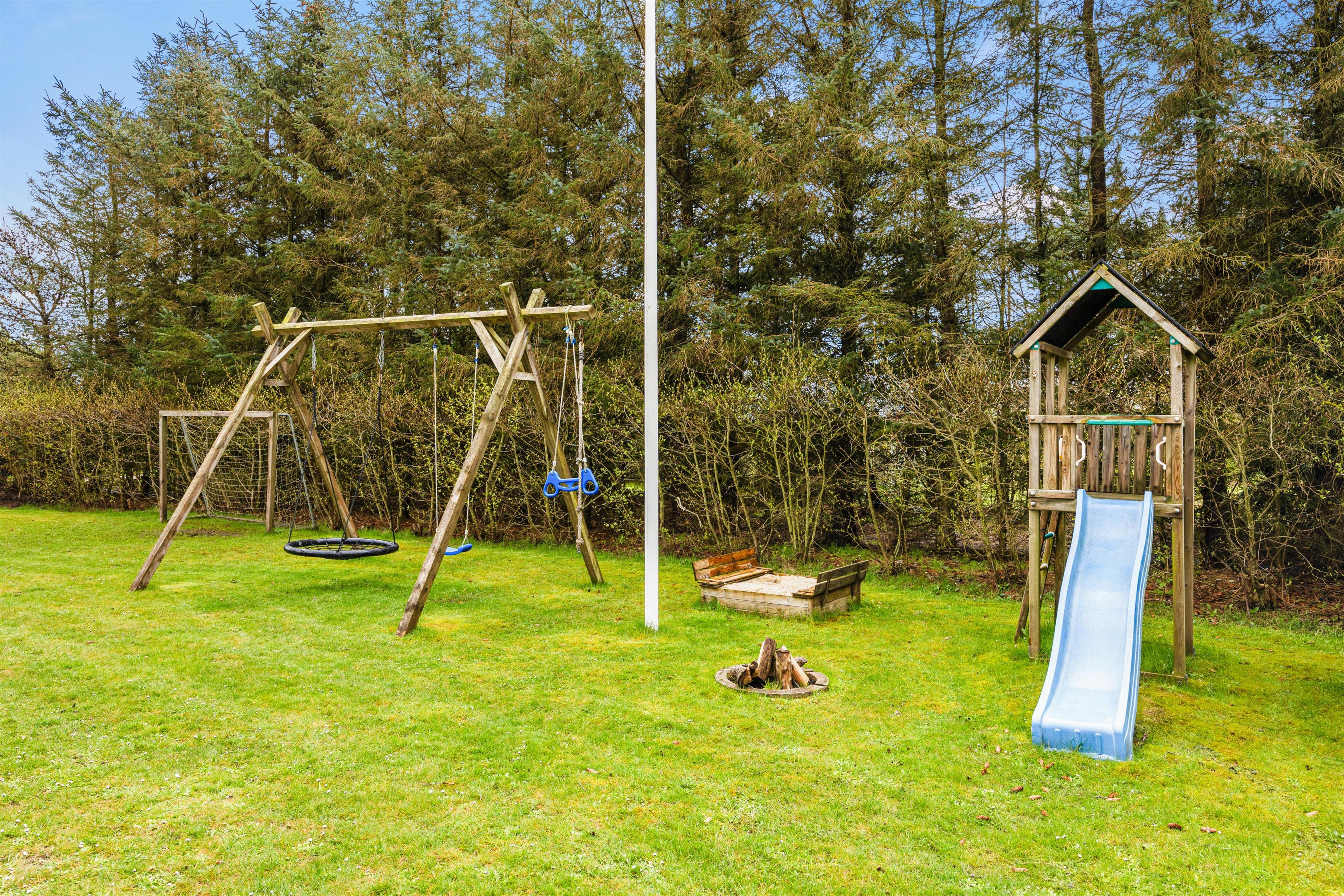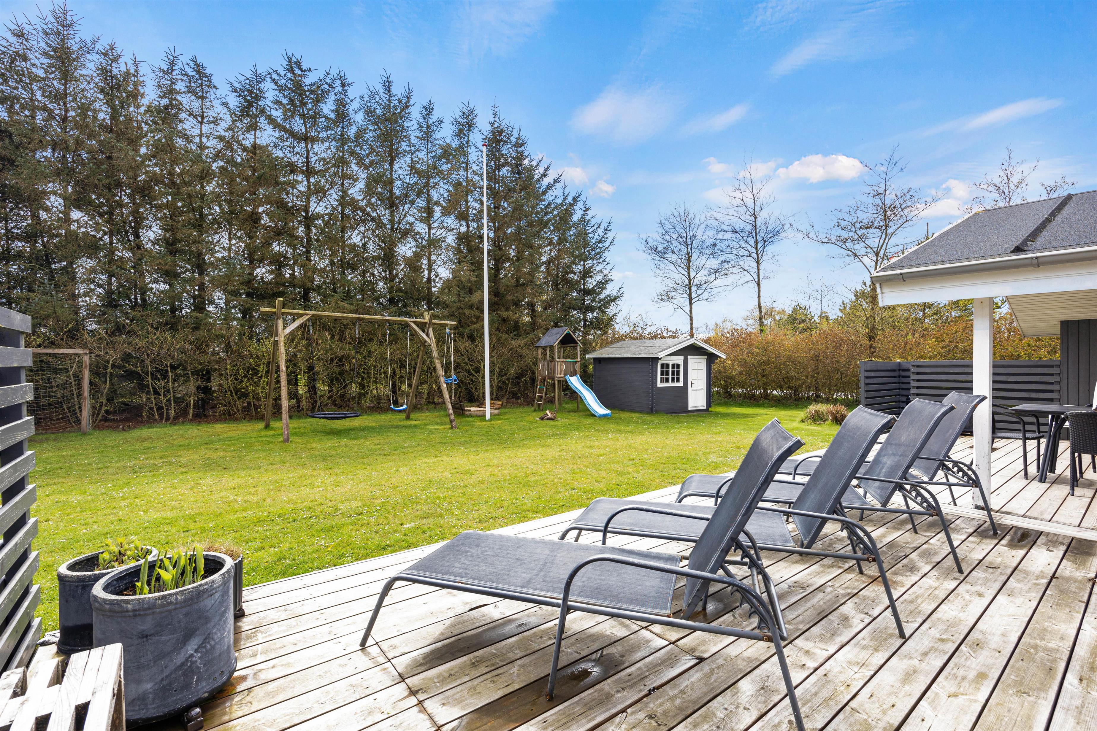 Den flotte græsplæne lokker til udendørs spil og leg i sandkassen eller legestativet. Når der skal holdes pause, er der masser af plads på den store terrasse, hvor der både mulighed for at finde læ og skygge og nyde livet i solen hele dagen.