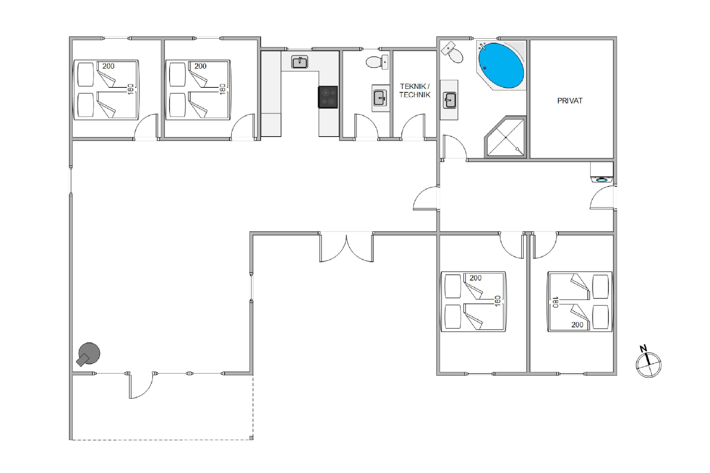 Der er i alt 4 soveværelser, alle udstyret med dobbeltsenge og skabe - og 2 af værelserne har desuden plads til en barneseng. Der er også et dejligt stort badeværelse med en 2-personers spa og ved siden af et ekstra gæstetoilet – begge med gulvvarme. Feriehuset er desuden udstyret med en energibesparende varmepumpe, der sørger for at holde en behagelig temperatur.
