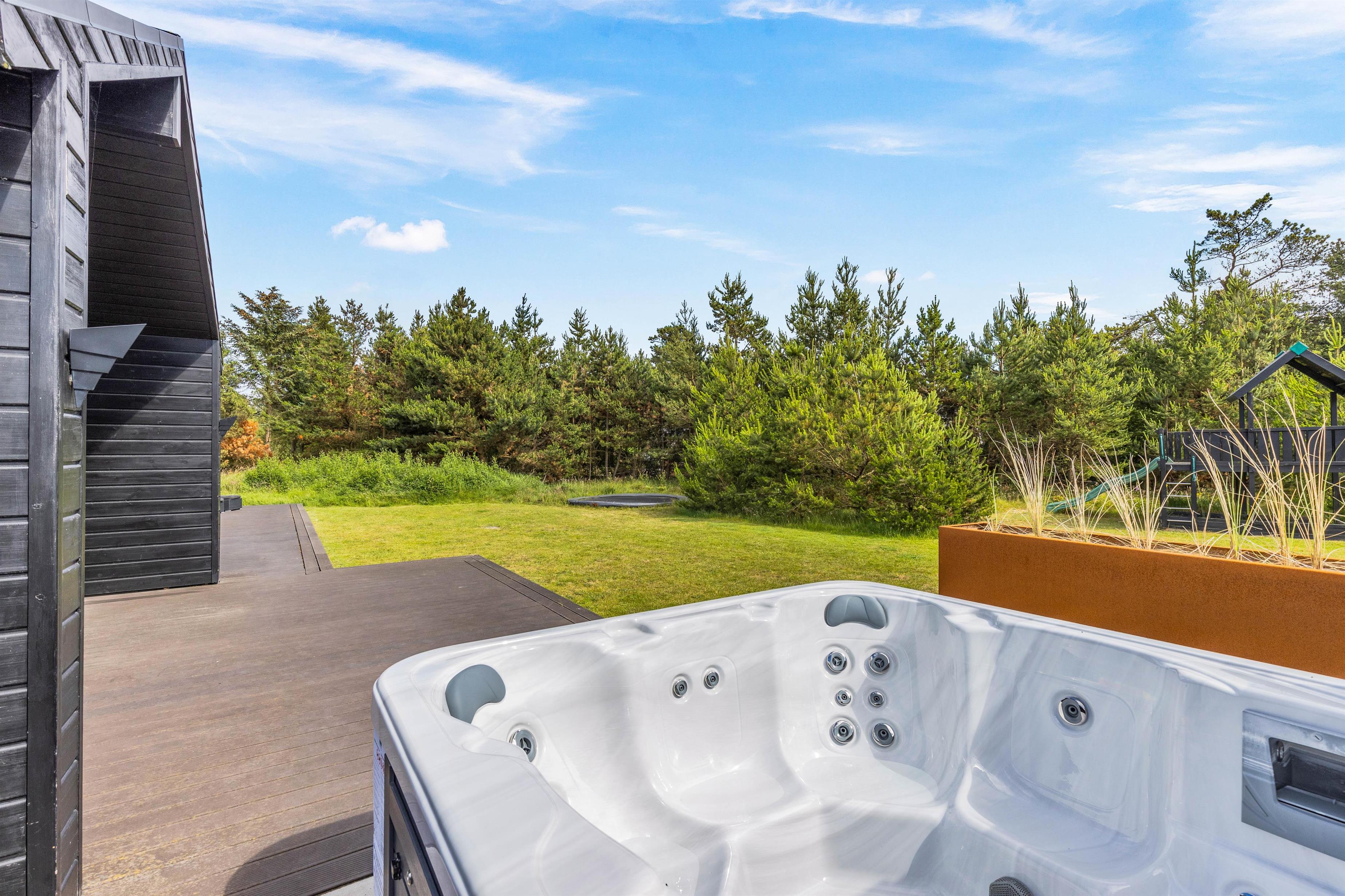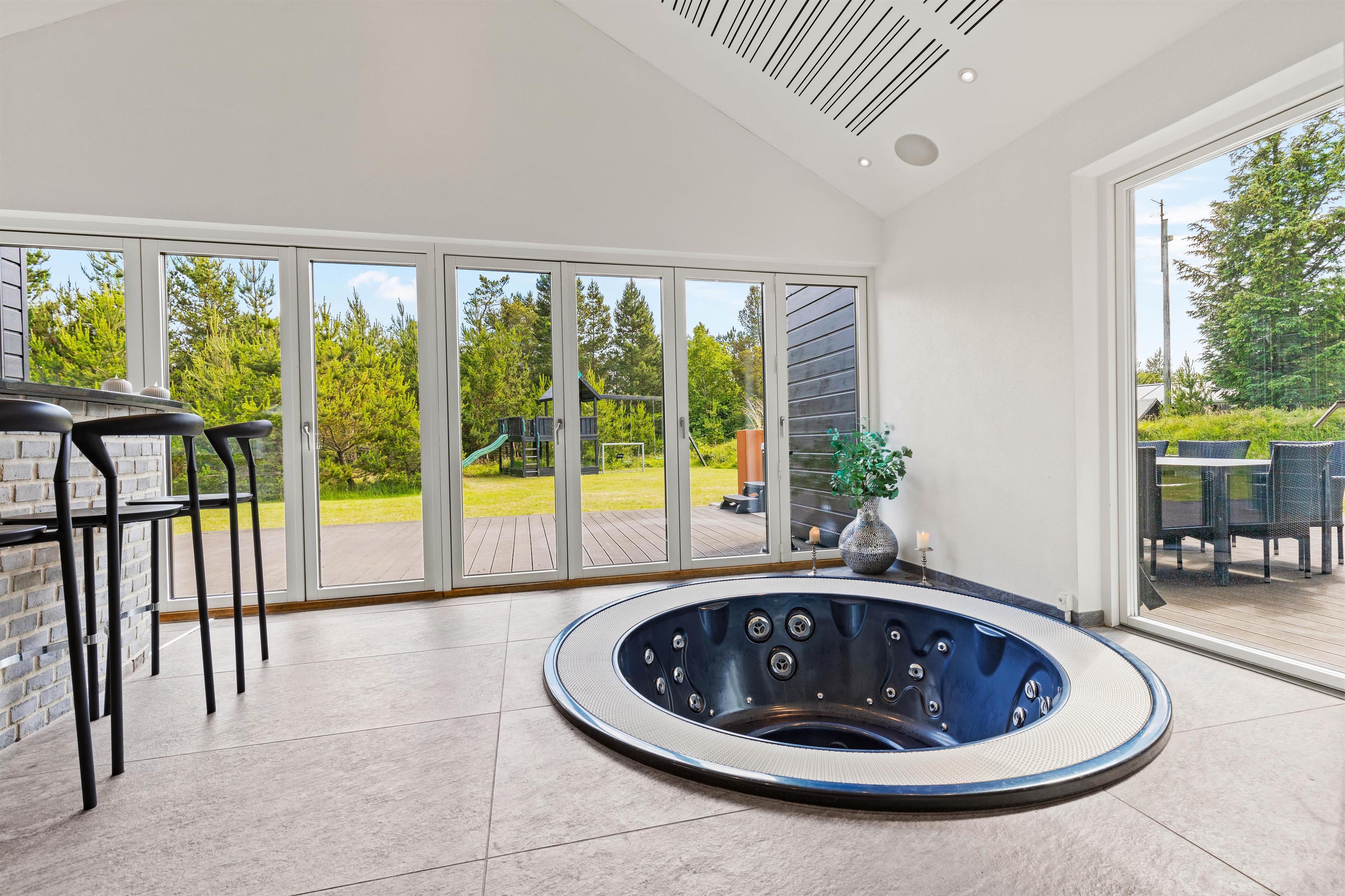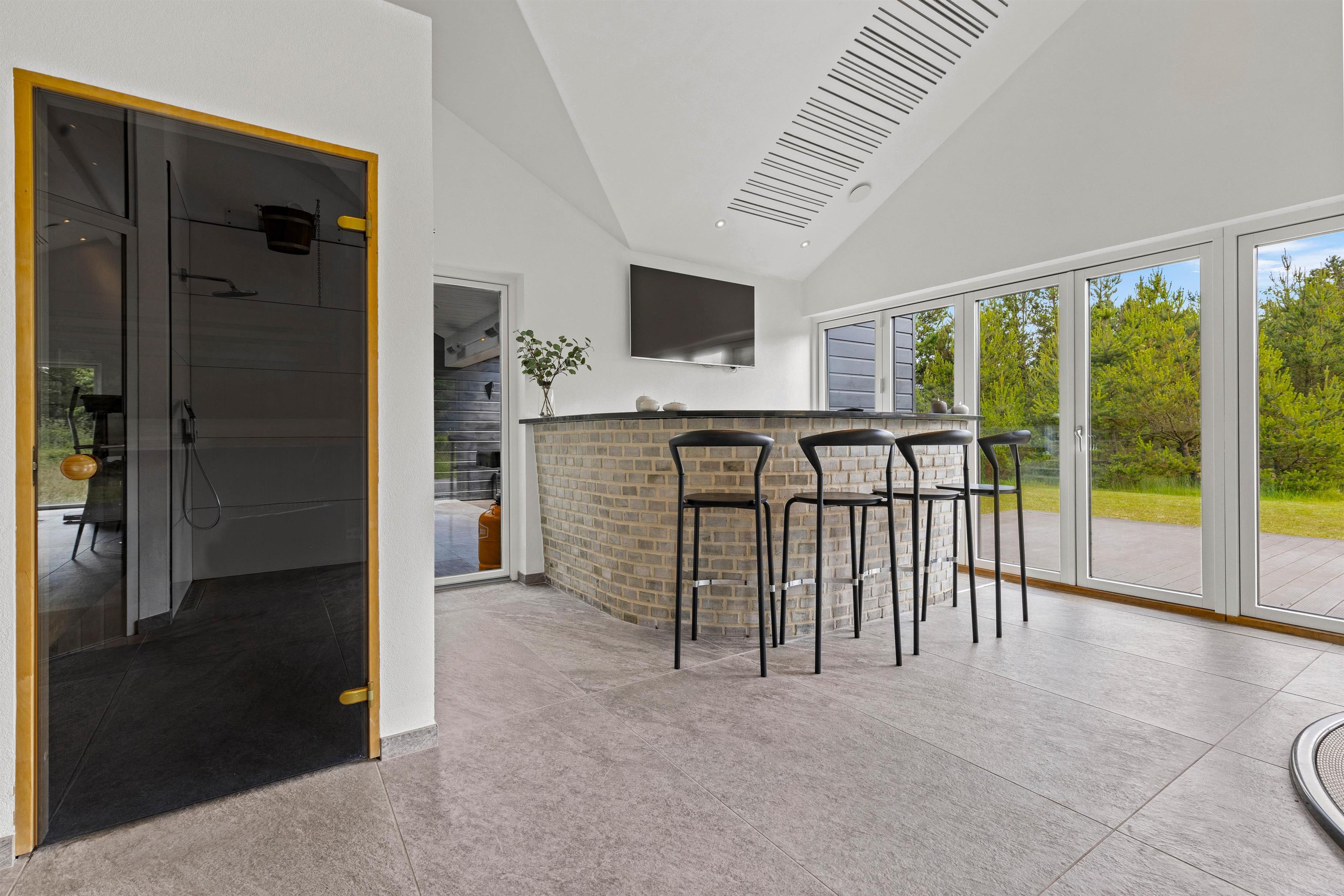 I Blåvands naturskønne ferieområde ligger dette attraktive feriehus ved Bjergbovej 9, der i den grad tikker alle bokse. Det topmoderne spahus råder ikke kun over luksuriøse faciliteter som indespa til 7 personer, udespa, sauna og dampbad - der er også sørget for noget til de aktive feriegæster med et kombineret aktivitets- og fitnessrum med Technogym udstyr. Alt inventar er topkvalitet, blandt andet med Miele-hvidevarer.