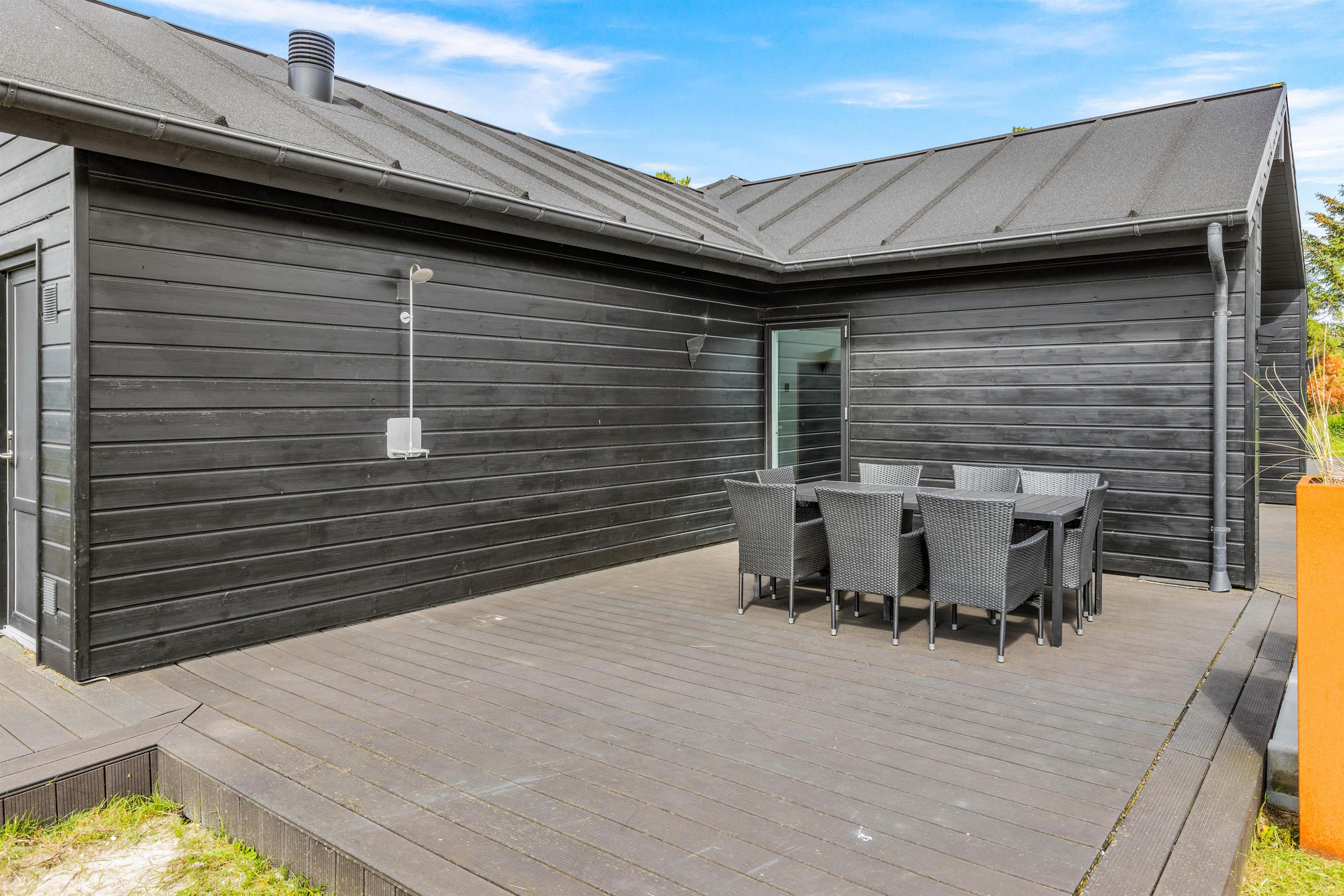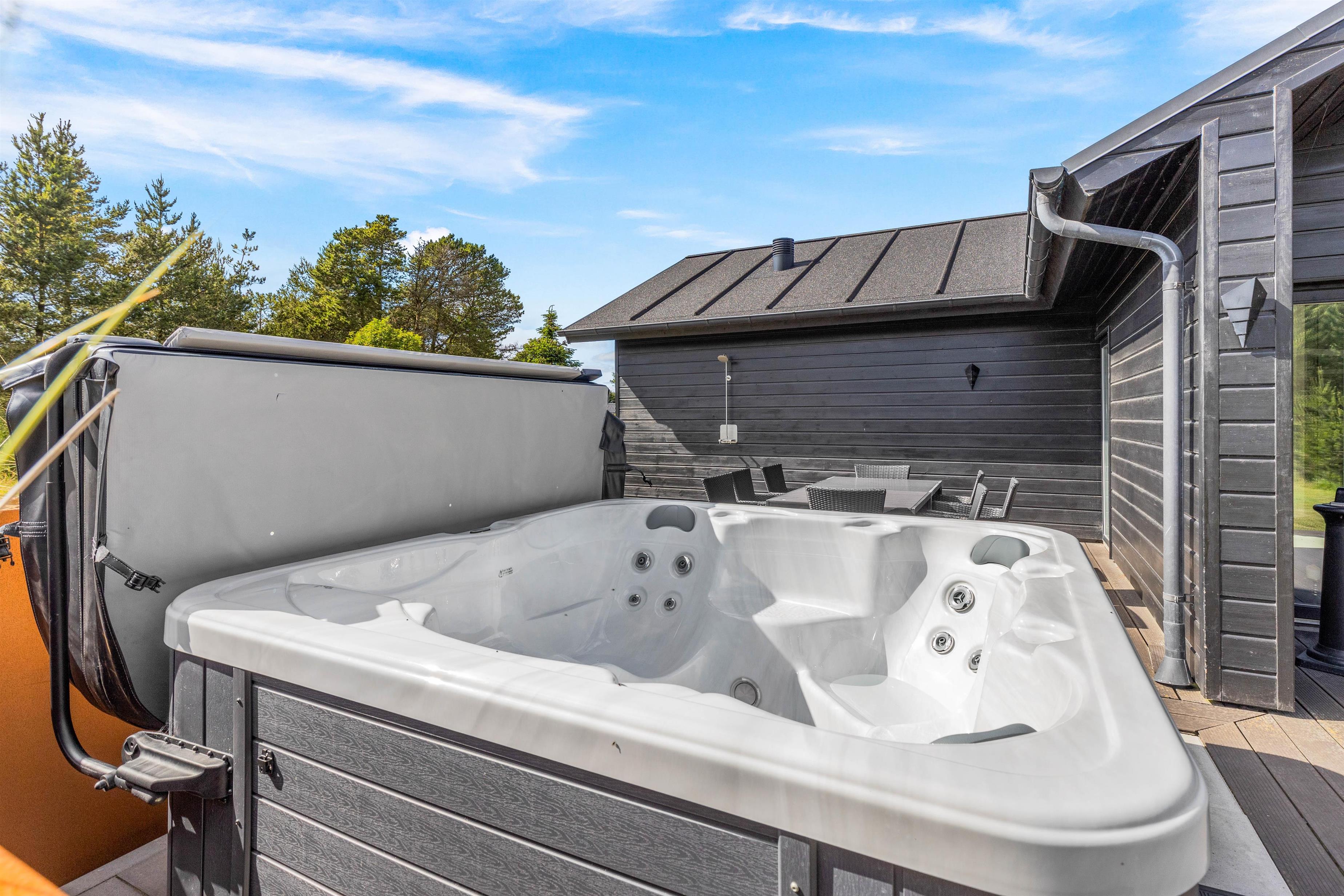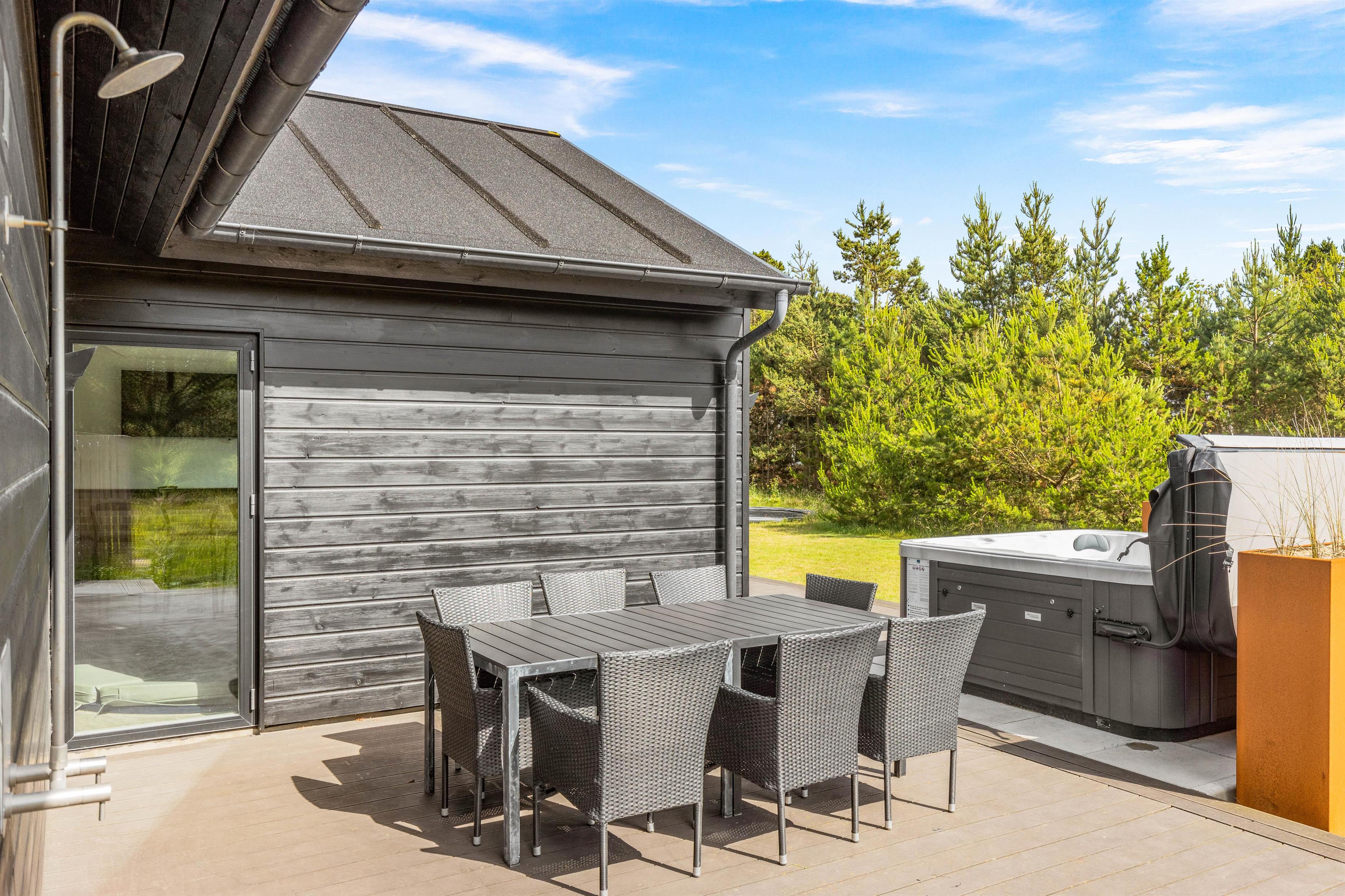 Det store feriehus råder over en tilsvarende stor terrasse, hvor der er flere fine kroge med havemøbler og liggestole. Dele af terrassen med et langt spisebord og gasgrill er tilmed overdækket så I kan nyde naturen og den friske luft selv på regnfulde dage. Som ekstra luksus er der opsat varmelamper på terrassen, så I kan nyde aftenen lidt længere. På den åbne del af terrassen kan I nyde et bad i udendørsspaen og se på stjerner en klar aften. Udebruseren kan benyttes fra 1. april til 31. oktober.