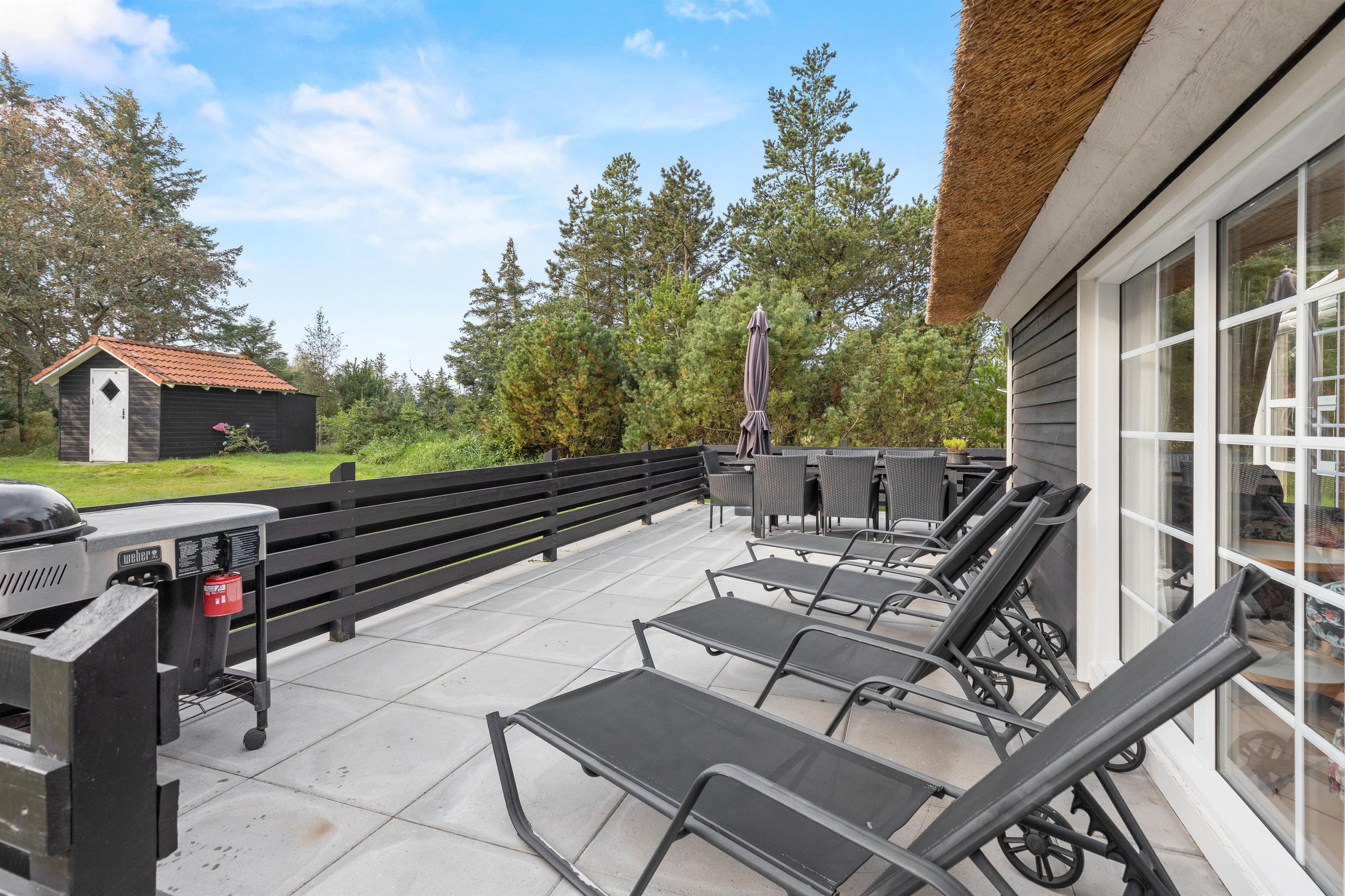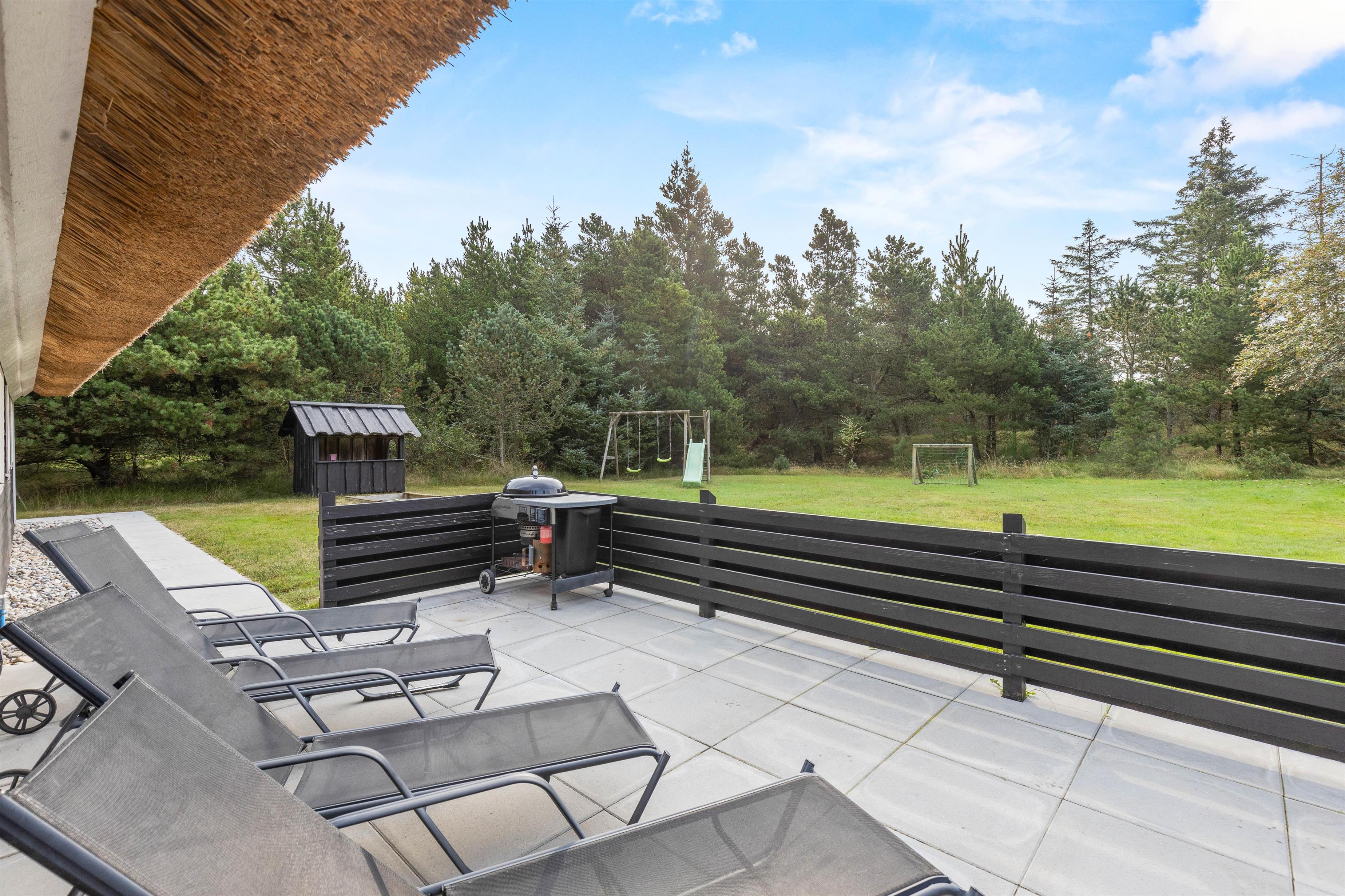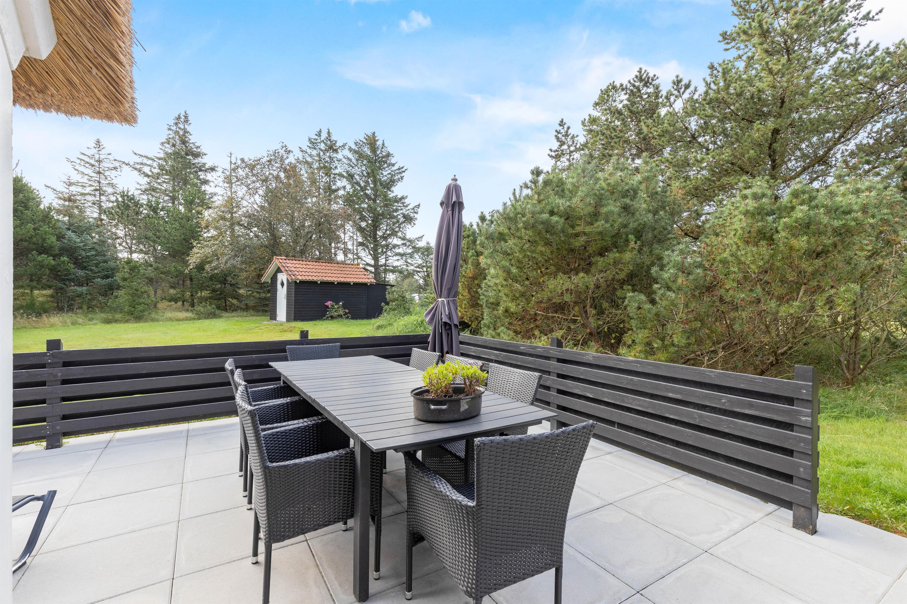 Ved ferieboligen er et rigtig skønt uderum med masser af plads til at nyde det gode vejr. På den delvist afskærmede terrasse kan I sætte jer til rette med en god bog eller et koldt glas rosévin ligesom aftensmåltidet fra grillen kan nydes, mens aftenen falder på.