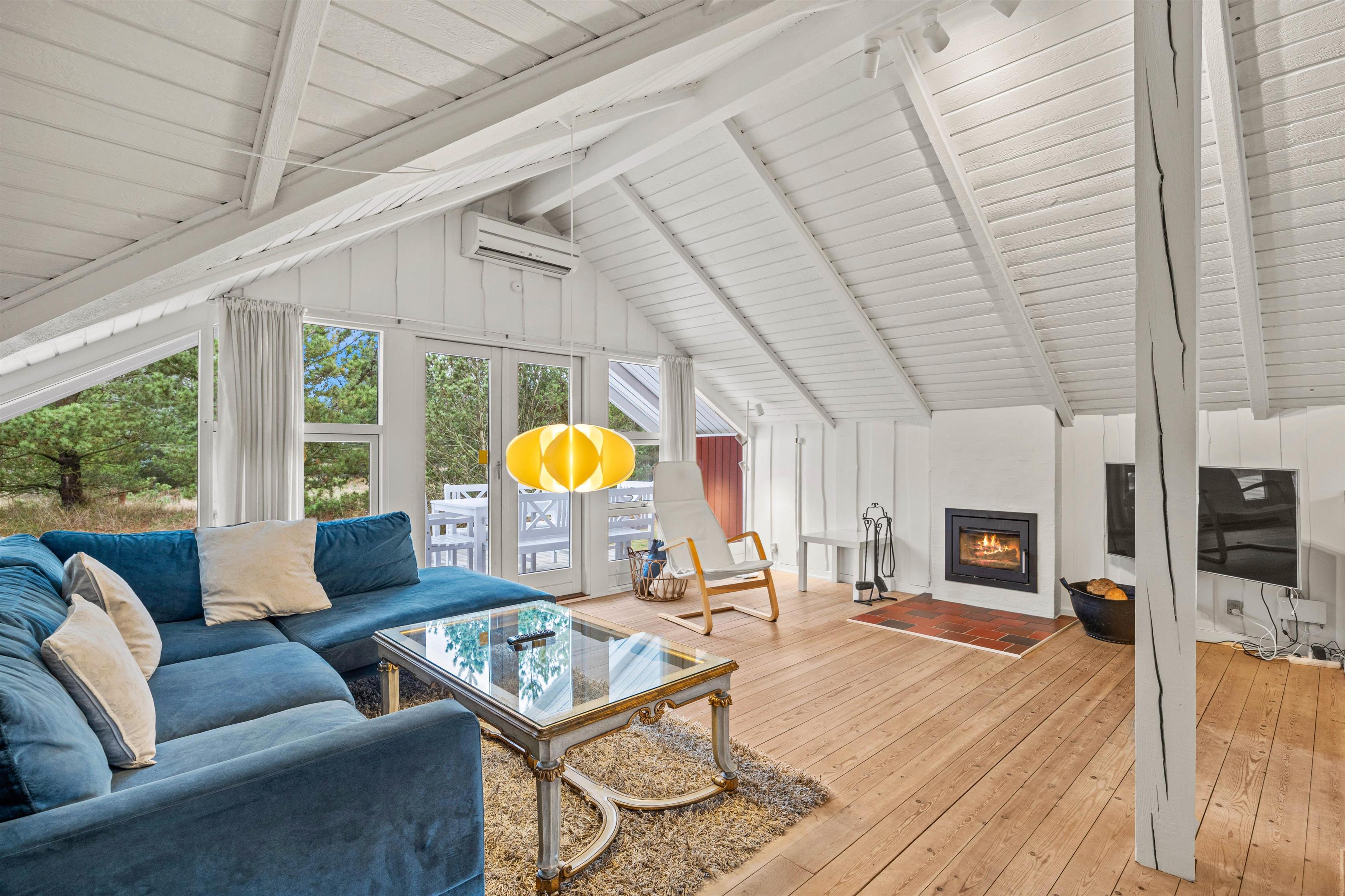 Det hyggelige traditionelle feriehus er indrettet med komfortable møbler og synlige loftbjælker. Brændeovnen inviterer på afslappende dage i sofaen med en god bog og en kop kaffe, mens ilden knitrer i baggrunden.